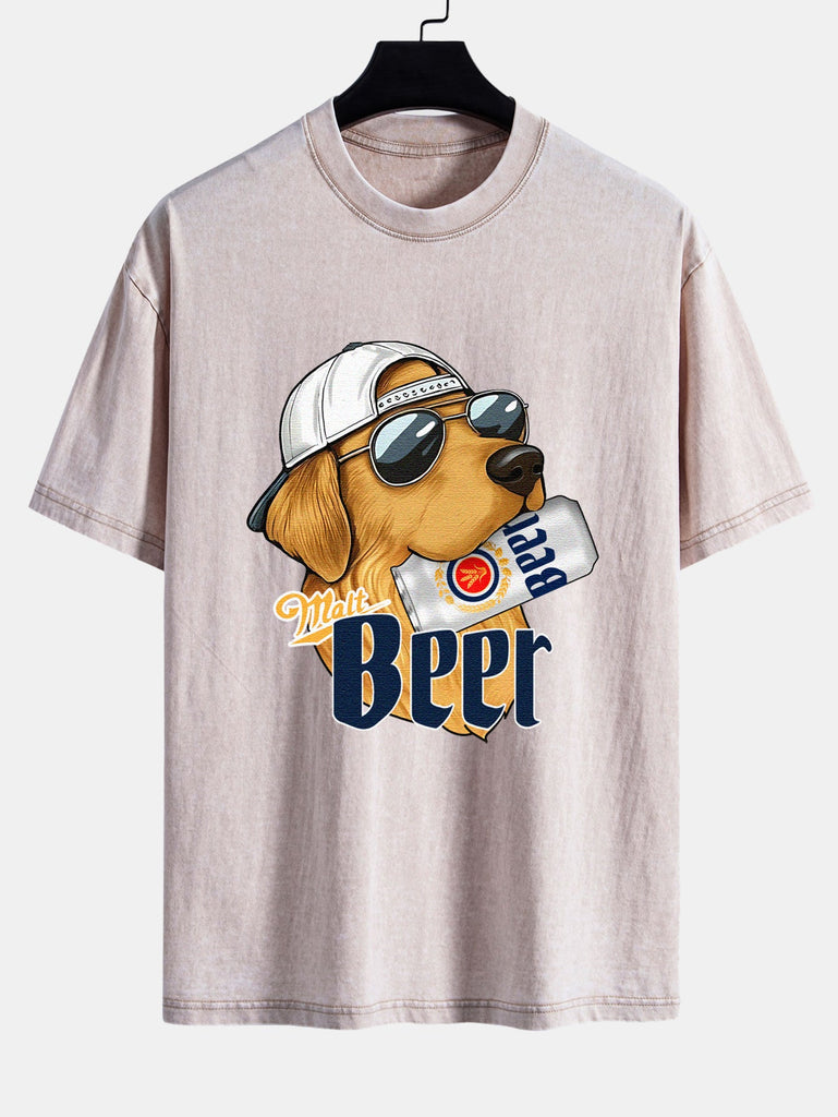 Beer Dog Print Washed Distressed Drop Shoulder T-Shirt