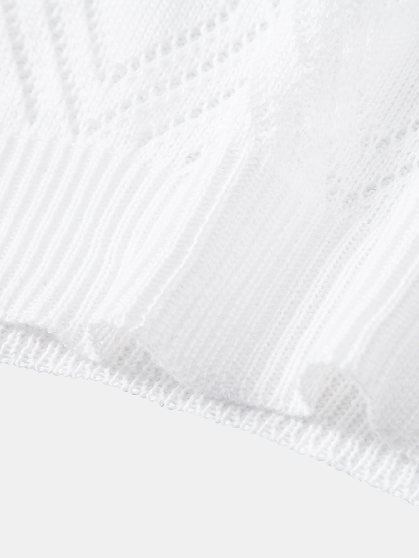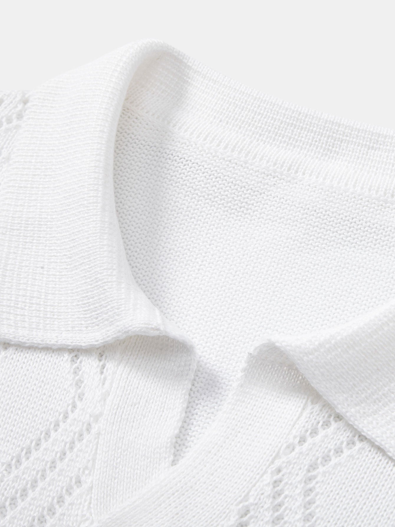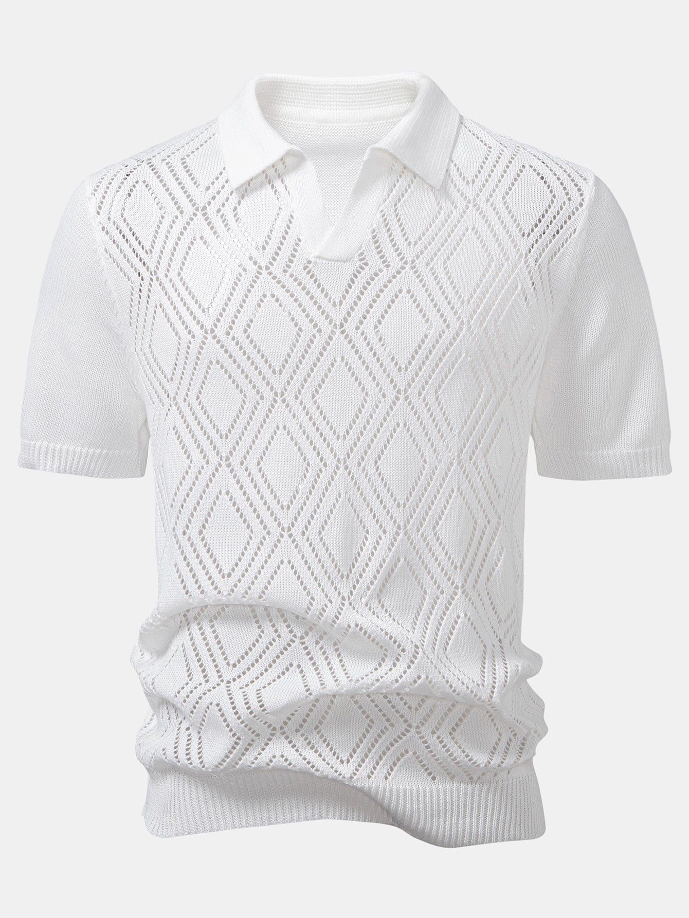 The geometric crochet V-neck polo shirt showcases a bold open-knit design, offering standout texture and ventilation for summer days. Paired with straight-leg linen pants, this look delivers relaxed sophistication with a refined silhouette¡ªperfect for vacation strolls, rooftop gatherings, or everyday style with a twist.