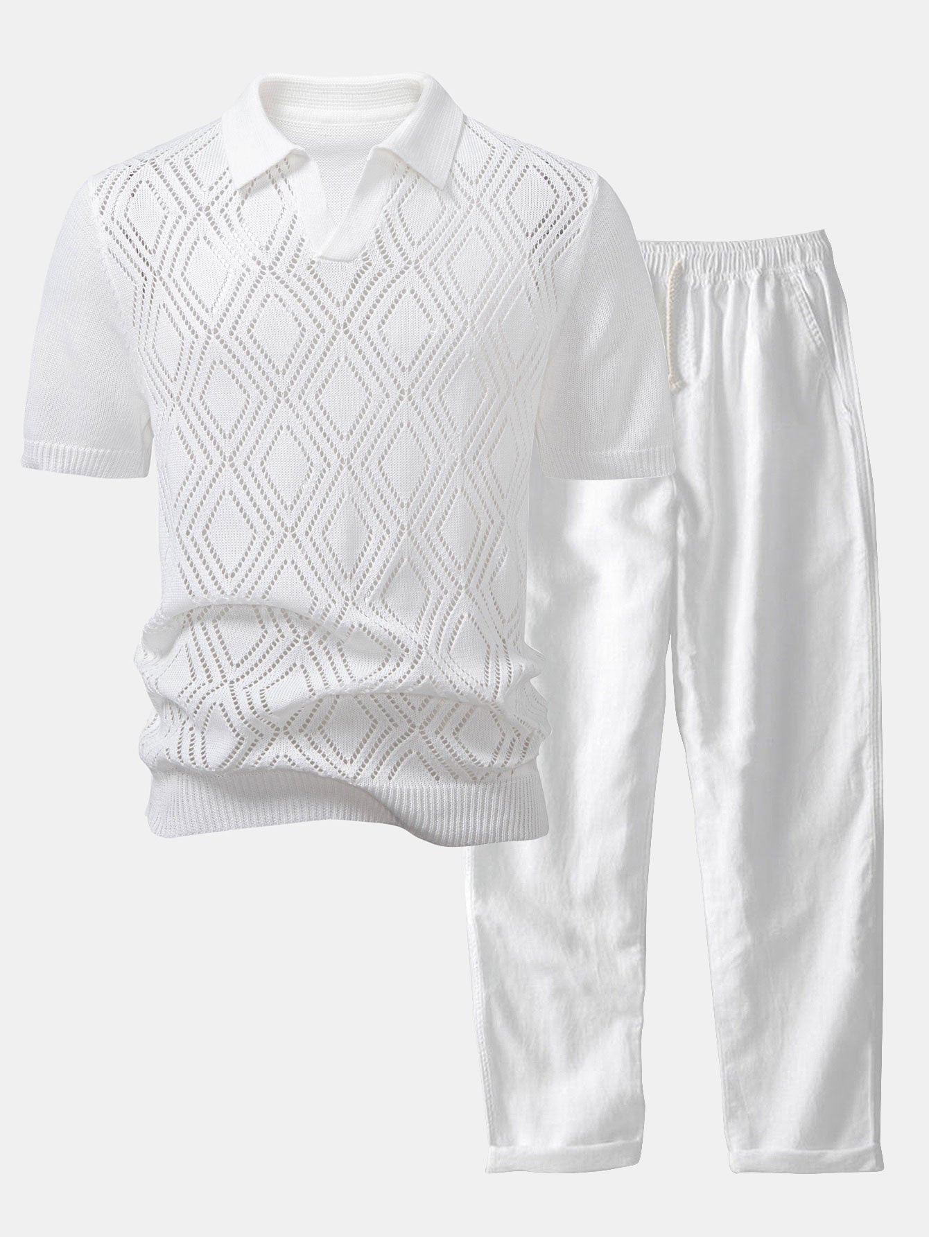Geometric Crochet V Neck Polo Shirt & Straight Leg Linen Pants