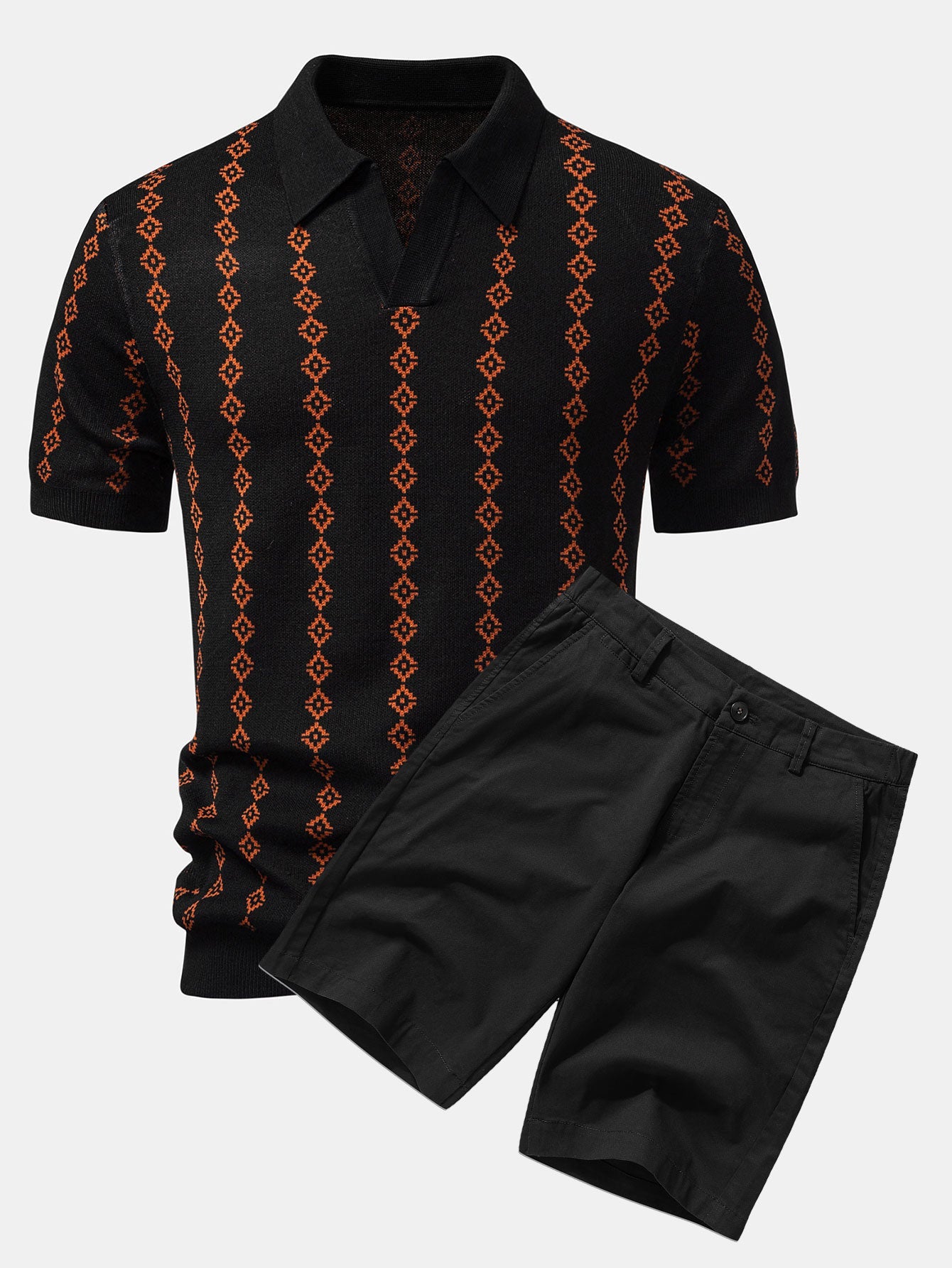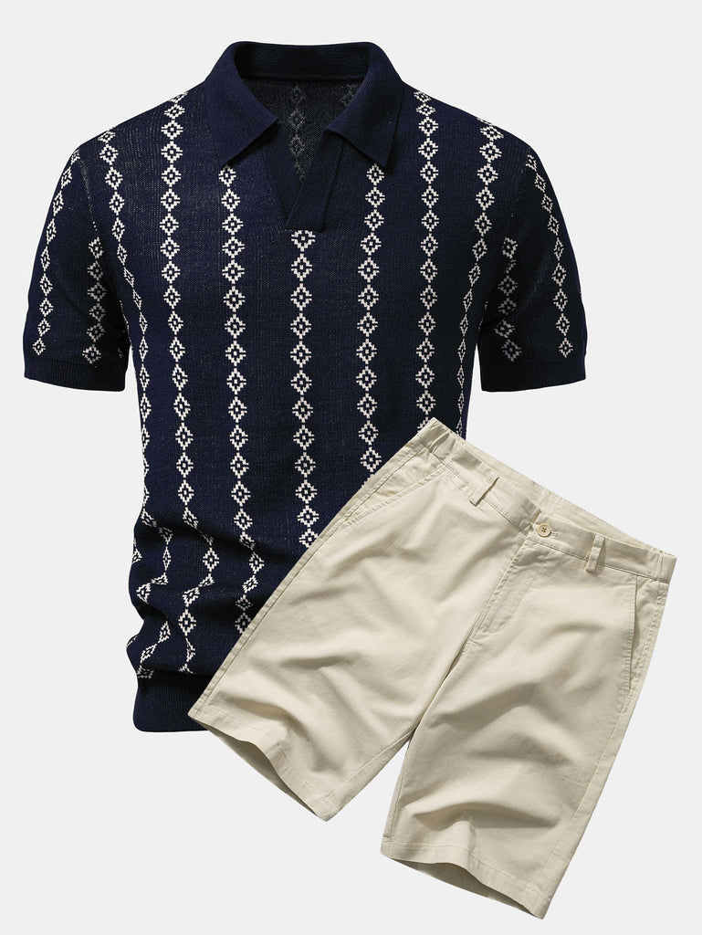 Geometric Knit V Neck Polo Shirt & Cotton Chino Shorts