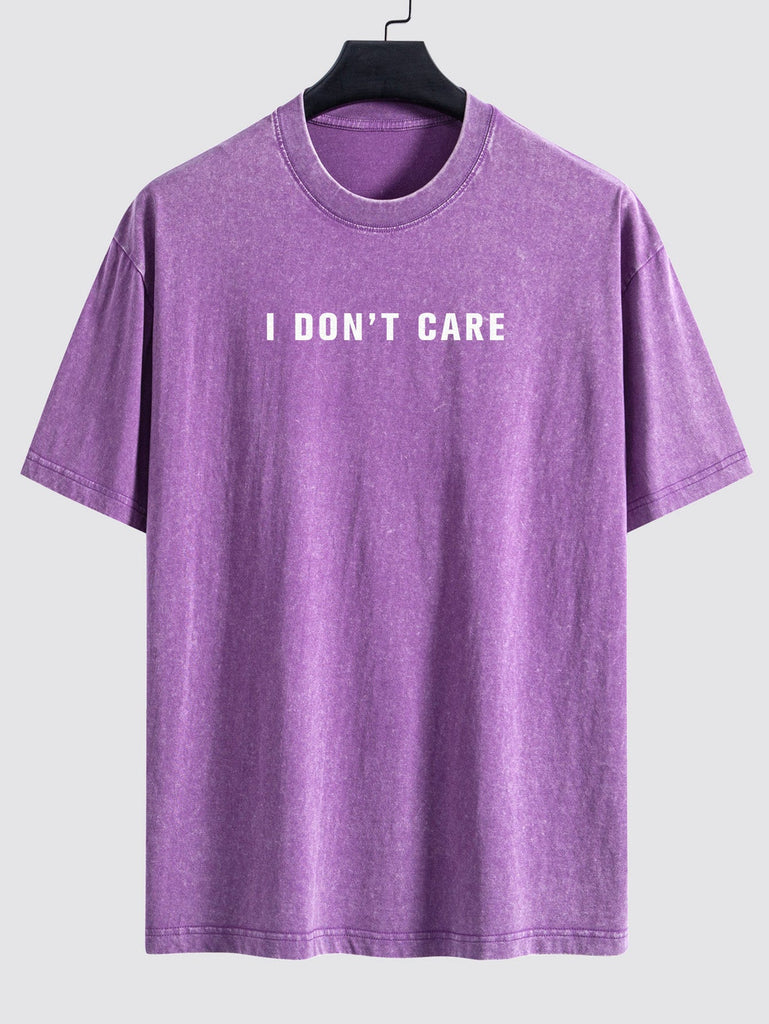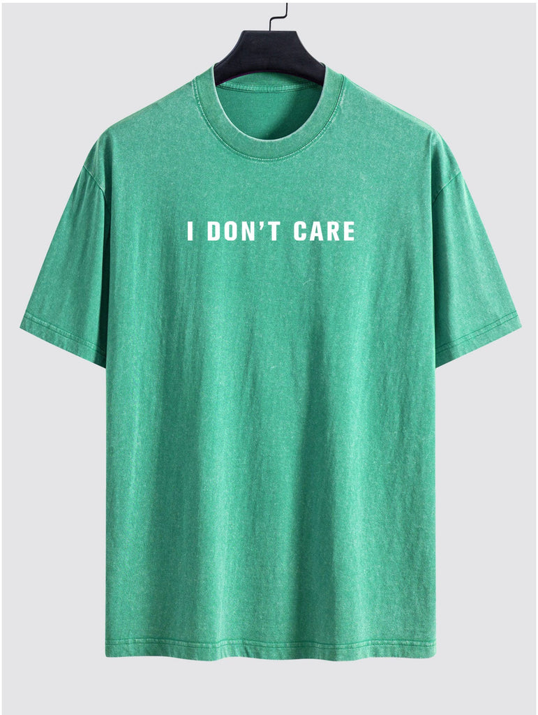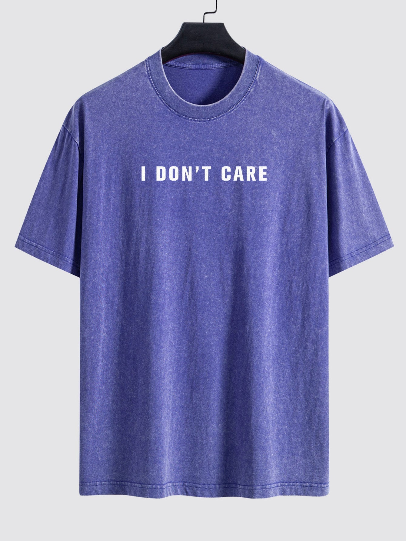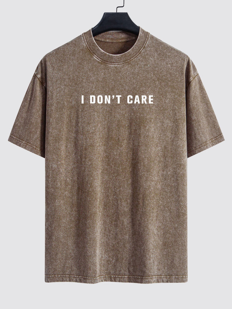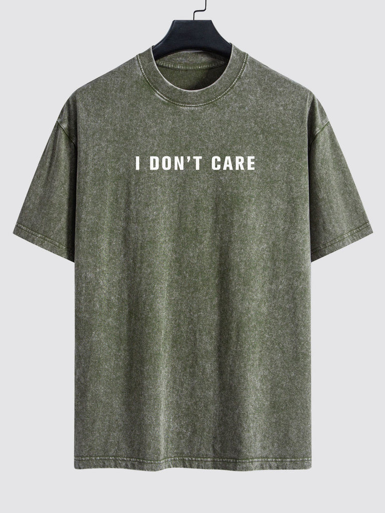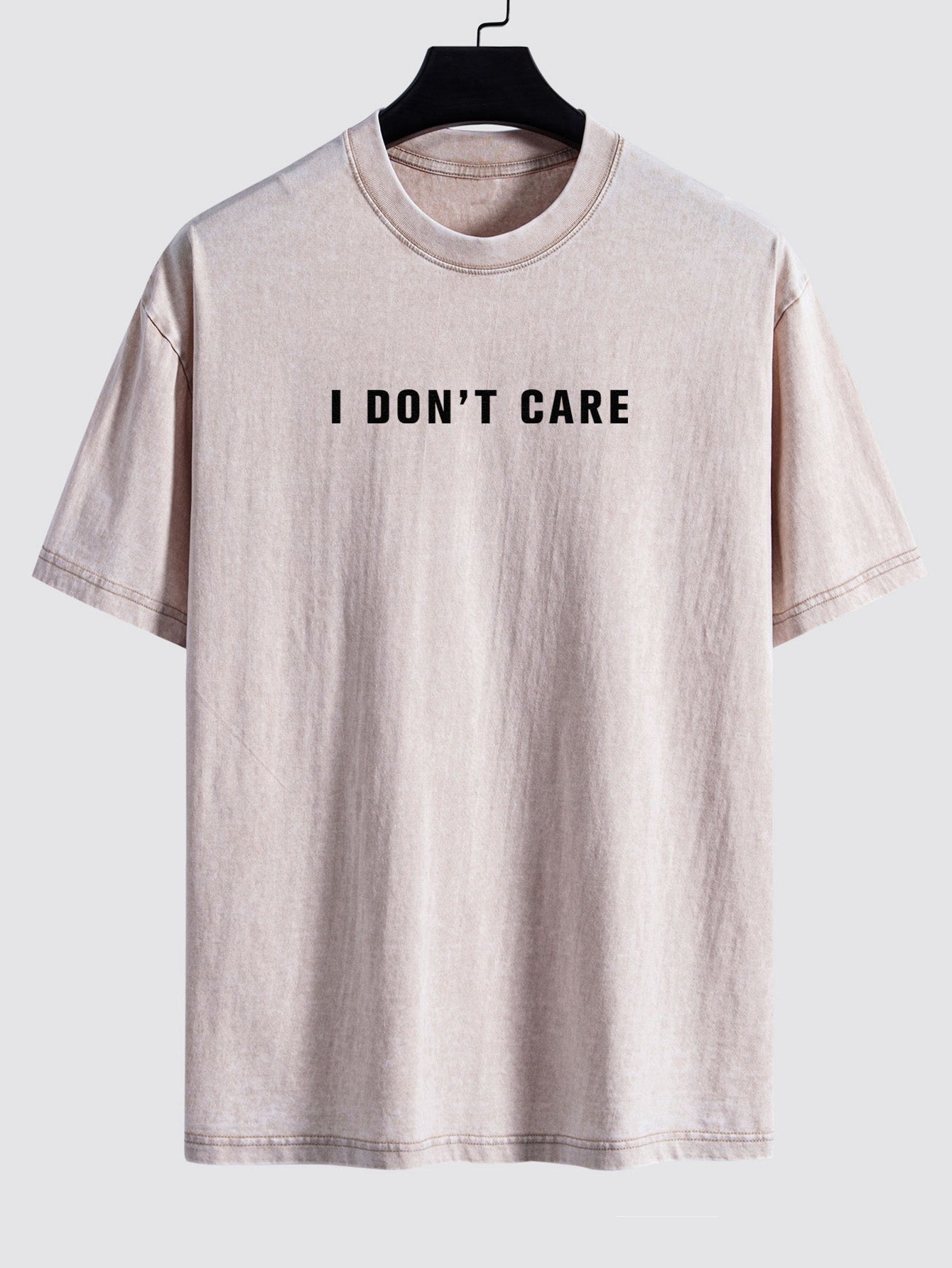Make a bold statement with this "I Don't Care" print T-shirt, featuring a laid-back drop shoulder fit and edgy distressed details. The washed fabric adds a vintage touch, giving it that cool, worn-in feel. Perfect for expressing your carefree attitude while staying stylish and comfortable.