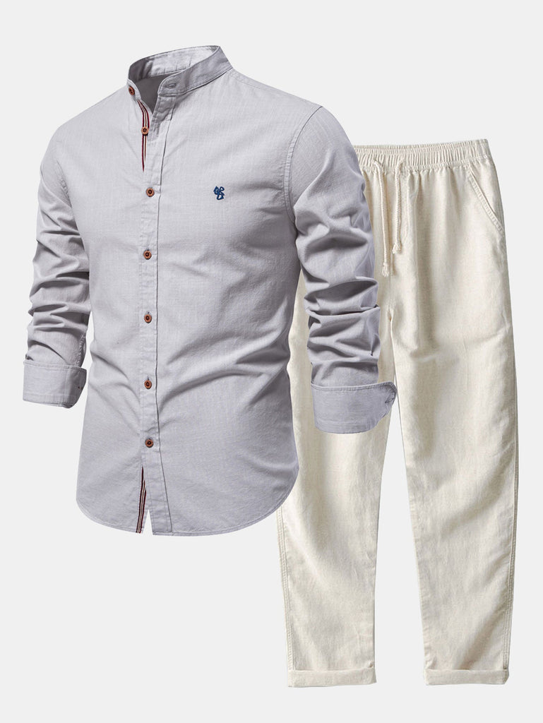 Long Sleeve Linen Look Stand Collar Shirt & Straight Leg Linen Pants