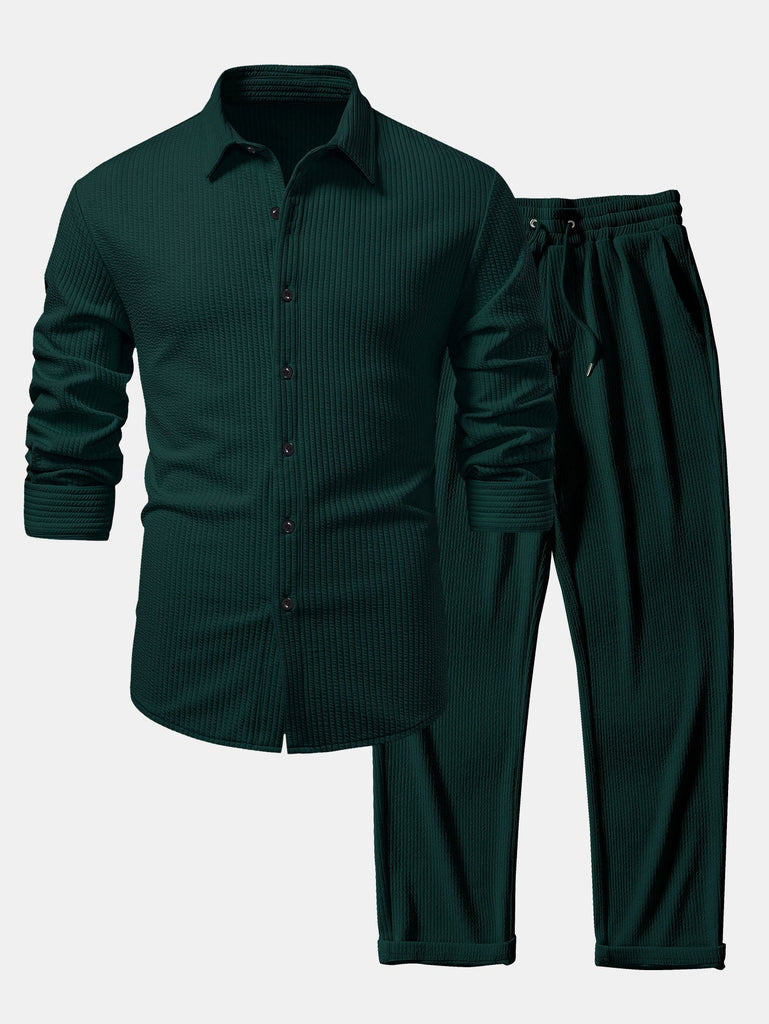 Long Sleeve Muscle Fit Ribbed Button Up Shirt & Straight Leg Ribbed Pants