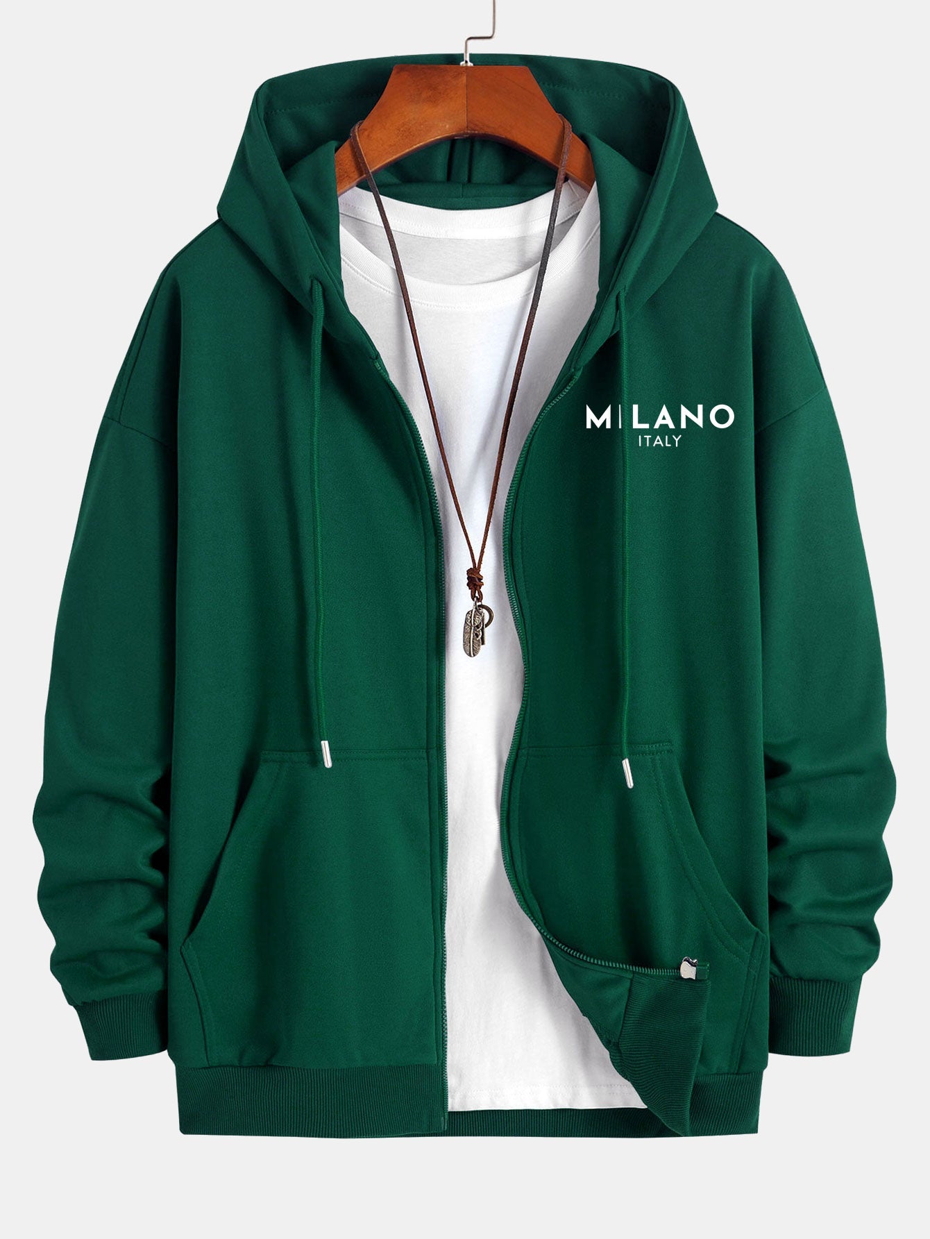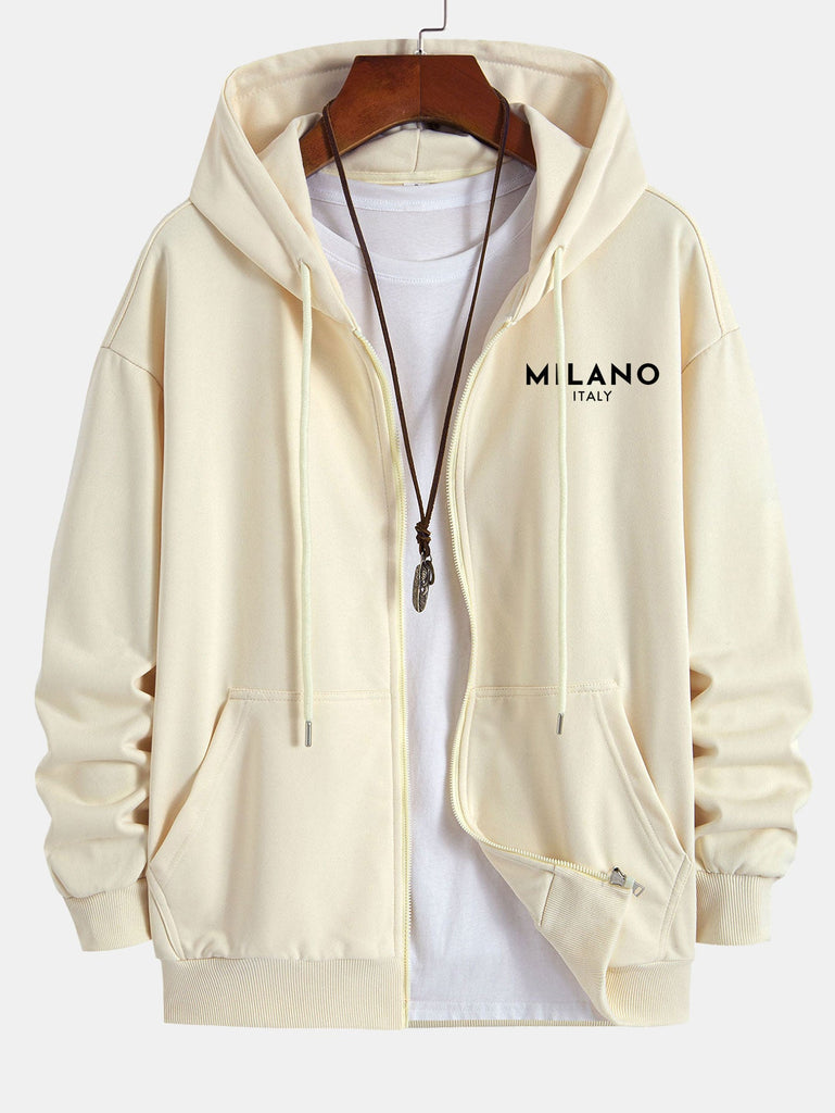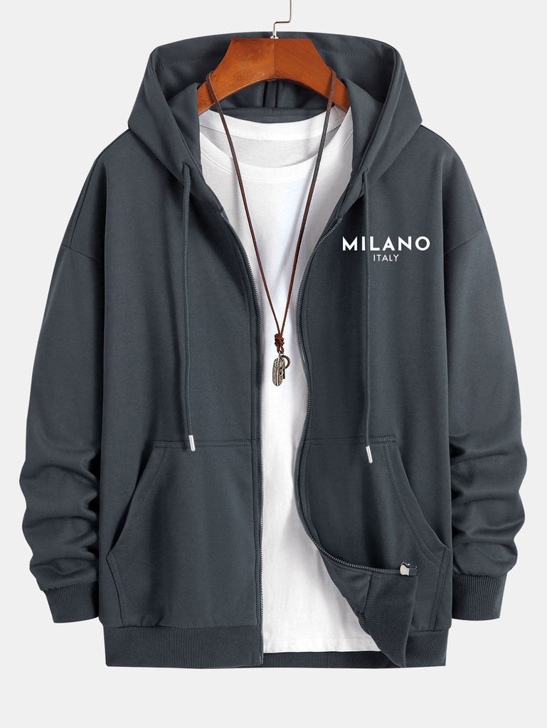 Crafted from a soft, cozy cotton-blend, this hoodie showcases a stylish ¡°Milano Italy¡± print, perfect for lovers of travel and fashion. The relaxed fit makes it easy to layer, while the full zip closure, adjustable drawstring hood, and roomy pockets ensure both comfort and practicality. A versatile piece that blends casual comfort with city-inspired style.