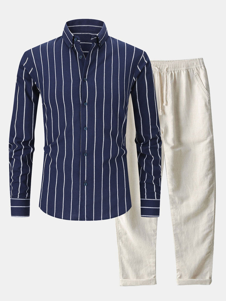 Long Sleeve Stripe Cotton Button Up Shirt & Straight Leg Linen Pants