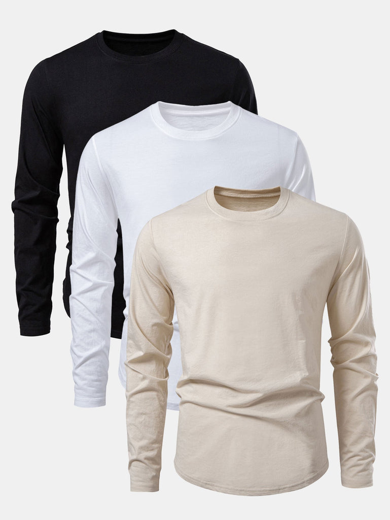 3 Pieces Basic Long Sleeve Cotton Arc Hem T-Shirts
