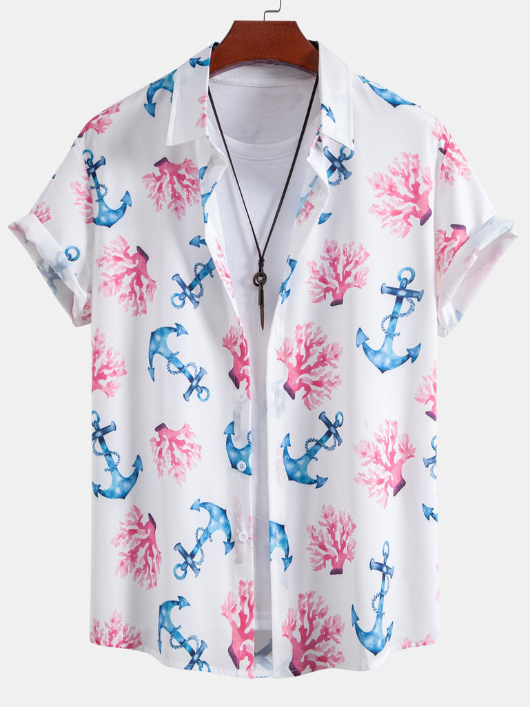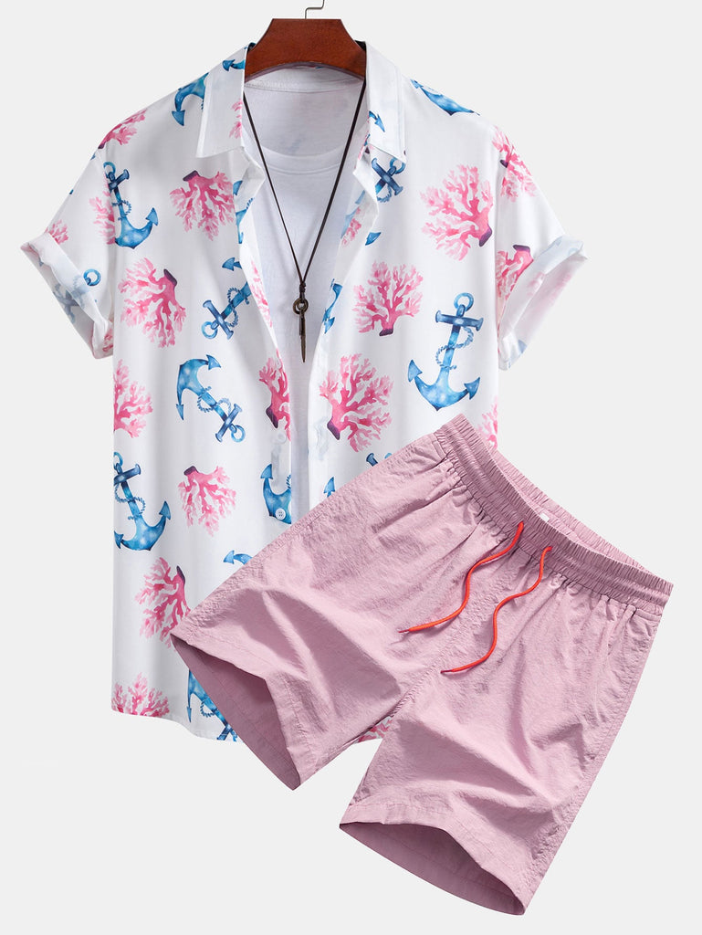 Coral Anchor Print Button Up Shirt & Swim Shorts