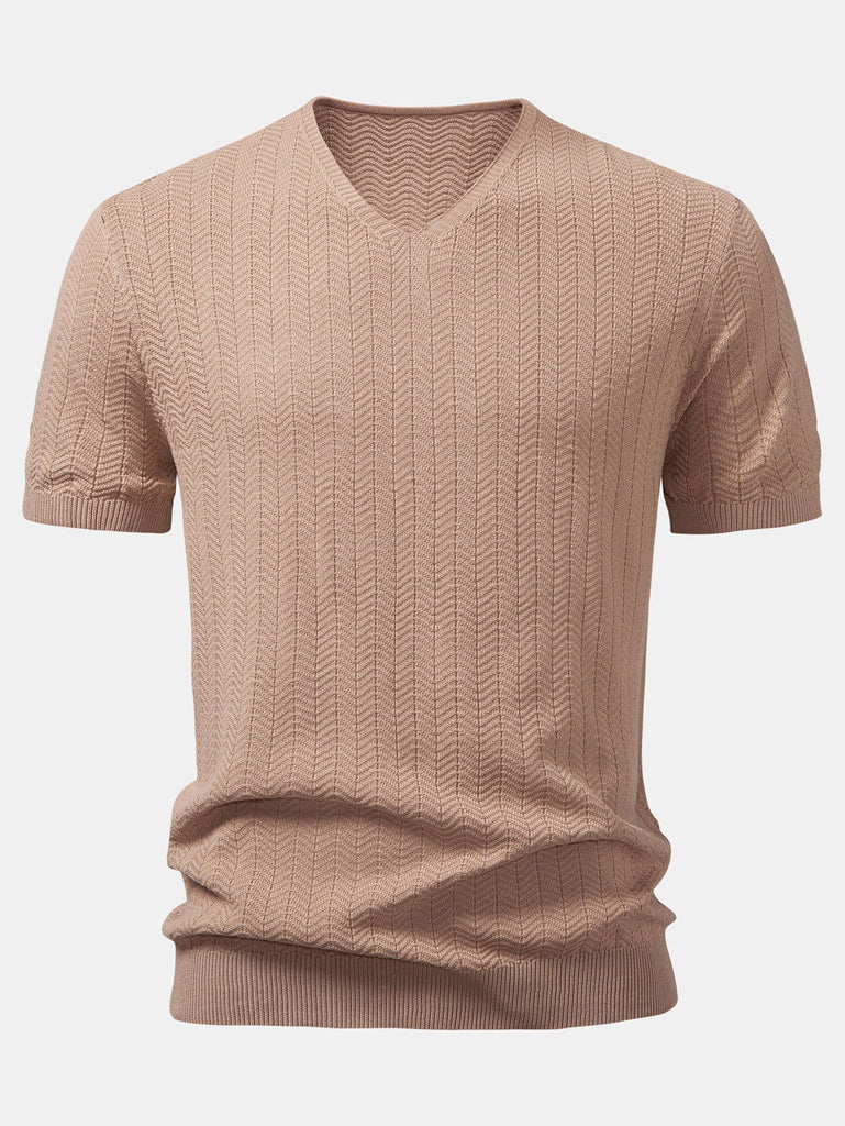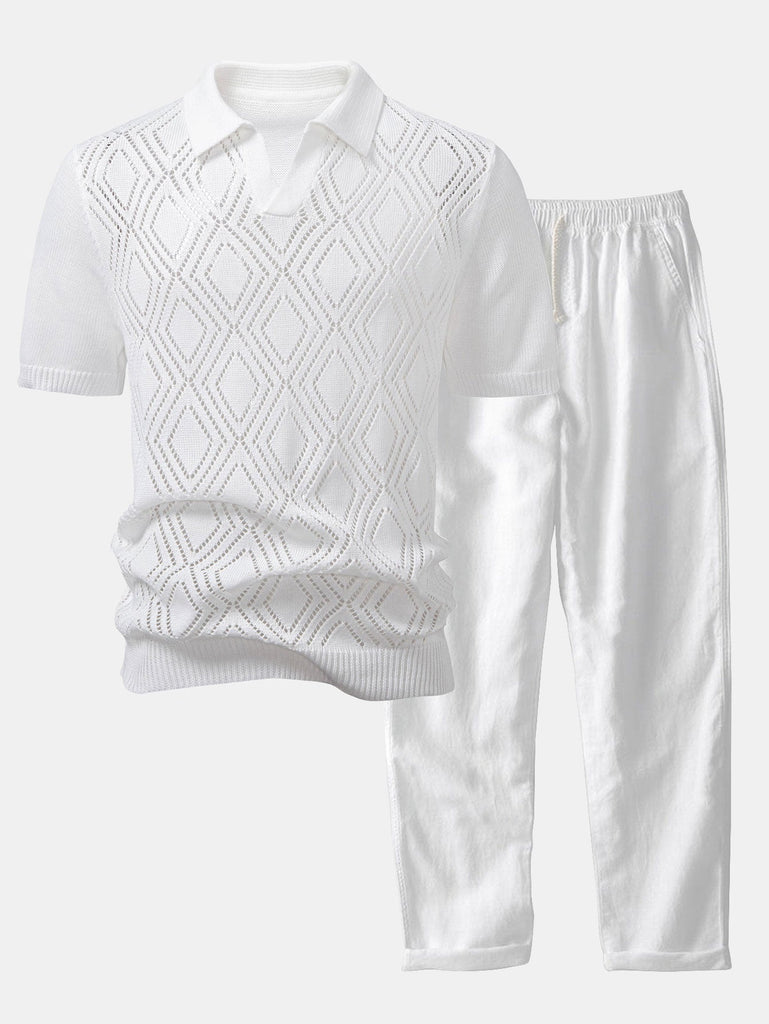 Geometric Crochet V Neck Polo Shirt & Straight Leg Linen Pants