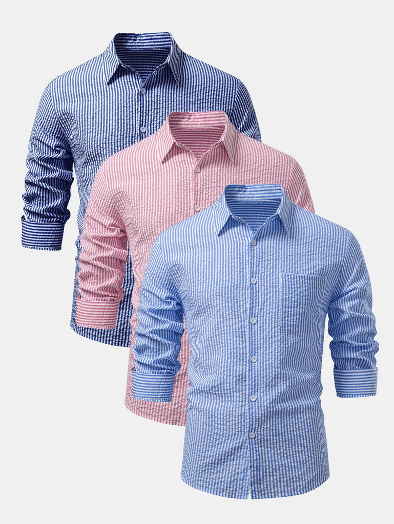 3 Pieces Seersucker Striped Stand Collar Shirt