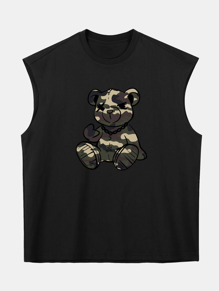 Relax Fit Camouflage Bear Print Cotton Drop Shoulder Sleeveless T-Shirt