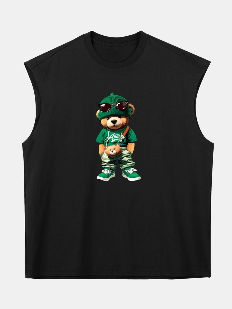 Relax Fit Trendy Bear Print Cotton Drop Shoulder Sleeveless T-Shirt