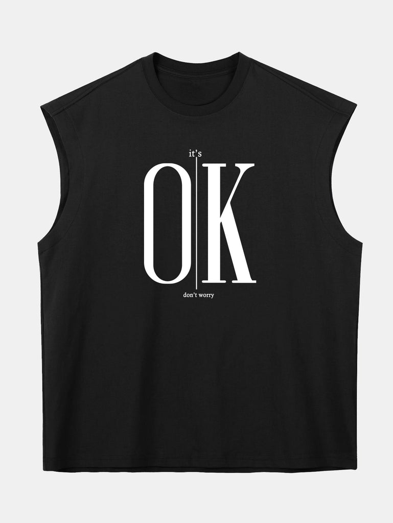 Relax Fit OK Slogan Print Cotton Drop Shoulder Sleeveless T-Shirt