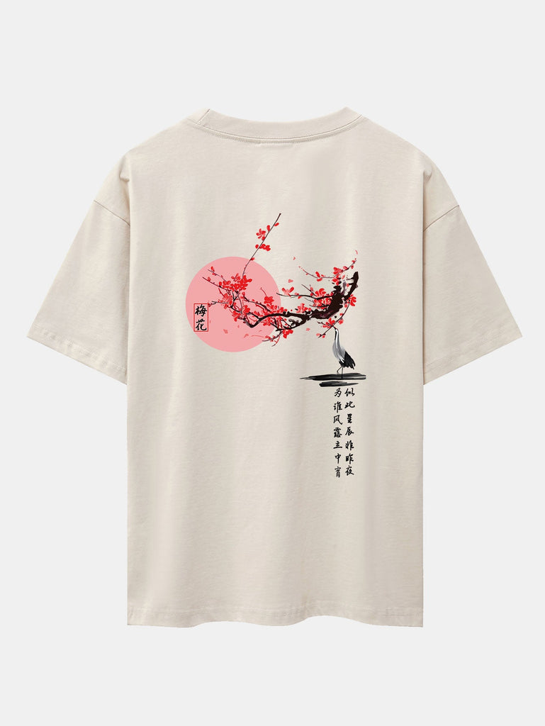 Plum Blossom And Crane Back Print Drop Shoulder Oversize T-Shirt