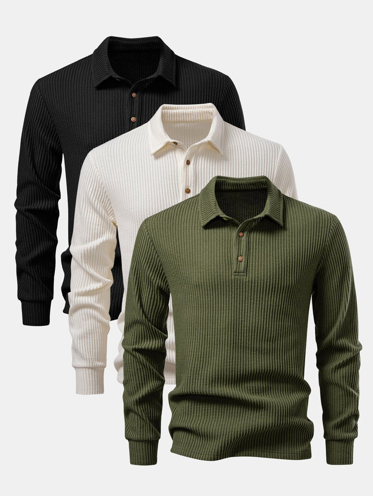 3 Pieces Long Sleeved Knitted Waffle Polo Shirt