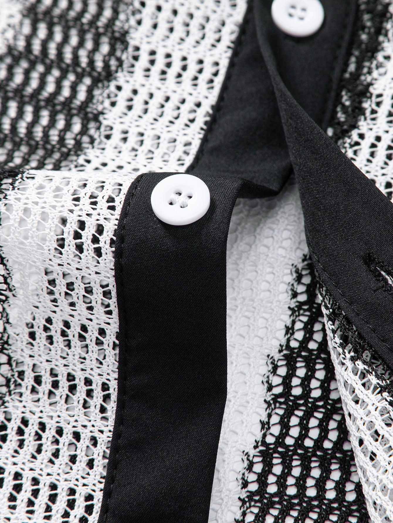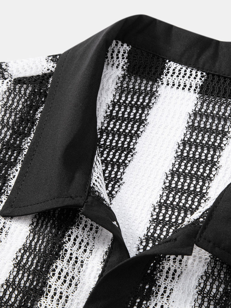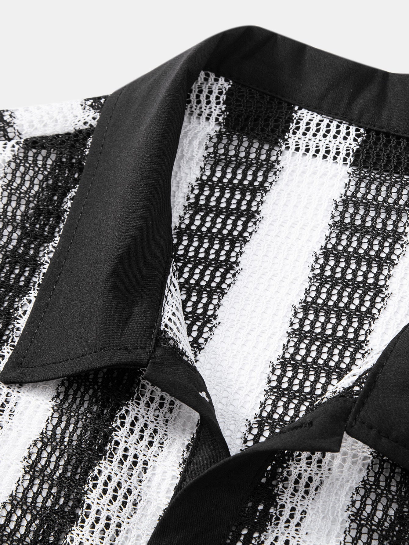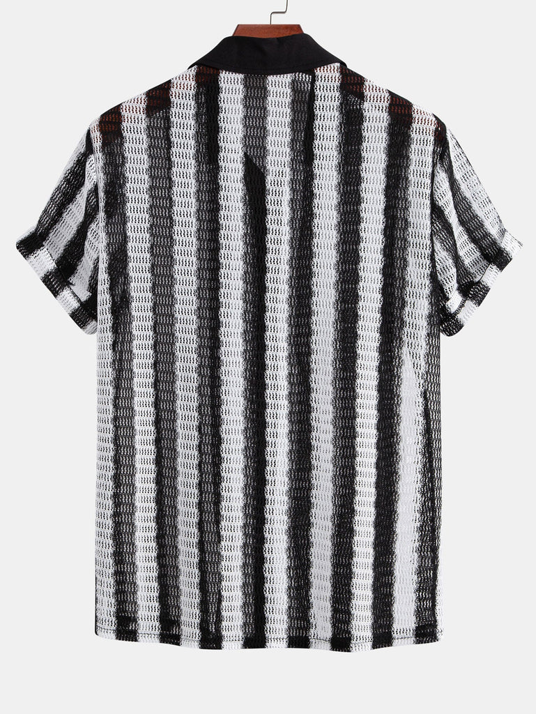 Stay cool and stylish in this hollow out stripe textured cuban shirt, crafted with a breezy, open-knit design that¡¯s perfect for summer. The classic Cuban collar and short sleeves give it a relaxed vacation vibe, while the textured stripe fabric adds a modern twist.