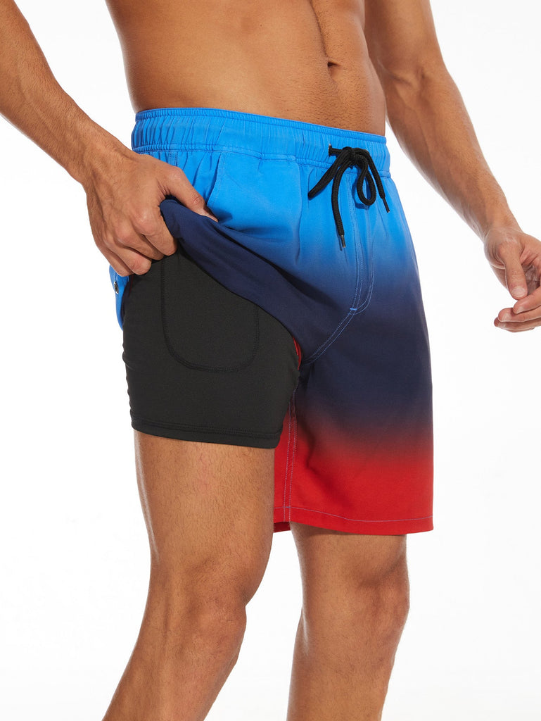2 In 1 Drawstring Beach Swim Shorts With Pocket
