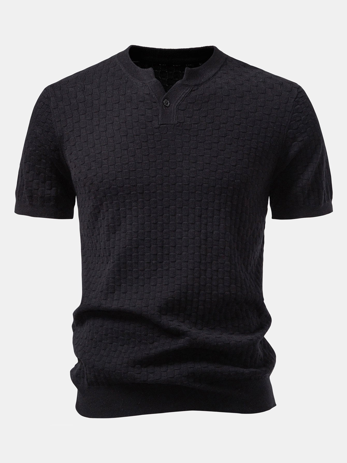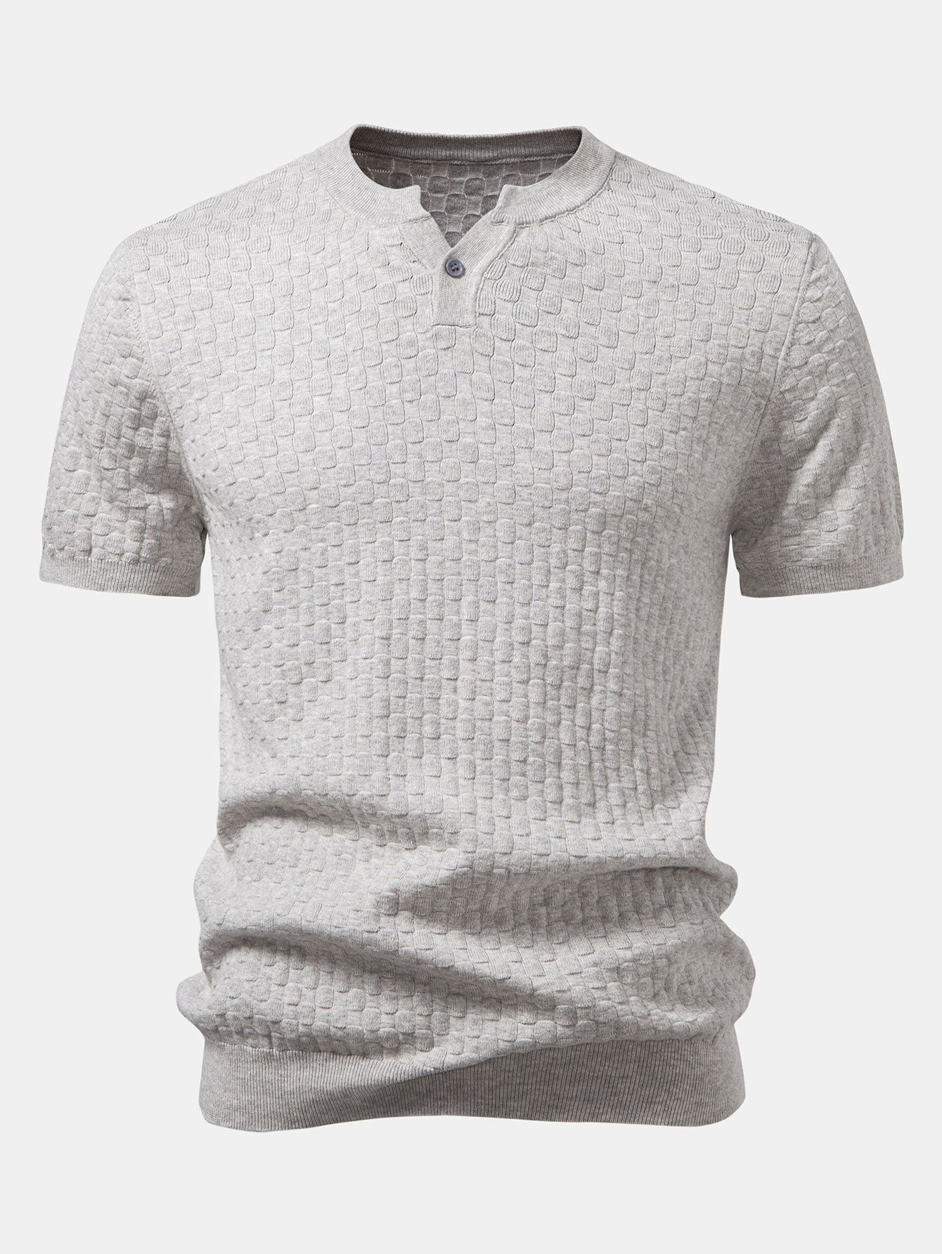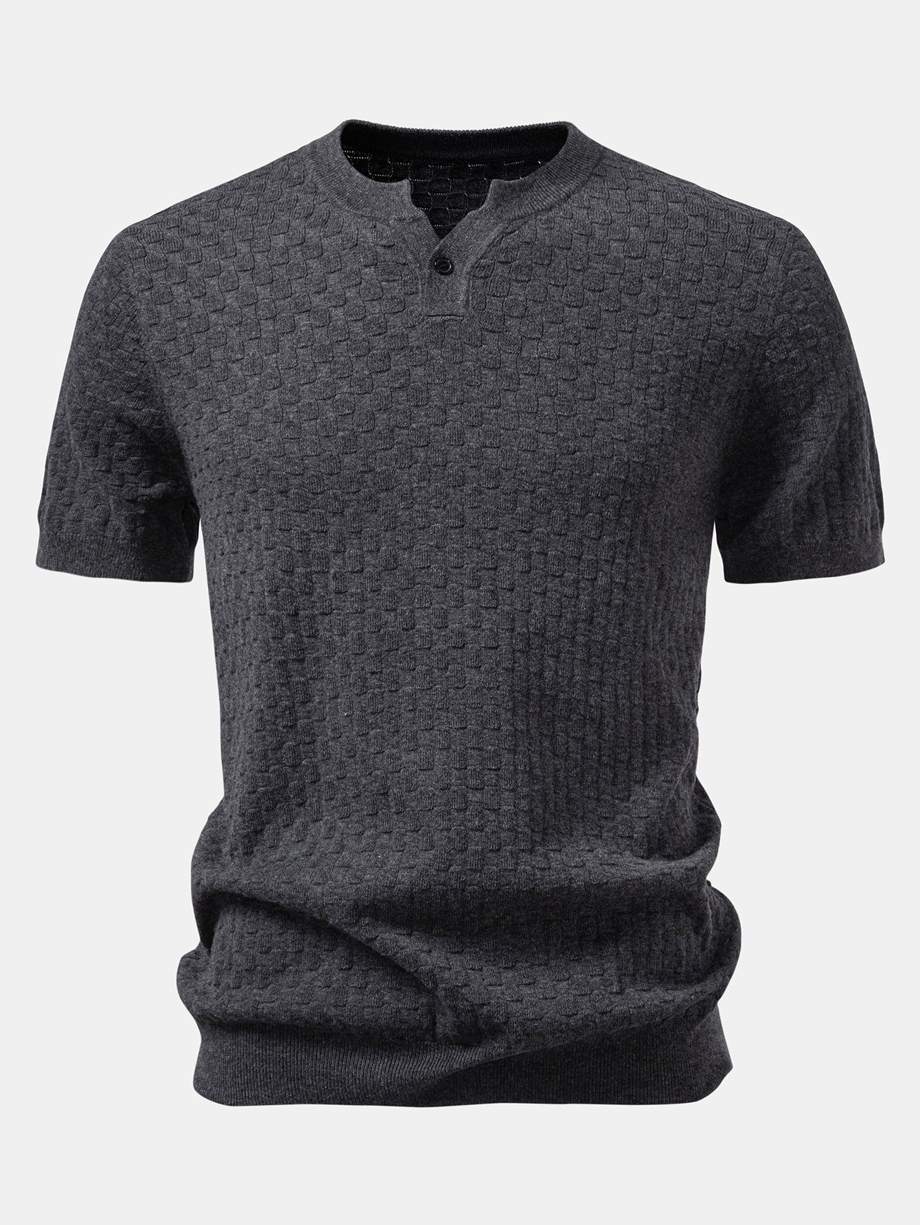 This men's short-sleeve henley t-shirt features a textured pattern that adds a modern touch to a classic design. The henley collar with two buttons adds a subtle yet stylish element, giving this shirt a refined, laid-back look. Perfect for layering or wearing on its own, this versatile piece pairs well with jeans or chinos for a relaxed yet polished outfit.