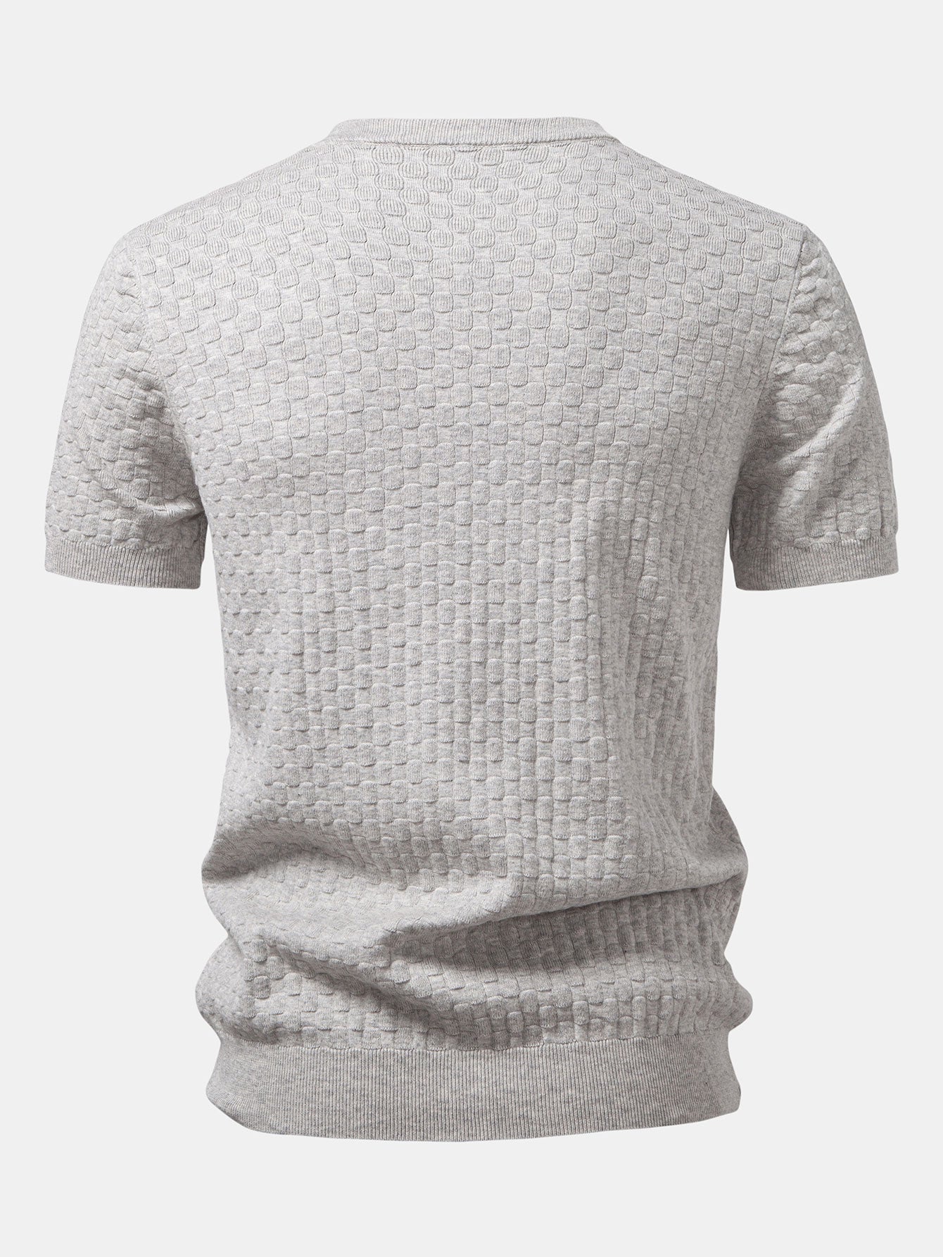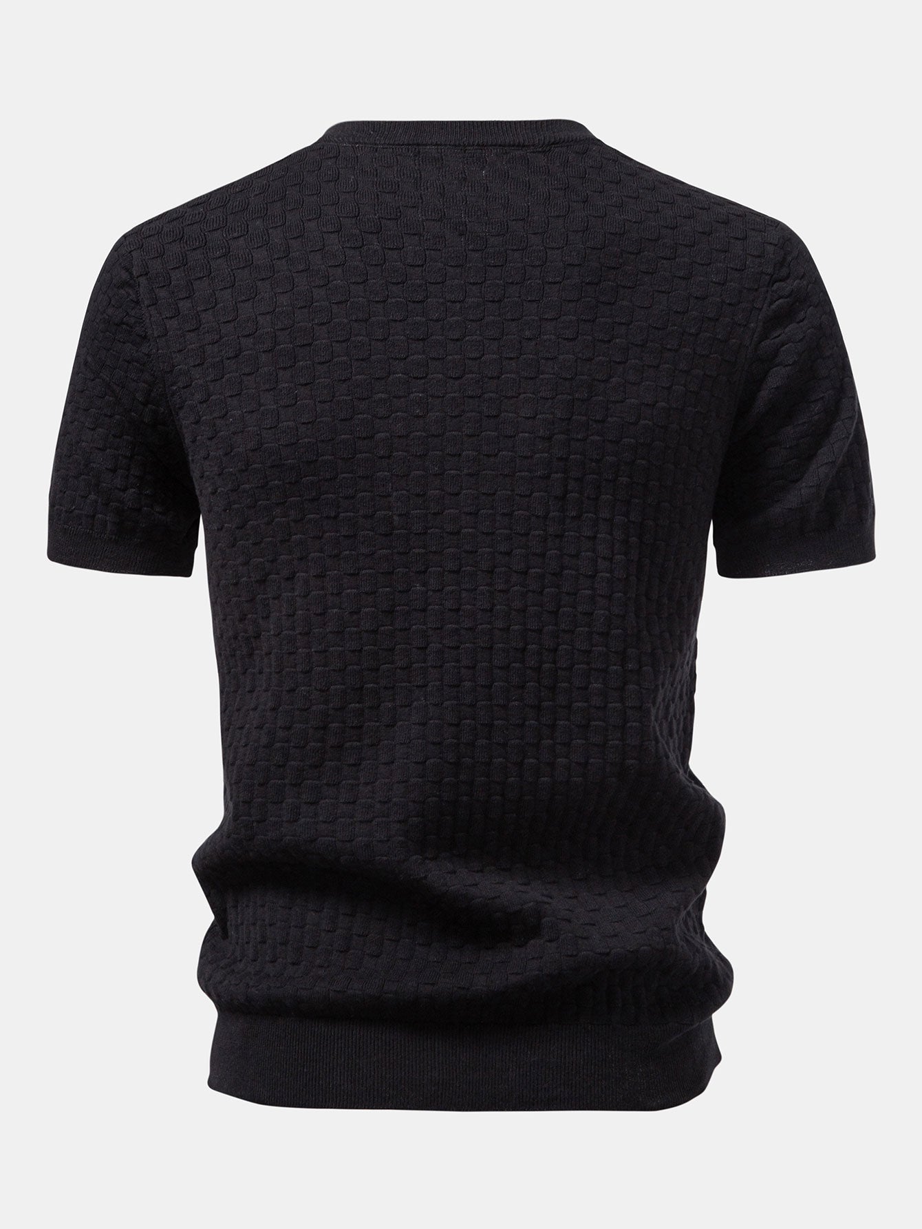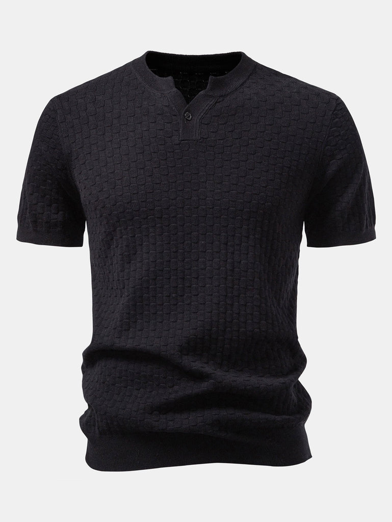 This men's short-sleeve henley t-shirt features a textured pattern that adds a modern touch to a classic design. The henley collar with two buttons adds a subtle yet stylish element, giving this shirt a refined, laid-back look. Perfect for layering or wearing on its own, this versatile piece pairs well with jeans or chinos for a relaxed yet polished outfit.
