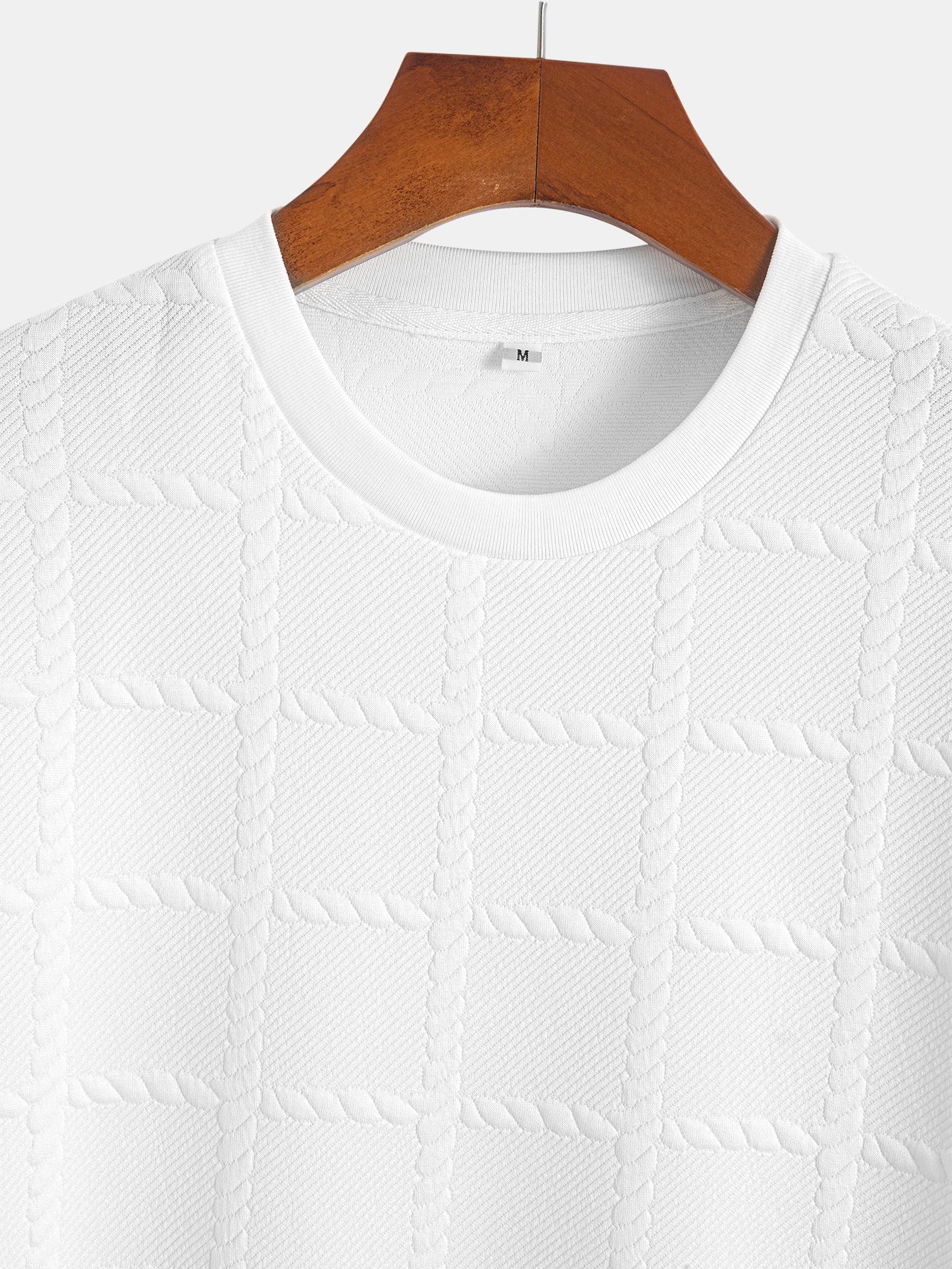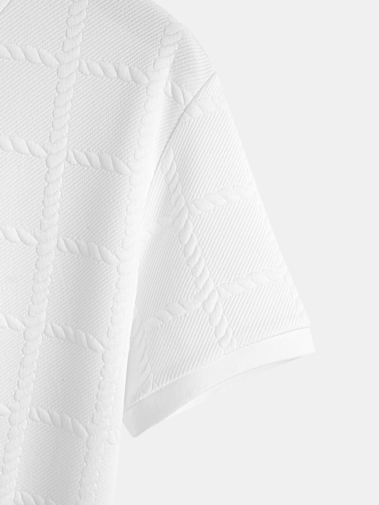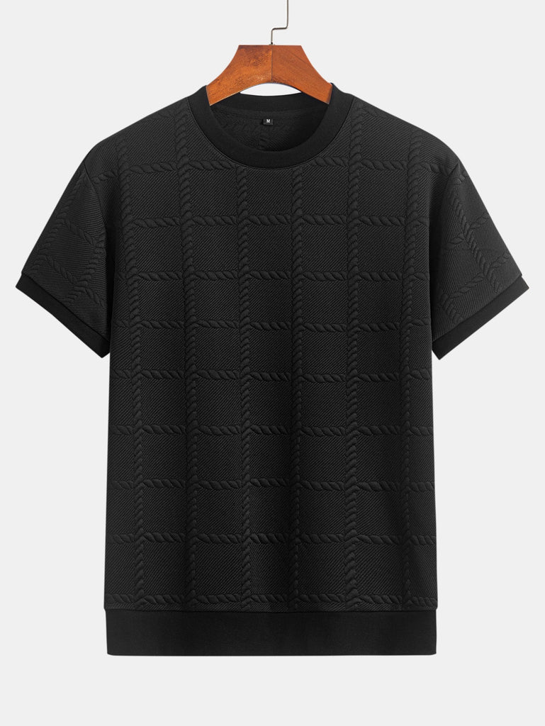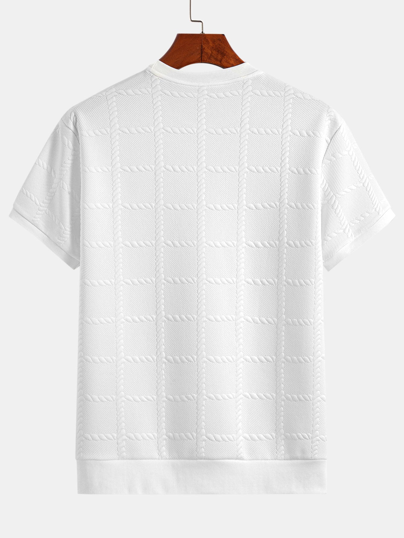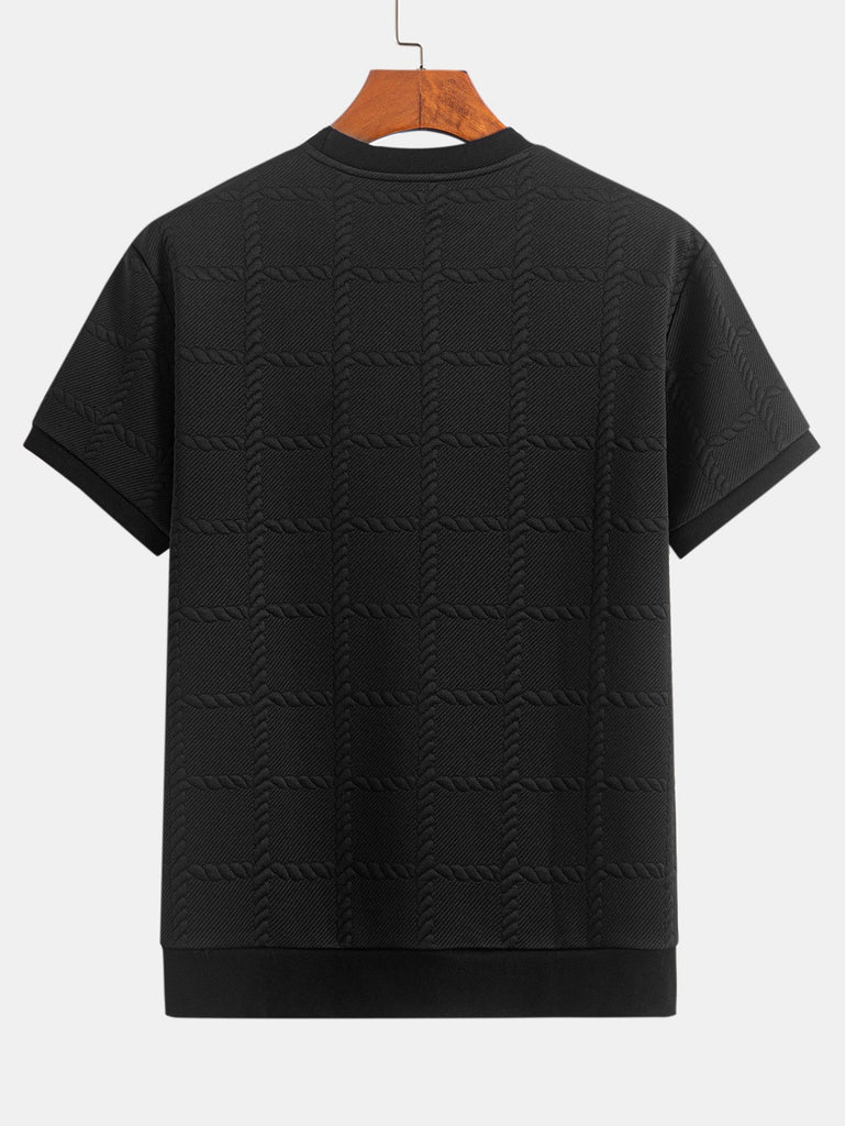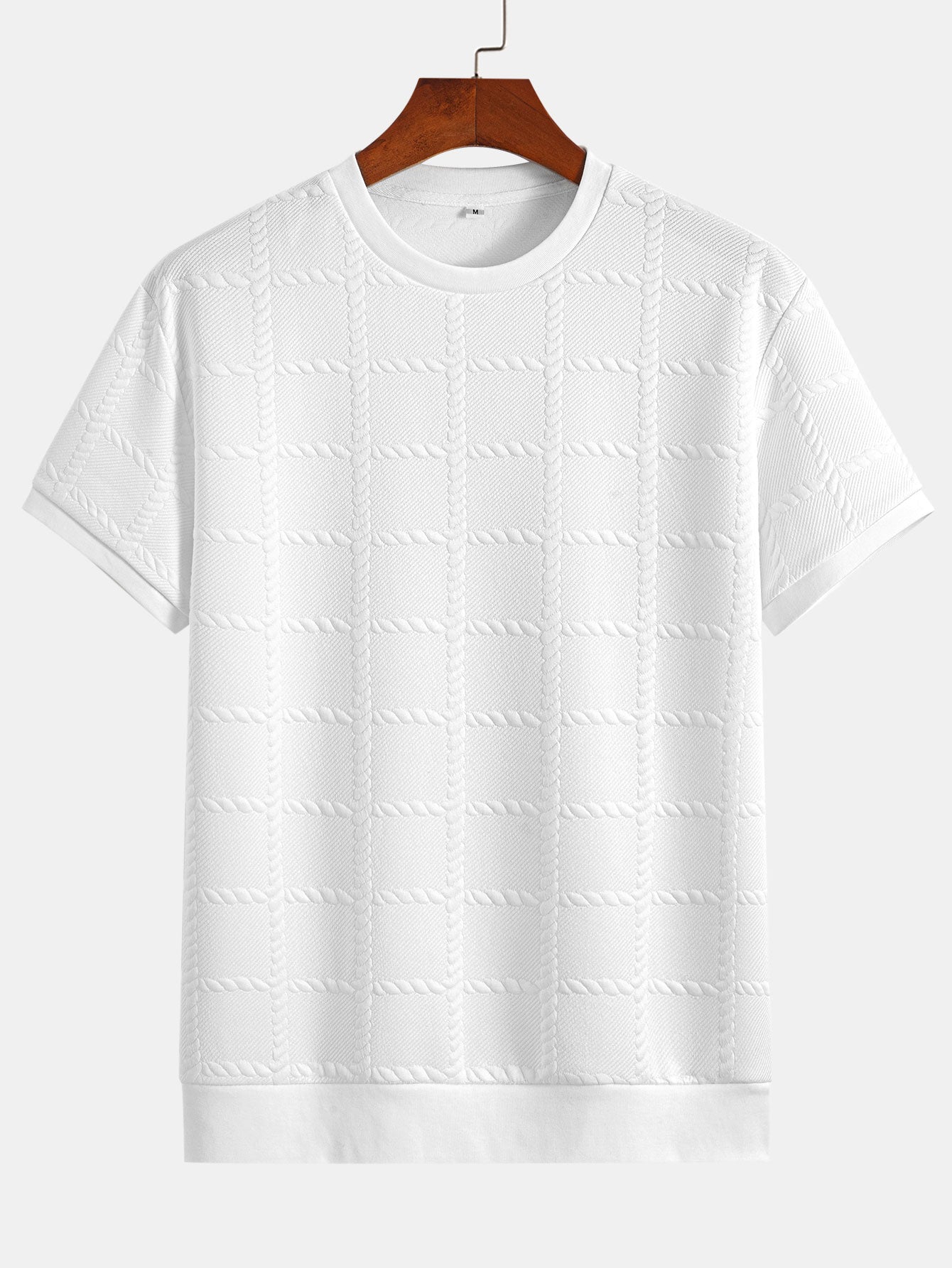 Elevate your everyday look with this stylish short-sleeve tee featuring a unique geometric jacquard texture in a subtle grid pattern. Crafted from a soft, breathable fabric, it offers all-day comfort with a modern edge. Whether paired with jeans or tailored shorts, this versatile piece adds a touch of sophistication to your summer wardrobe.