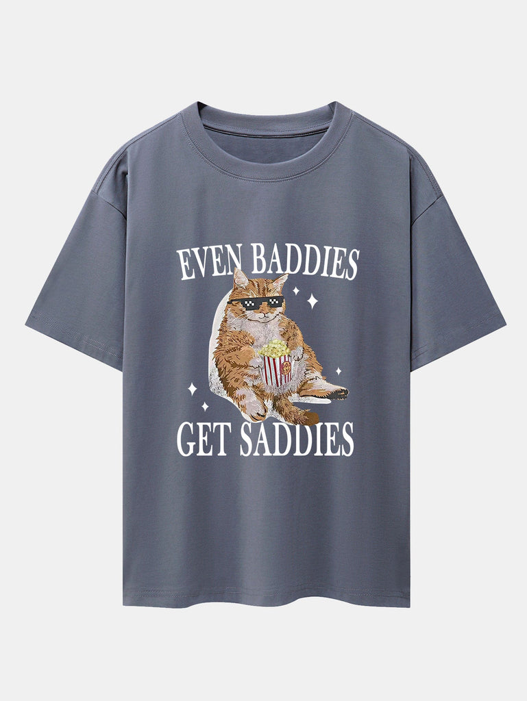 Even Baddies Get Saddies Cat Print Drop Shoulder Oversize T-Shirt