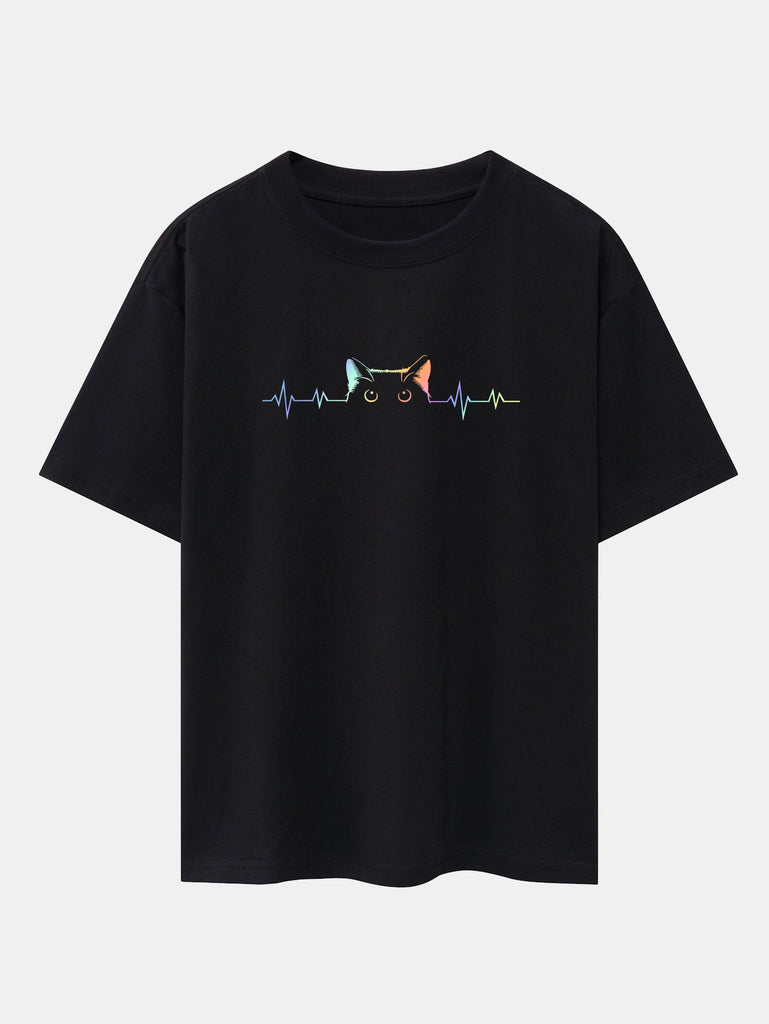 Peeking Cat Heartbeat Gradient Print Drop Shoulder Oversize T-Shirt