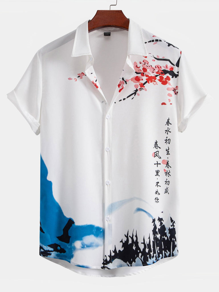 Ink Mountain Cherry Blossoms Print Button Up Shirt