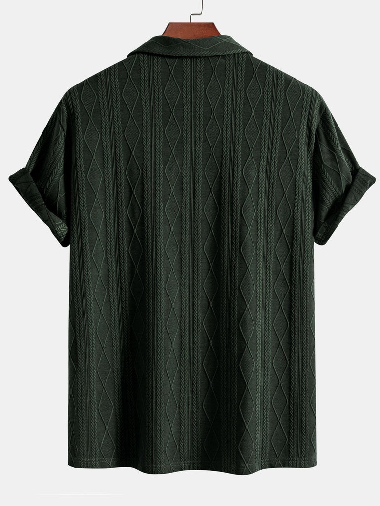 Channel effortless vacation energy with this sophisticated 2-piece outfit, featuring a knitted Cuban collar shirt with geometric rhombus jacquard pattern and lightweight crinkle-textured straight leg pants. A perfect blend of vintage flair and modern comfort.