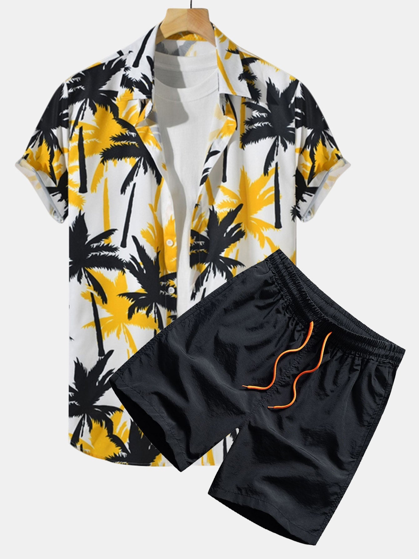 This summer island-style suit is printed with palm tree patterns, giving you a sense of relaxation on the Hawaiian beach. The short-sleeved button-down shirt is retro and casual, and the bright yellow drawstring shorts are loose and comfortable. It is suitable for daily outings and island trips. It creates an atmosphere and easily becomes a walking holiday scenery.