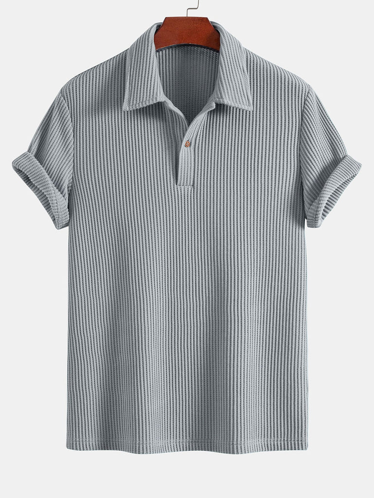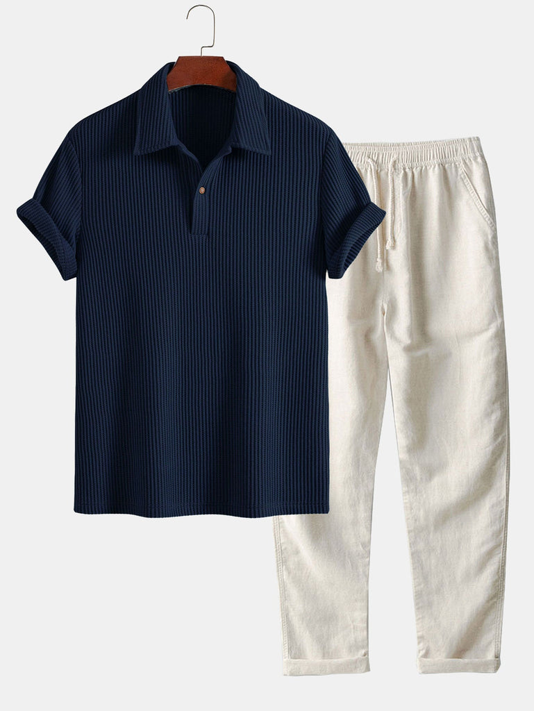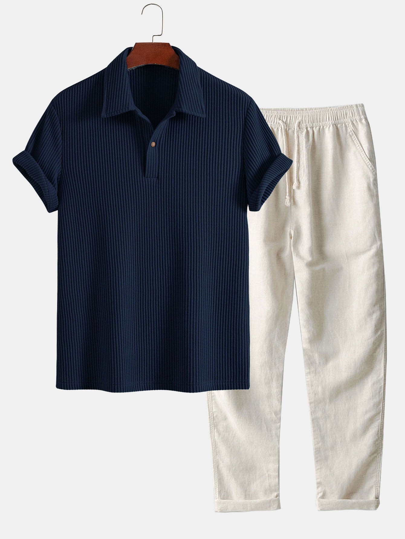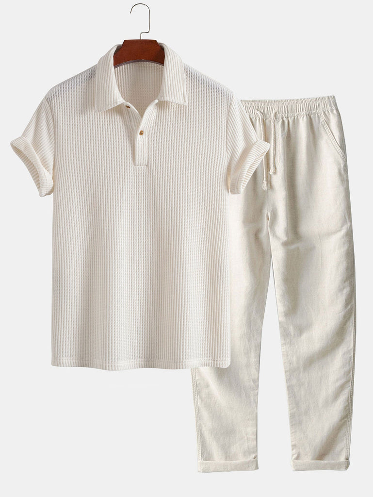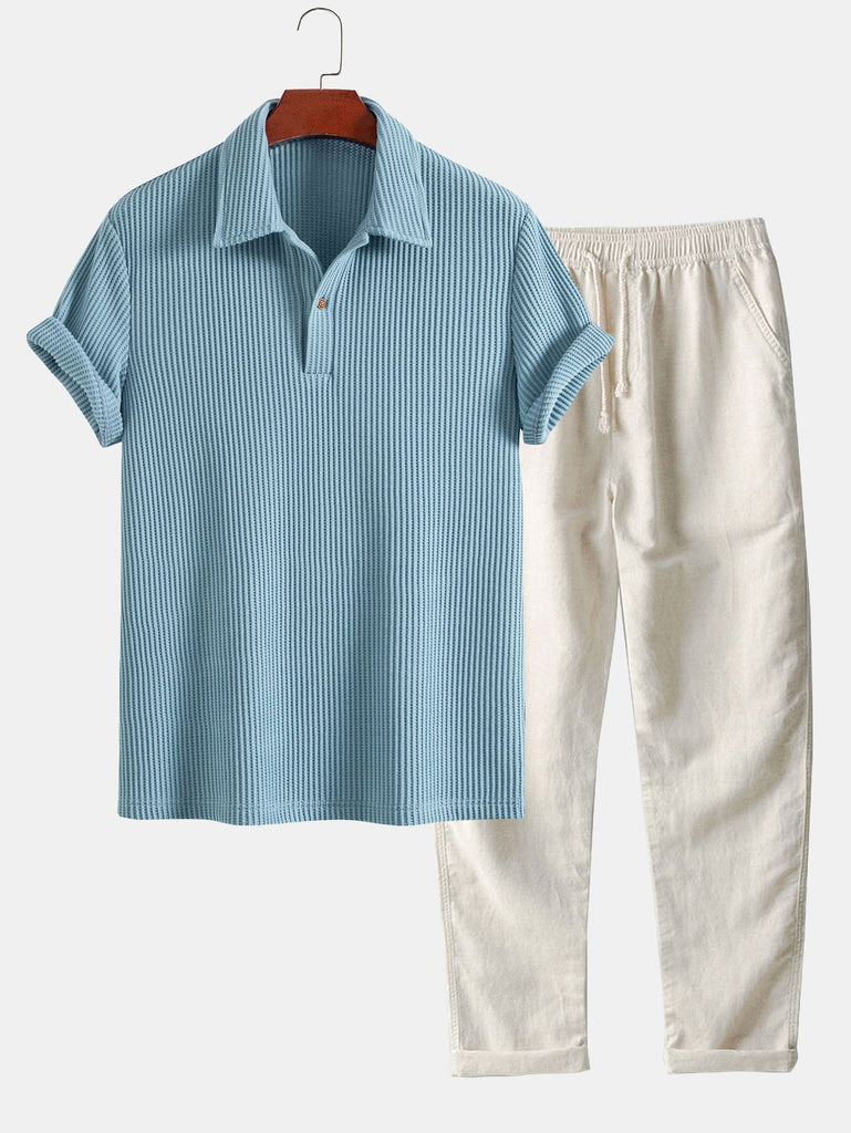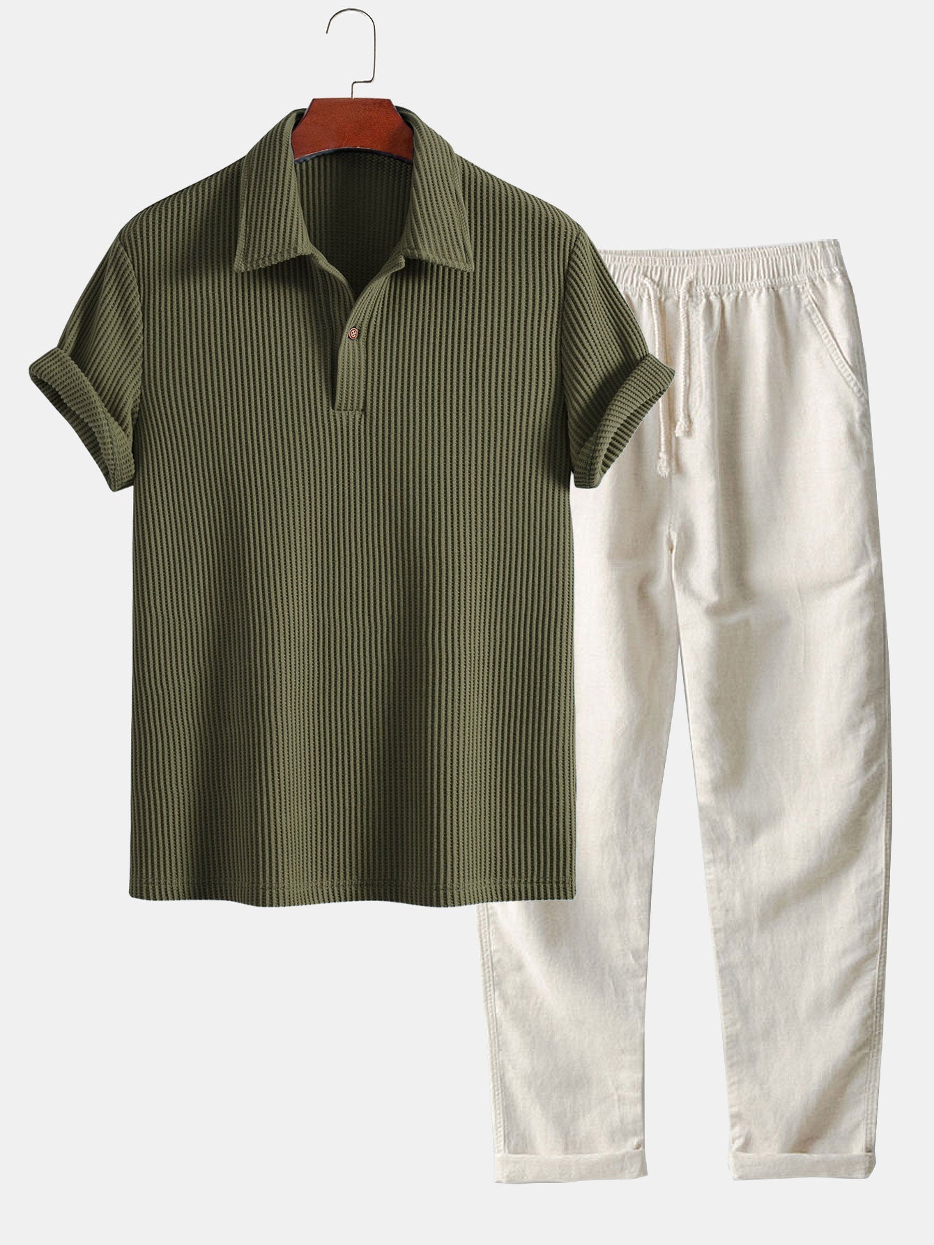 Short Sleeved Waffle Polo & Straight Leg Linen Pants