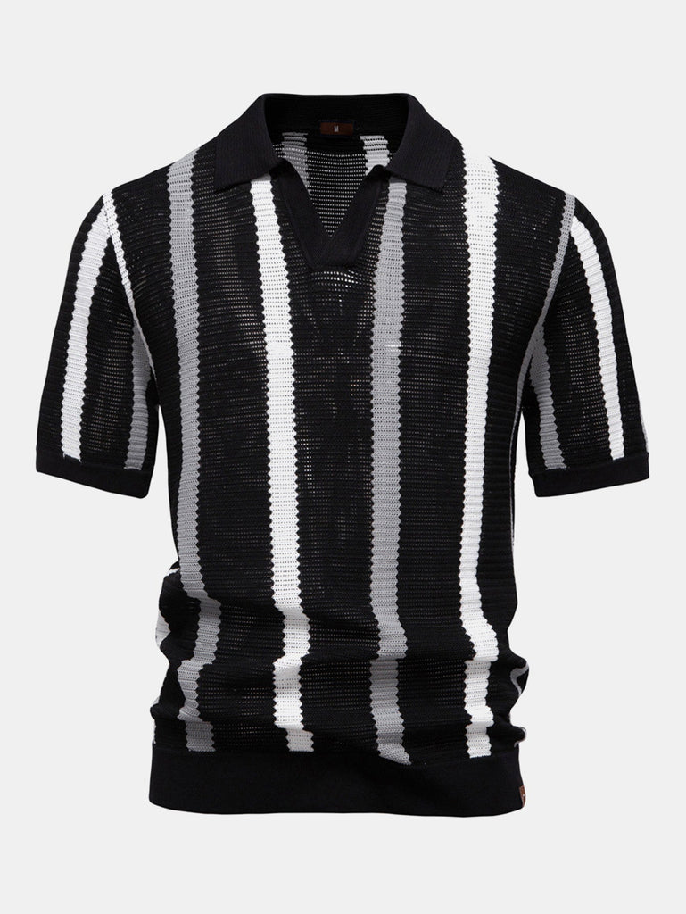 Stripe Knit V Neck Polo Shirt & Straight Leg Linen Pants