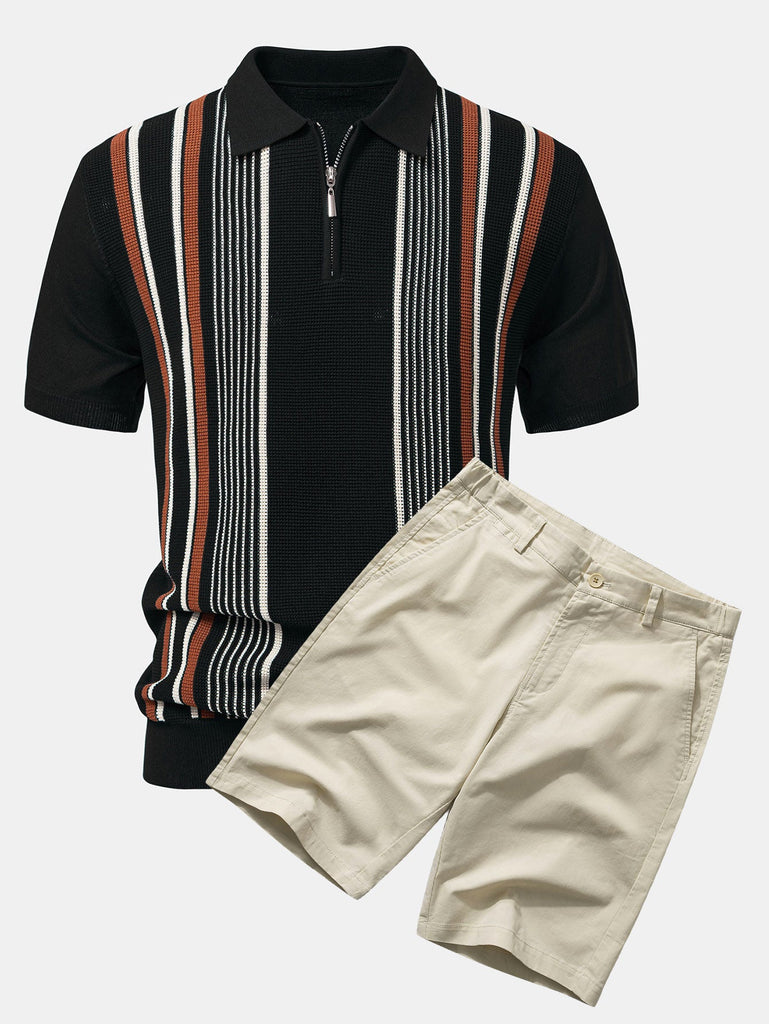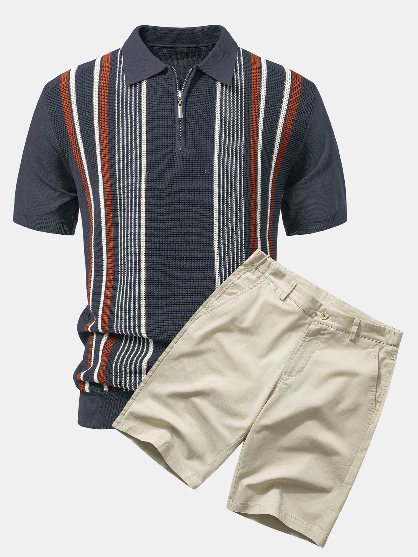 Stripe Knit Zip Up Polo Shirt & Cotton Chino Shorts