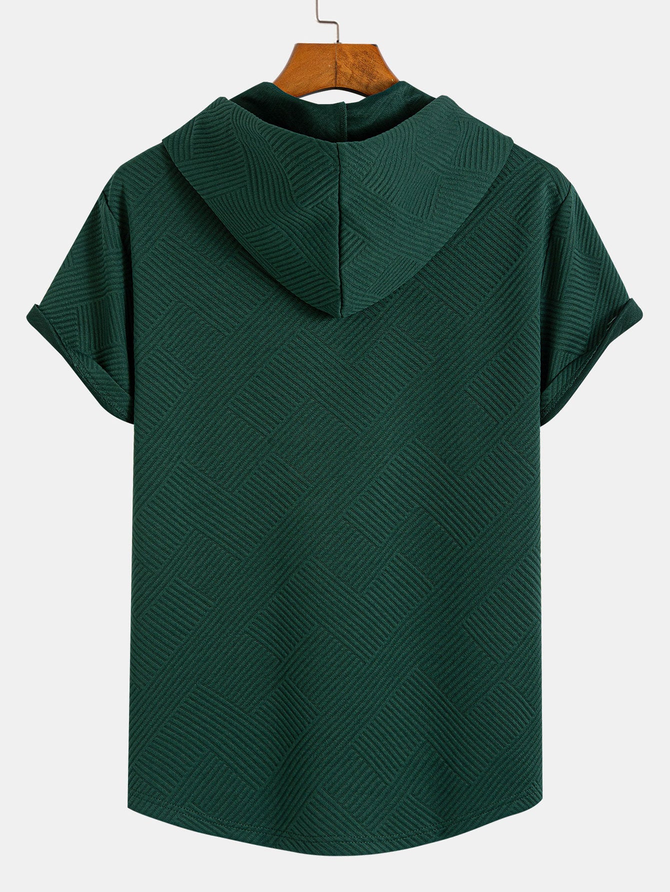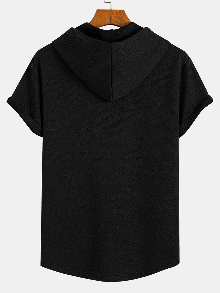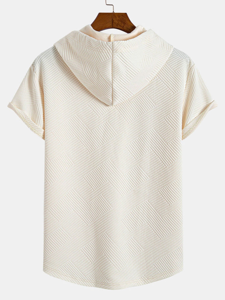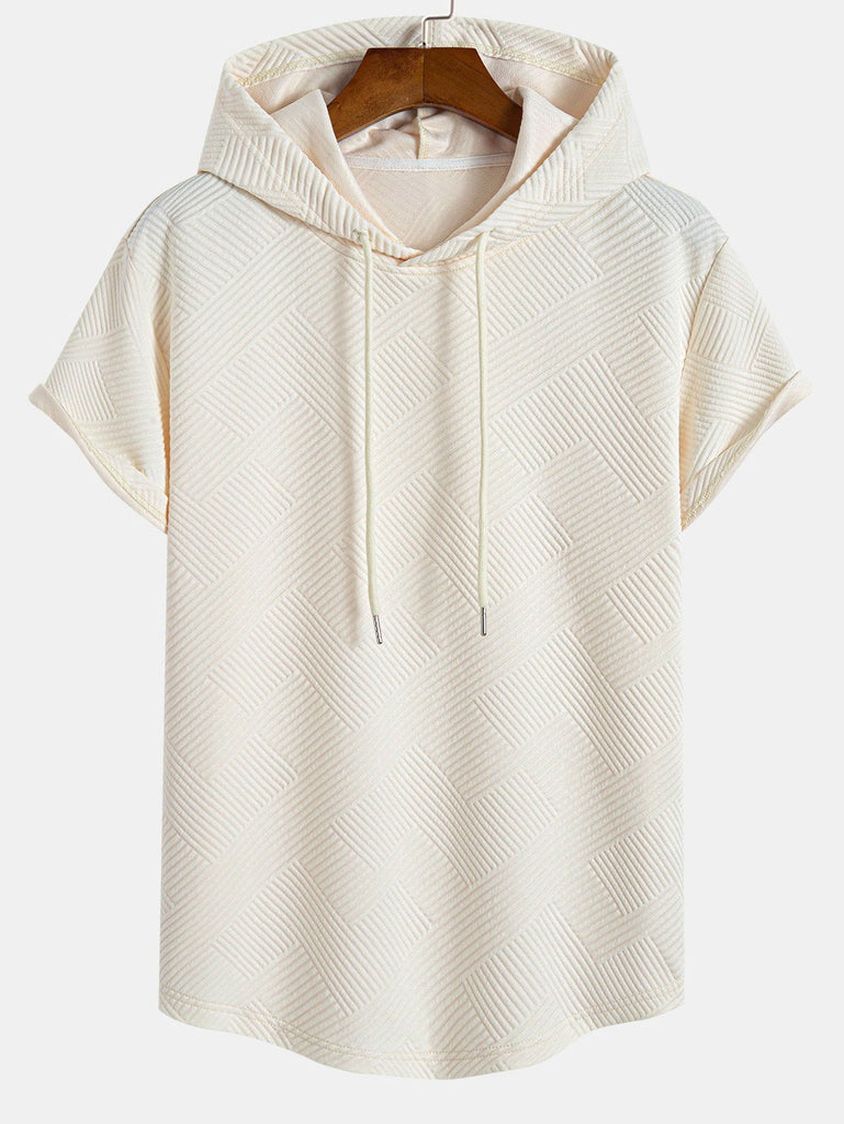 This men's suit has a short-sleeved hooded top with drawstring details, which is both fashionable and practical; the bottom is elastic waistband shorts, comfortable and easy to move. The fabric has a delicate three-dimensional geometric texture, which enhances the overall texture. It is suitable for summer vacation, daily leisure or light sports. It is an ideal choice for men who pursue comfort and style.