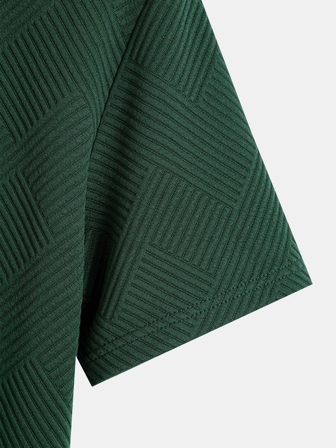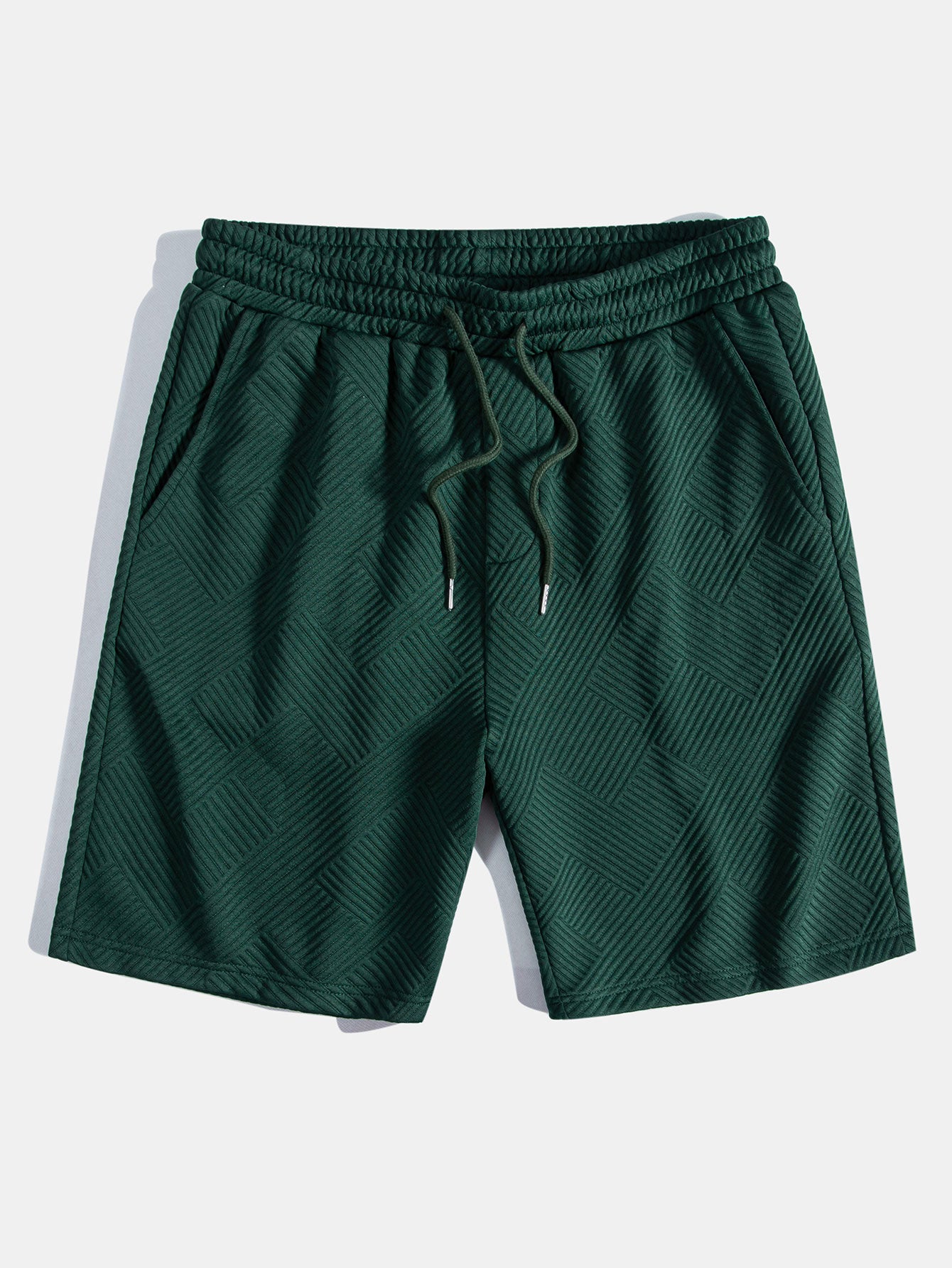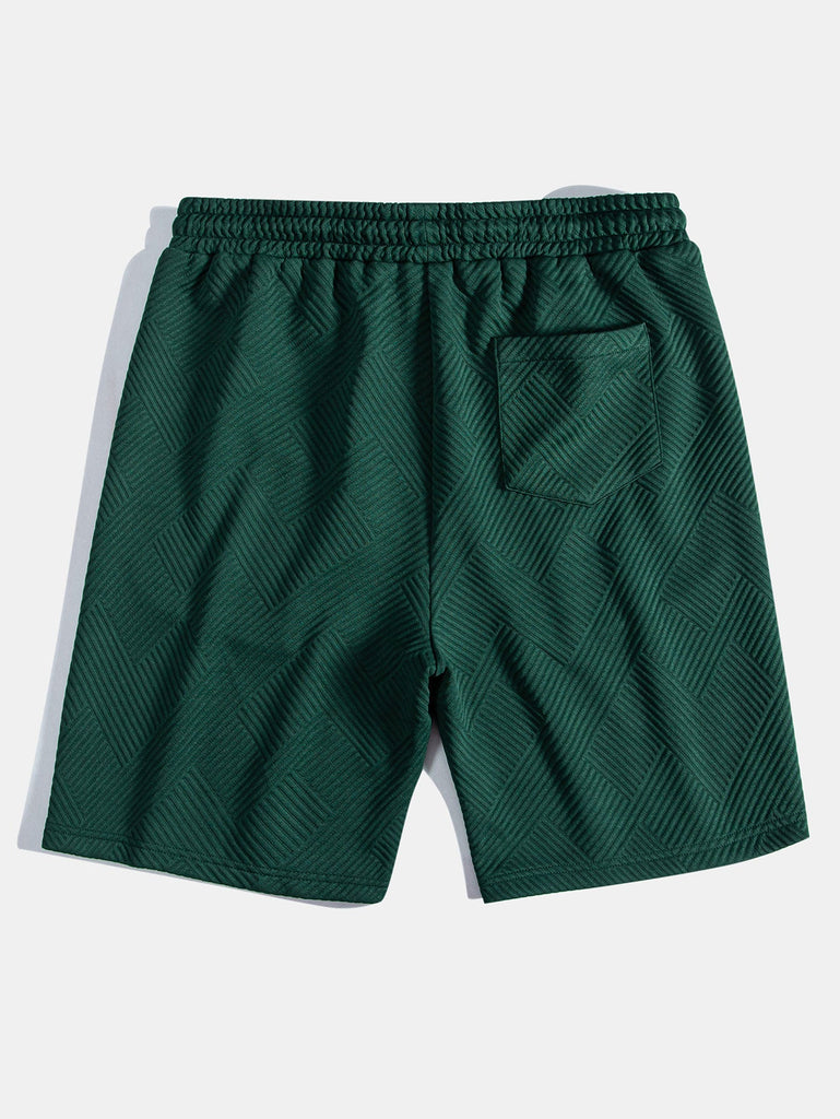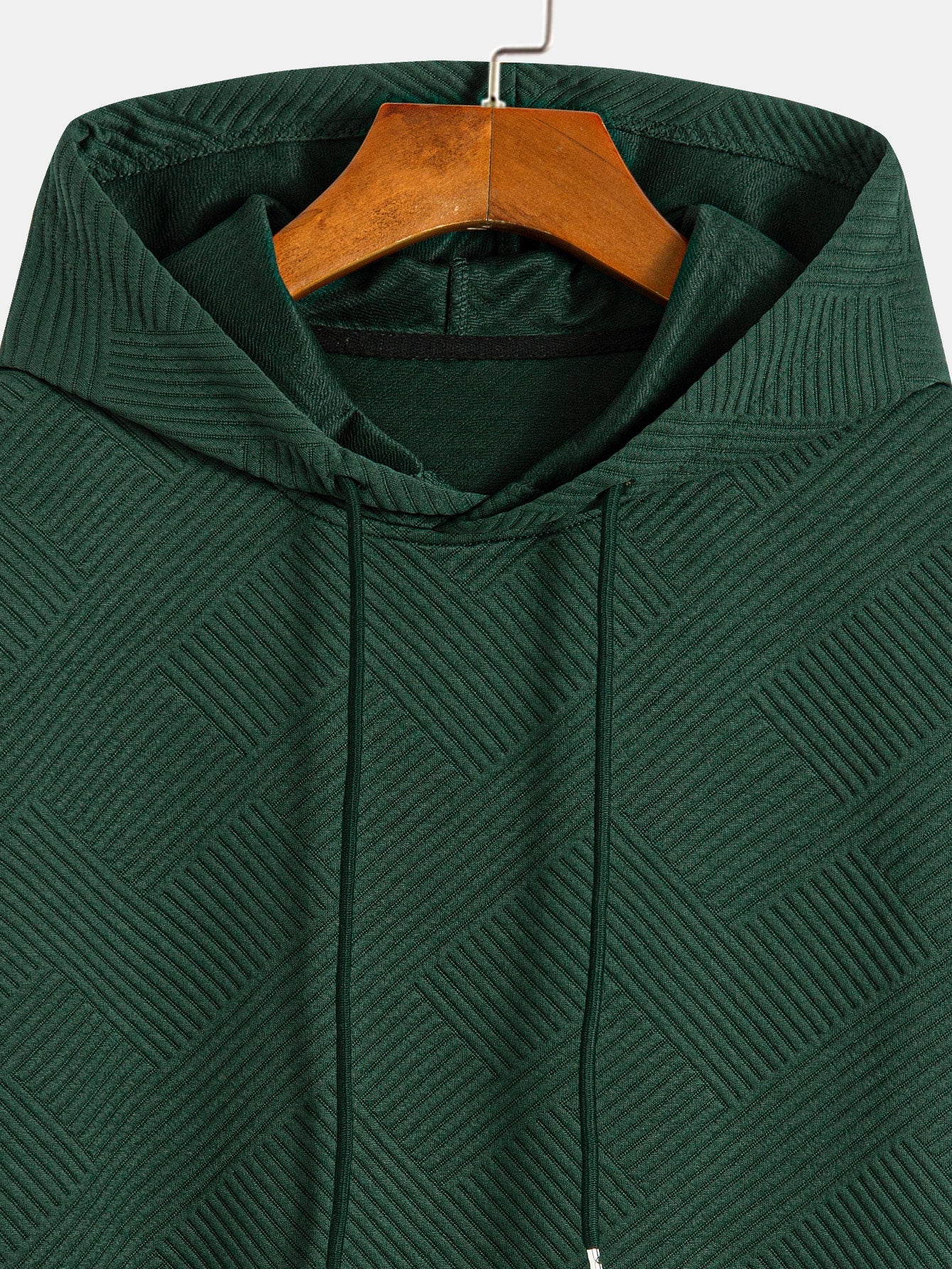 This men's suit has a short-sleeved hooded top with drawstring details, which is both fashionable and practical; the bottom is elastic waistband shorts, comfortable and easy to move. The fabric has a delicate three-dimensional geometric texture, which enhances the overall texture. It is suitable for summer vacation, daily leisure or light sports. It is an ideal choice for men who pursue comfort and style.