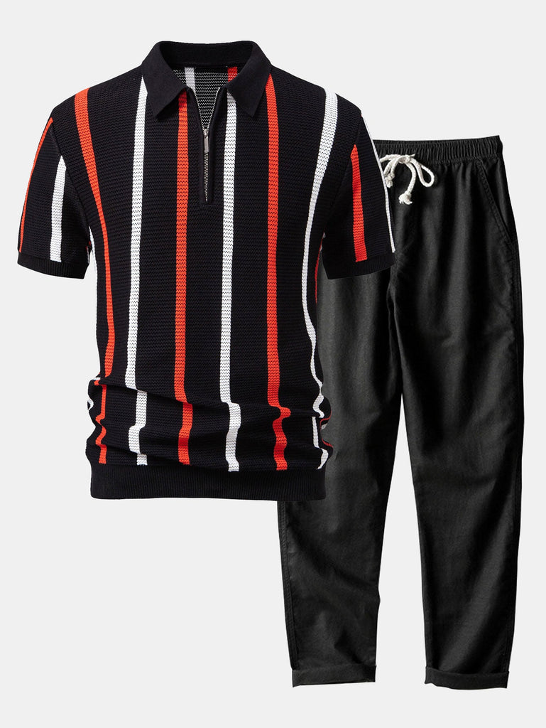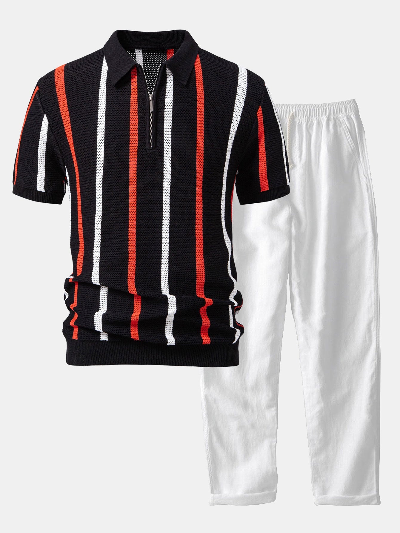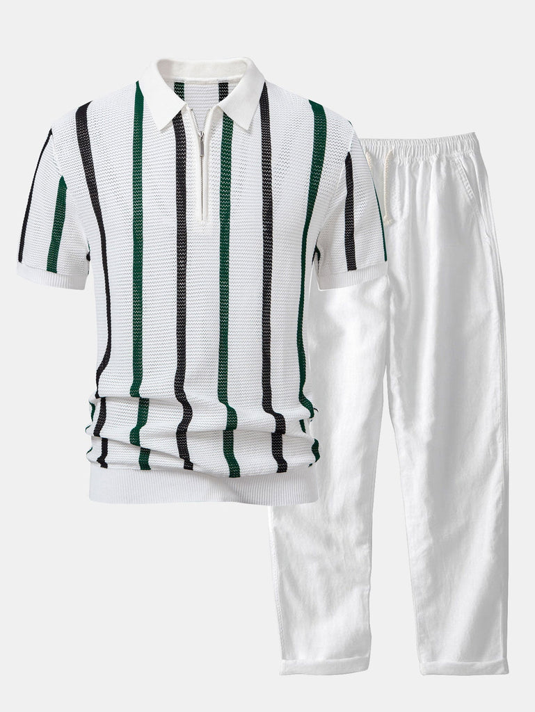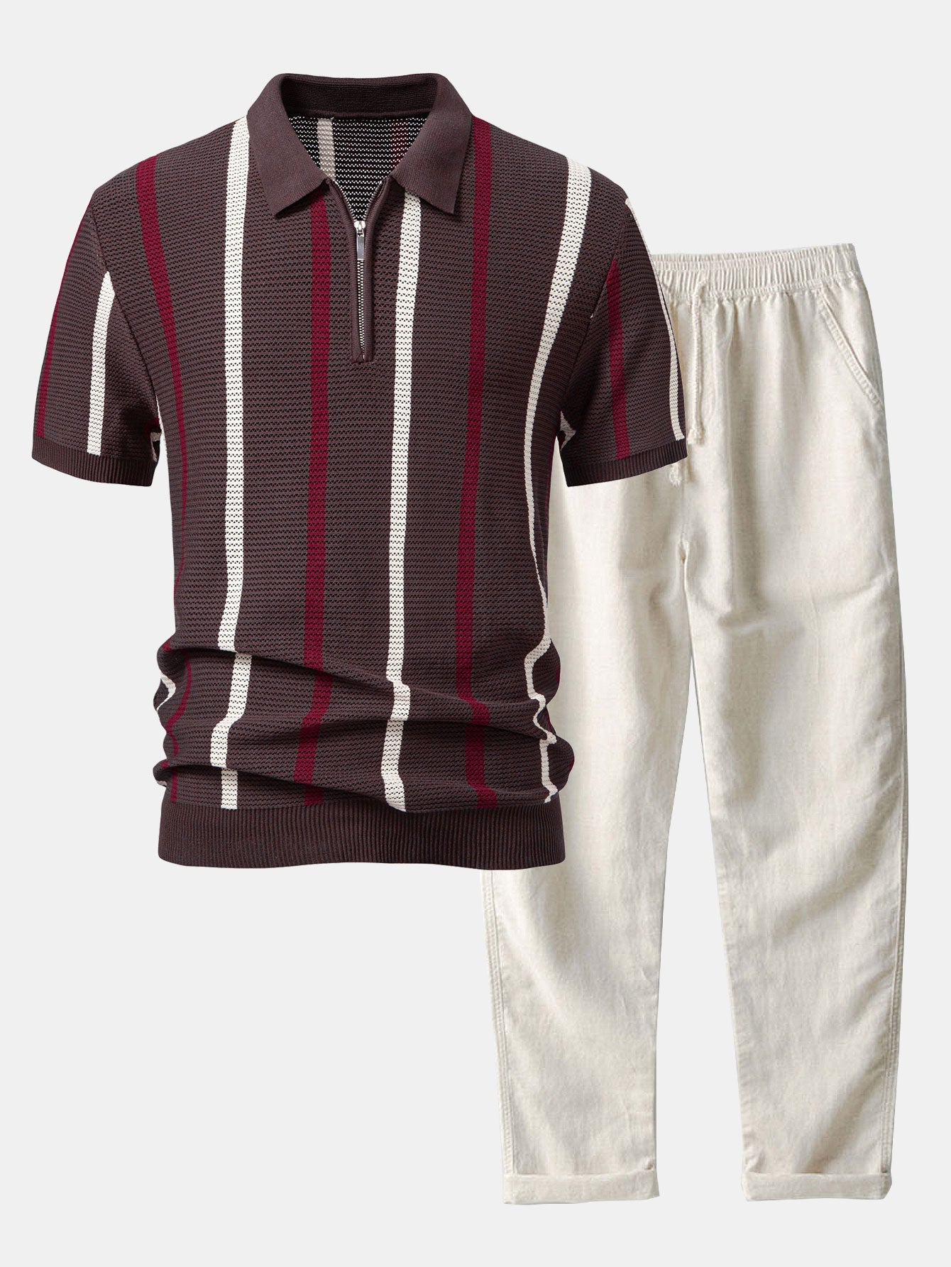 Striped Knit Zip Up Polo Shirt & Straight Leg Linen Pants