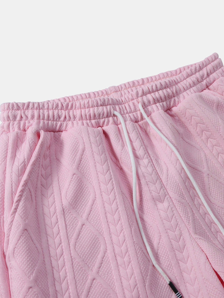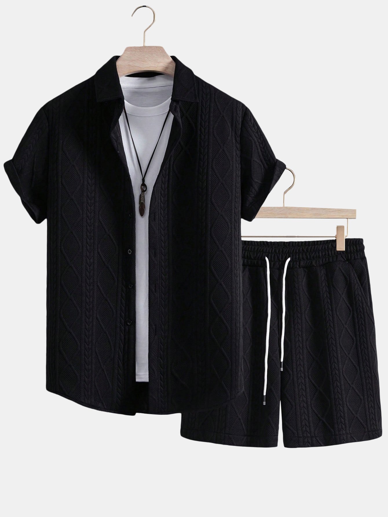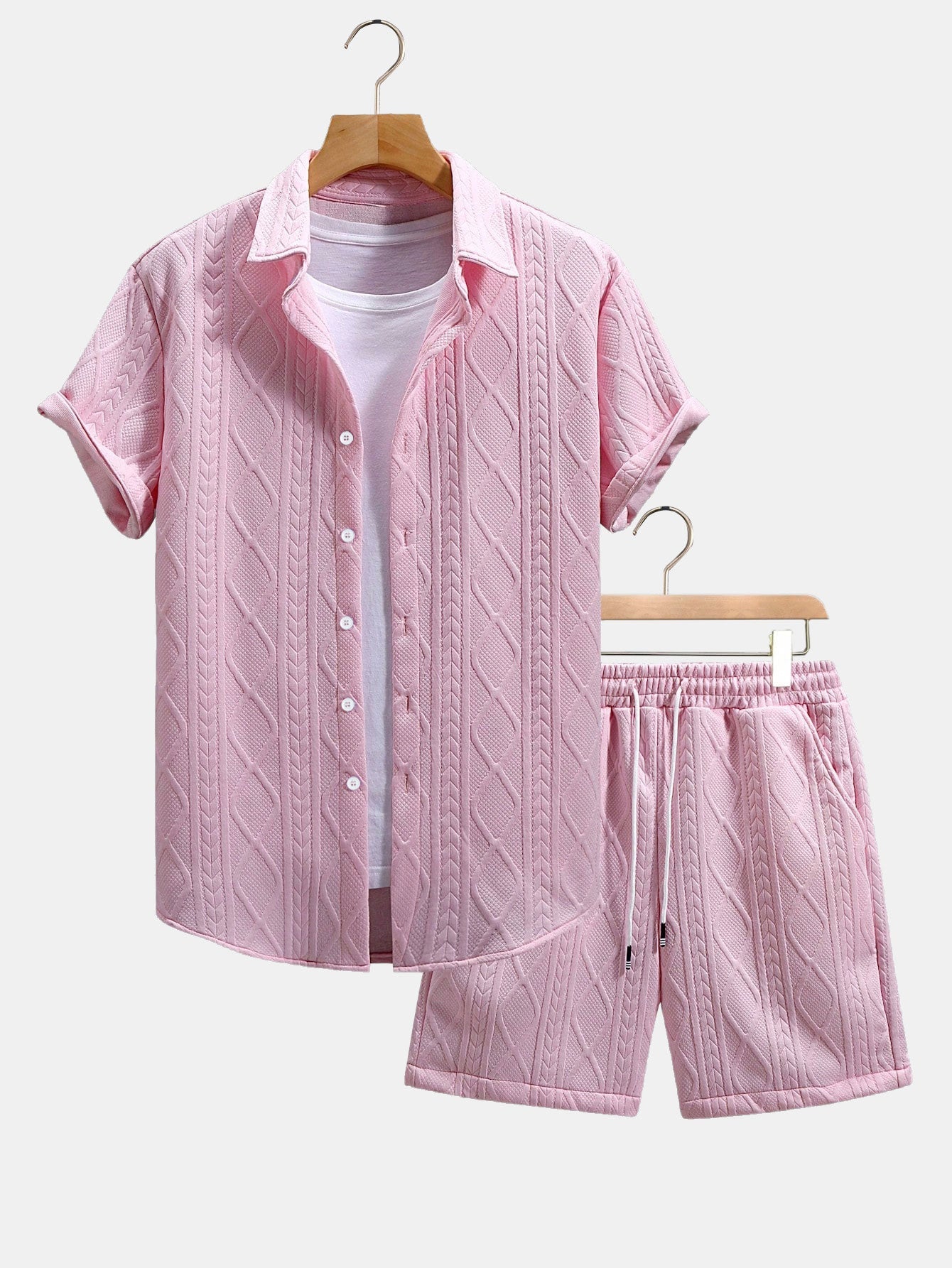 Elevate your summer wardrobe with this matching set featuring a twist geometric jacquard pattern. The short-sleeve button-up shirt offers a relaxed yet refined look, while the adjustable drawstring shorts provide comfort and style for warm weather days. Perfect for beach outings, casual getaways, or laid-back weekends.