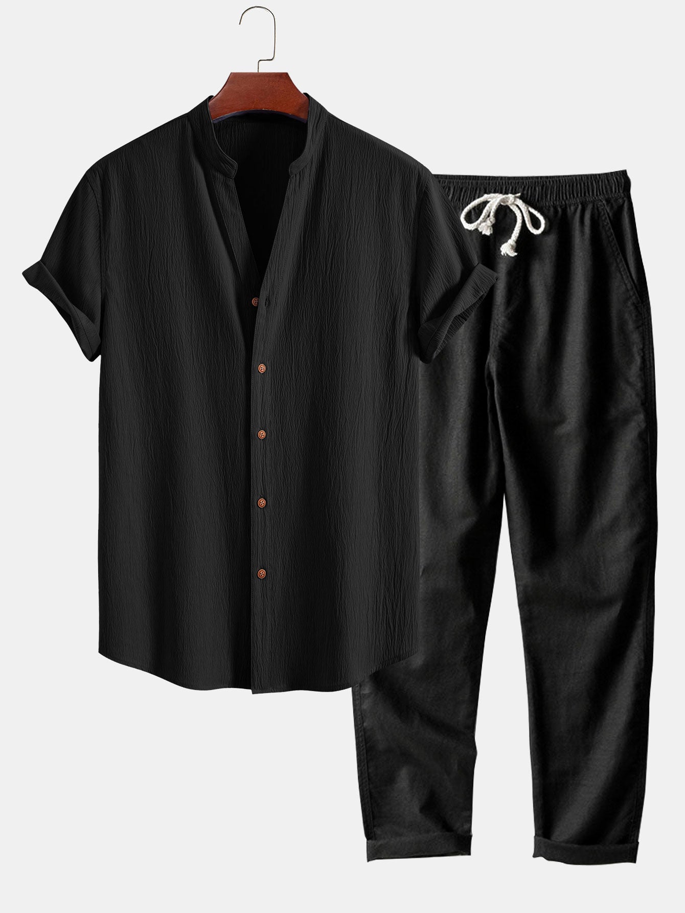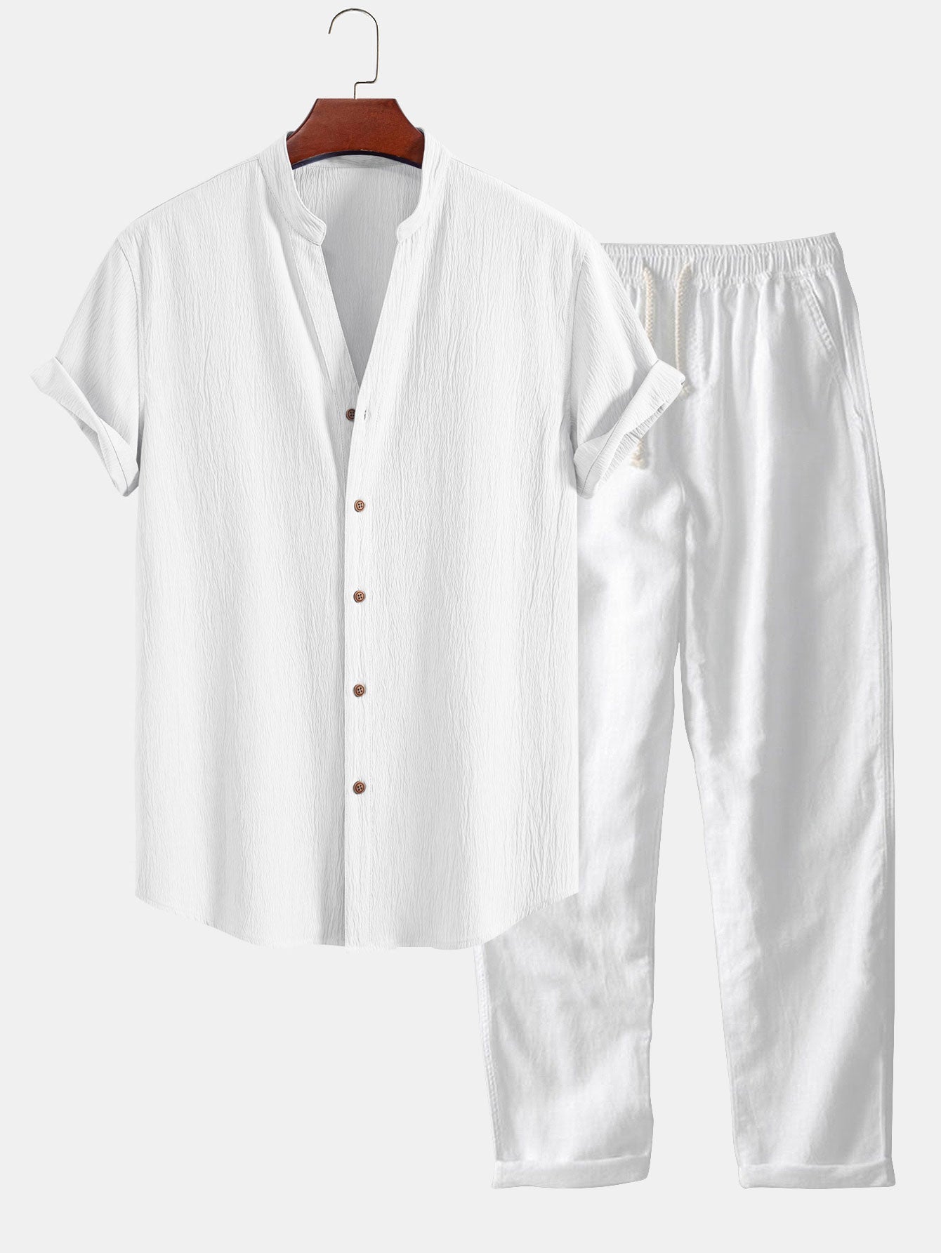 Wrinkled Textured V Neck Shirt & Straight Leg Linen Pants