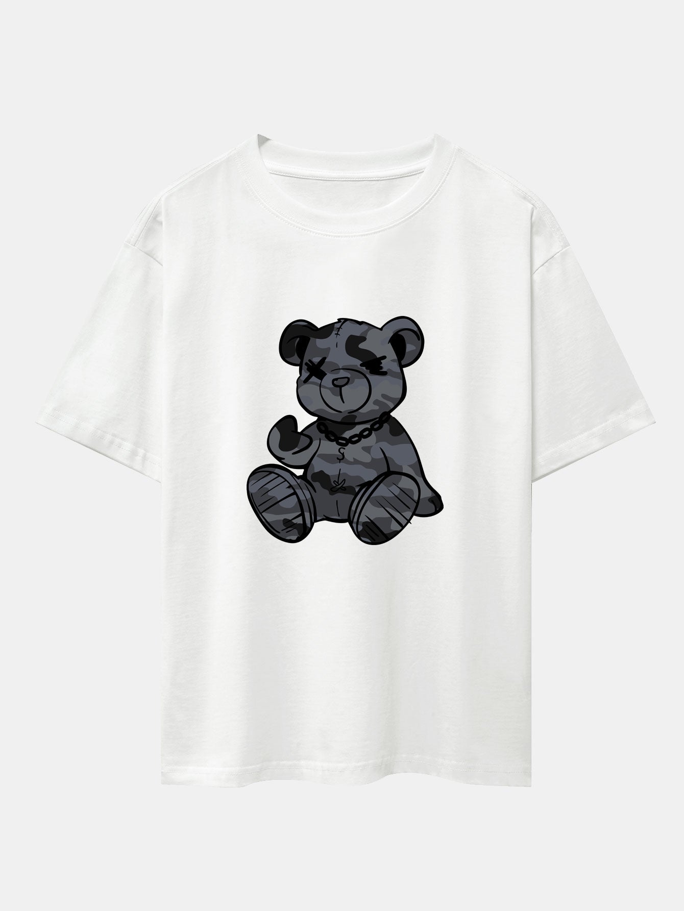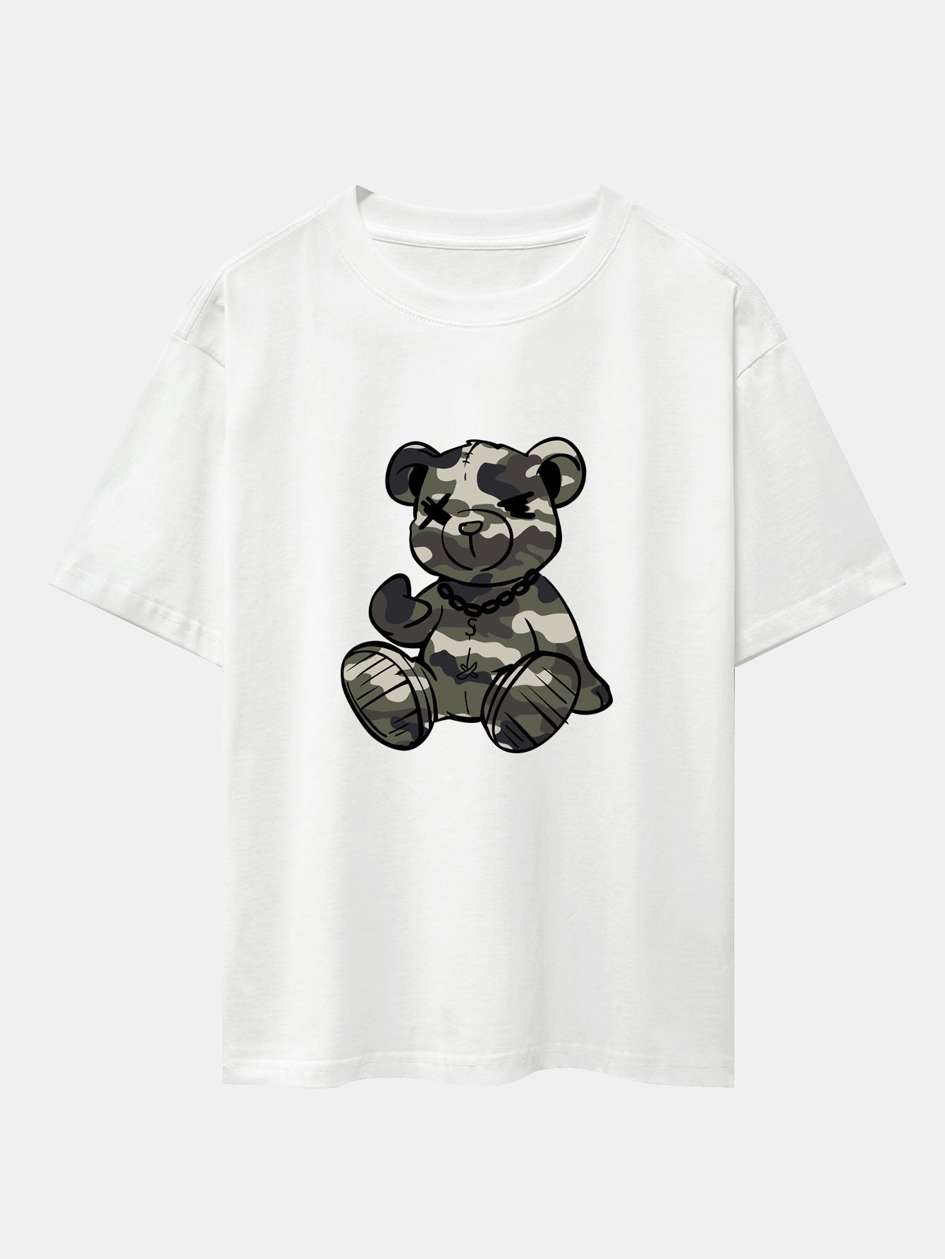 The camouflage bear print drop shoulder oversize T-shirt features a playful bear graphic blended with urban camo, adding a cool twist to classic streetwear. Paired with Drawstring Cargo Shorts, this outfit delivers all-day comfort with utility-inspired edge.