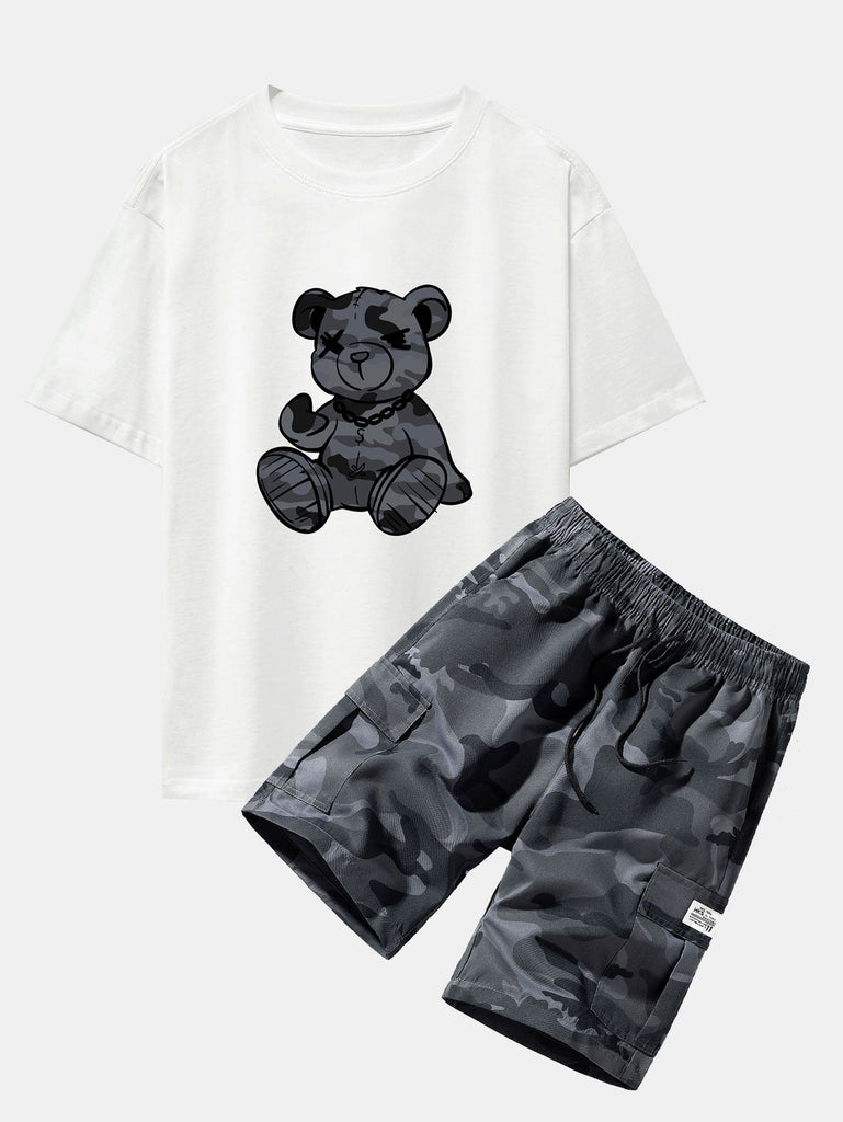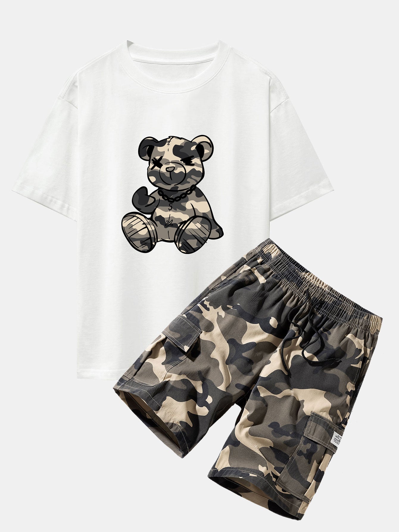 Camouflage Bear Print Drop Shoulder Oversize T-Shirt & Drawstring Cargo Shorts