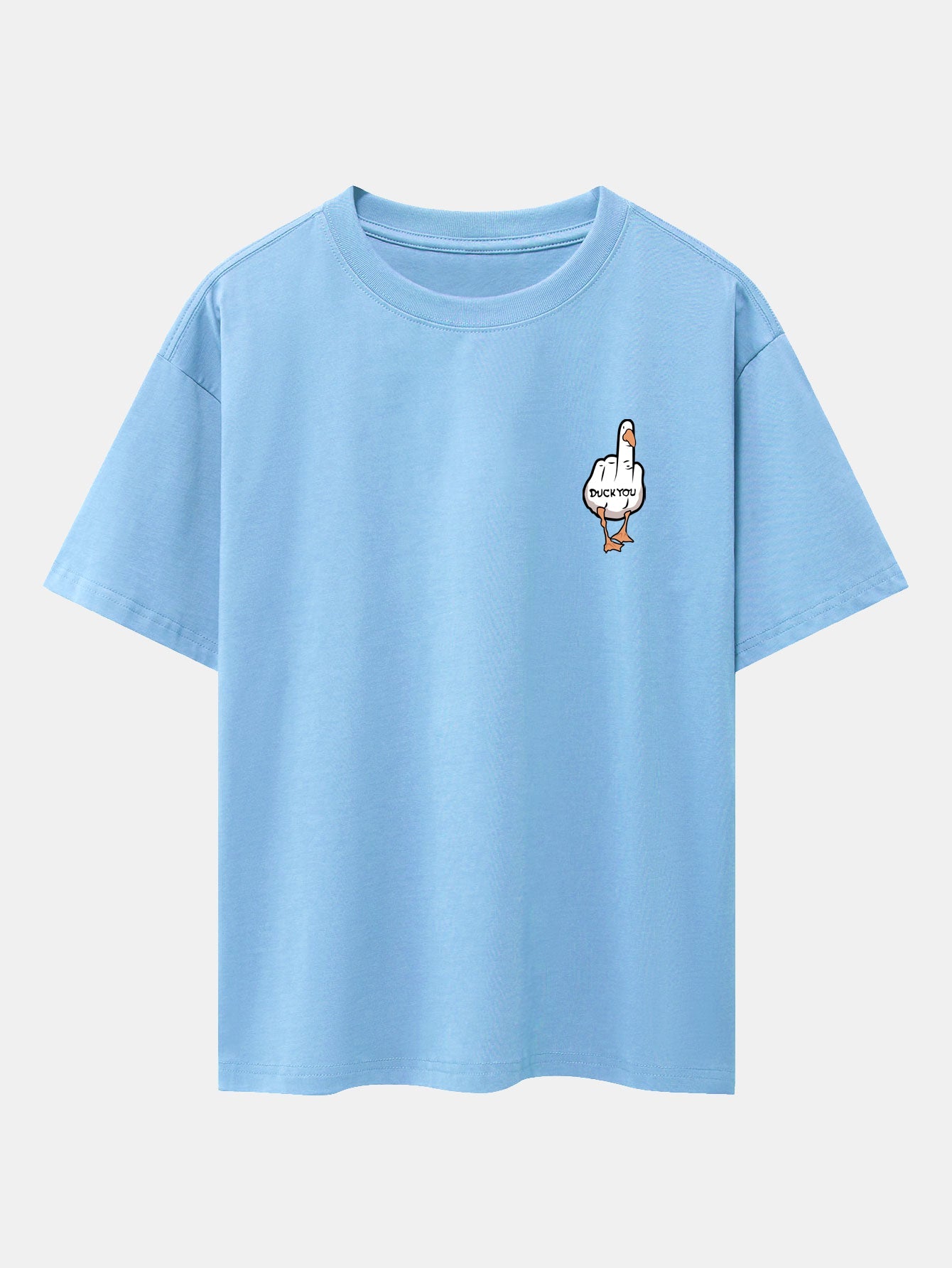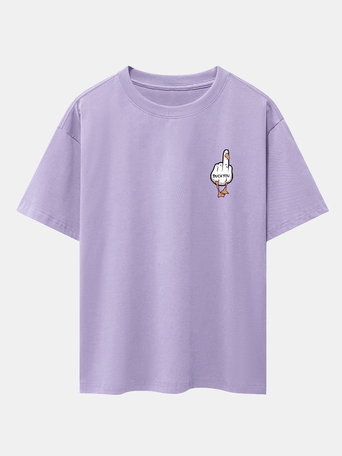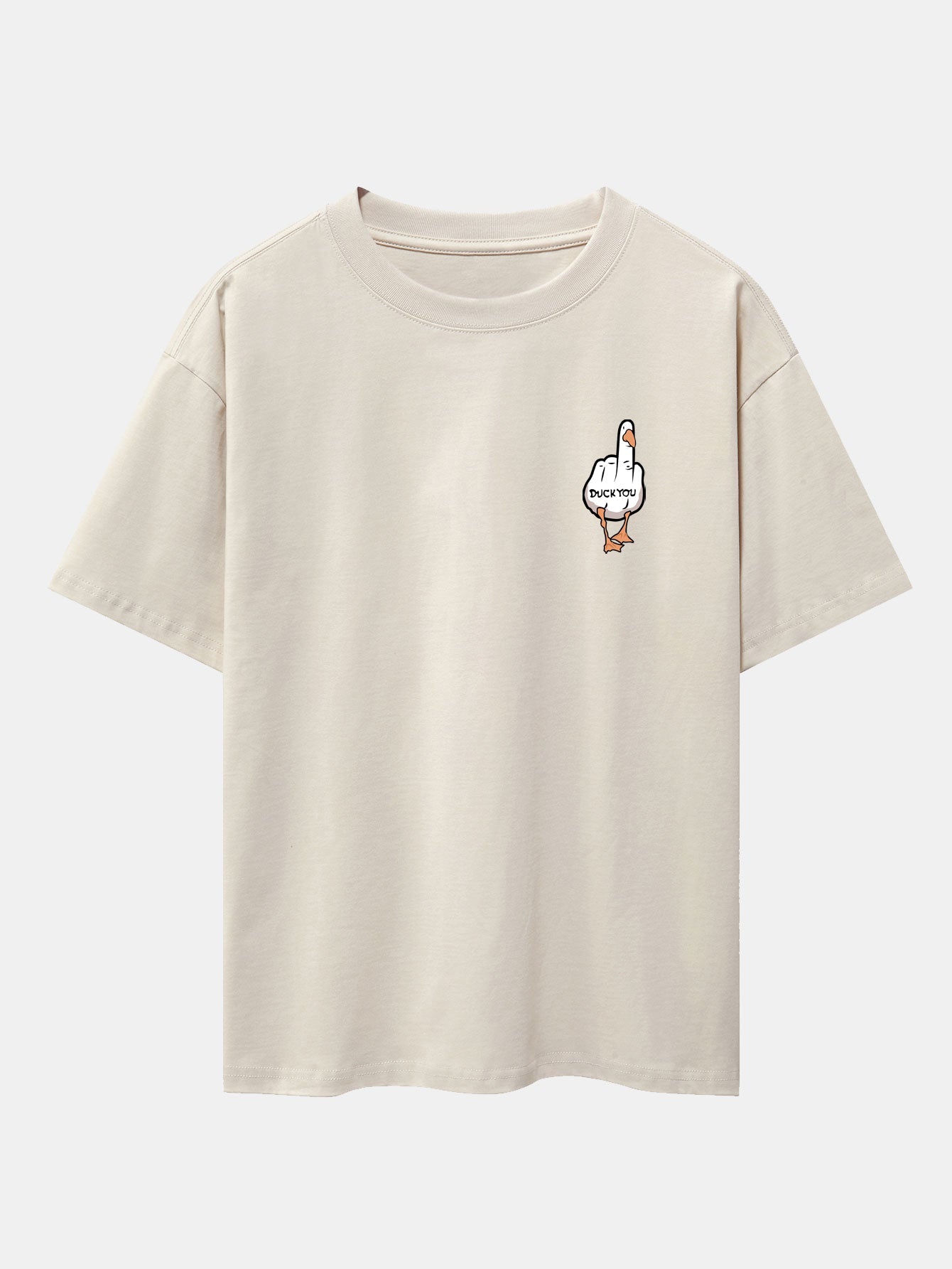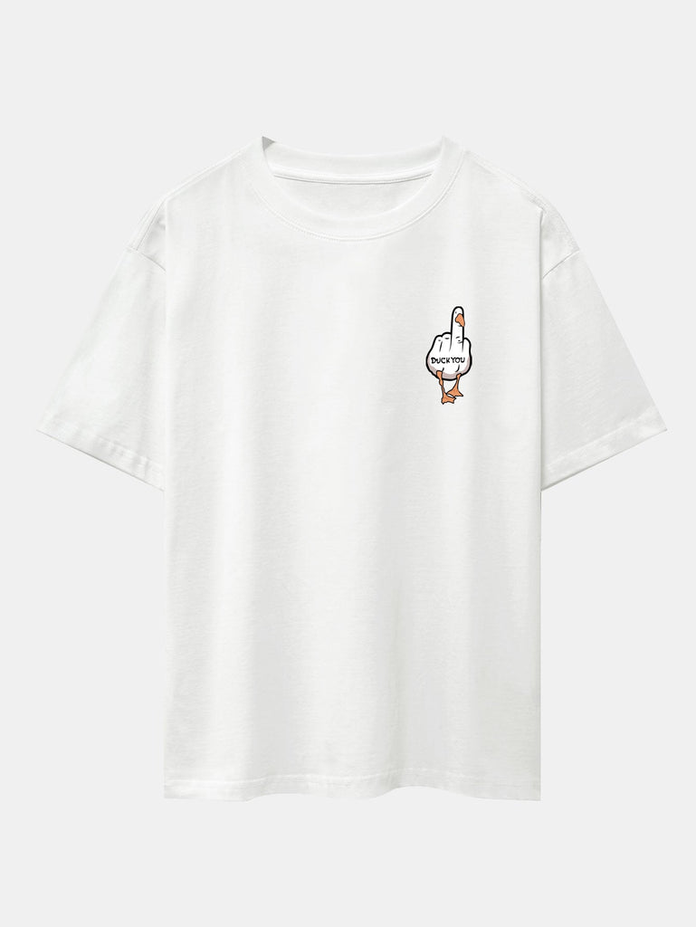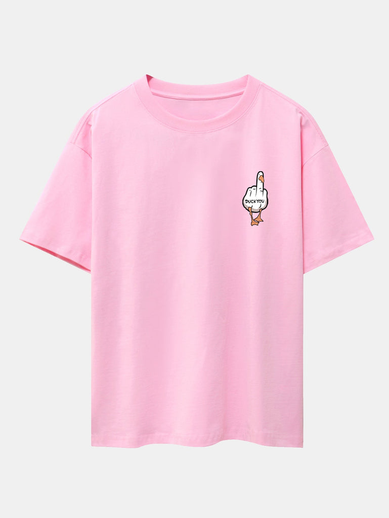 Serve attitude with a smile in this duck you print oversize T-shirt ¡ª the perfect blend of humor, comfort, and streetwear edge. Featuring a cheeky duck flipping the bird and a laid-back drop shoulder silhouette, this tee is made to stand out.