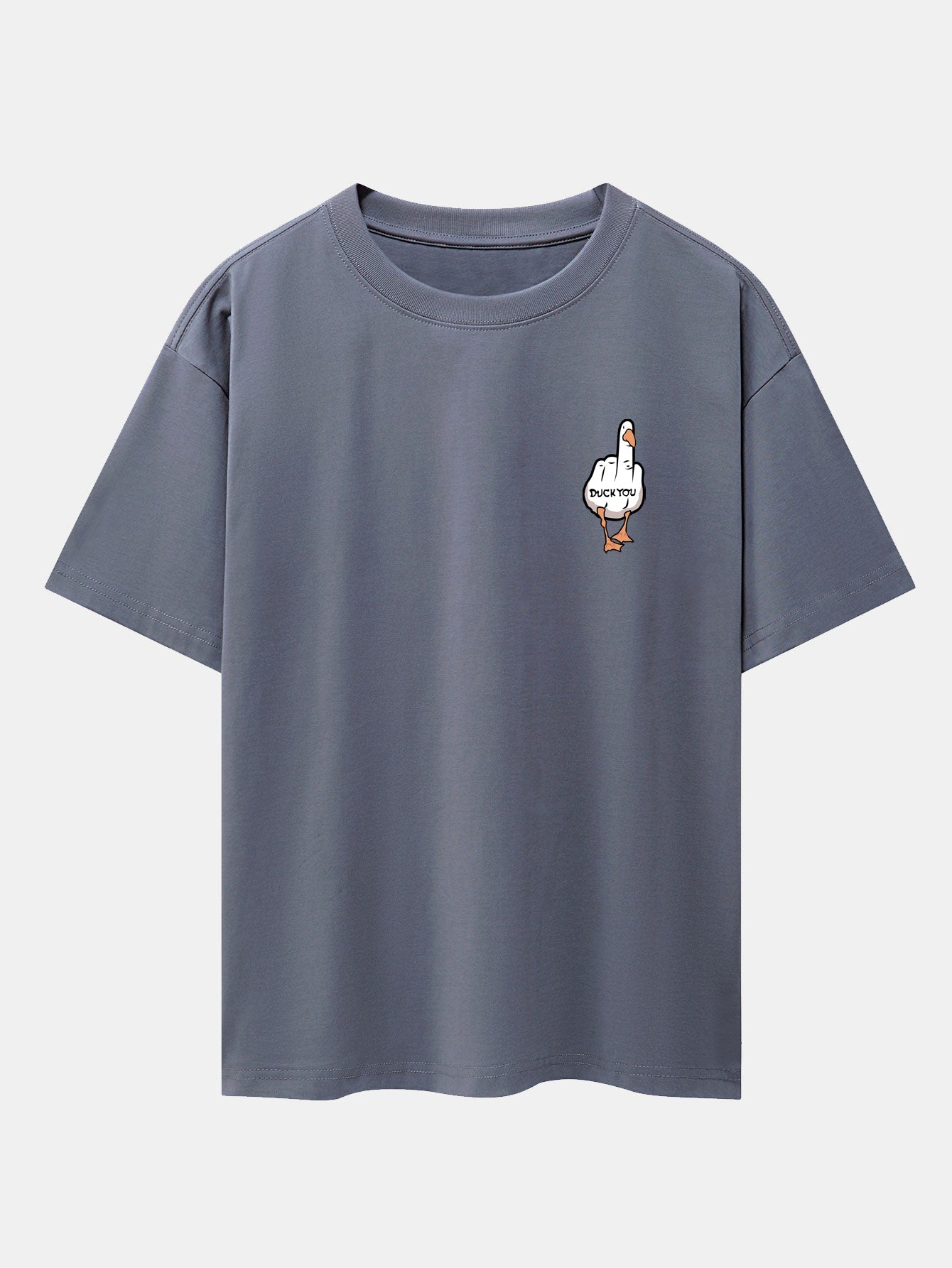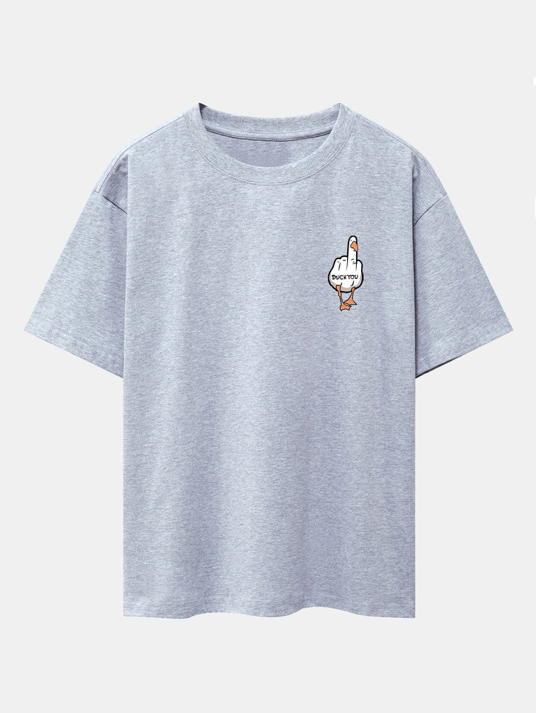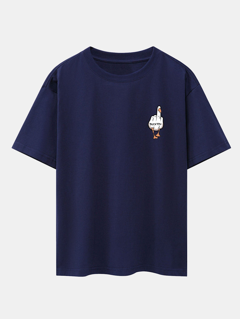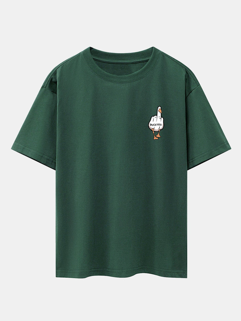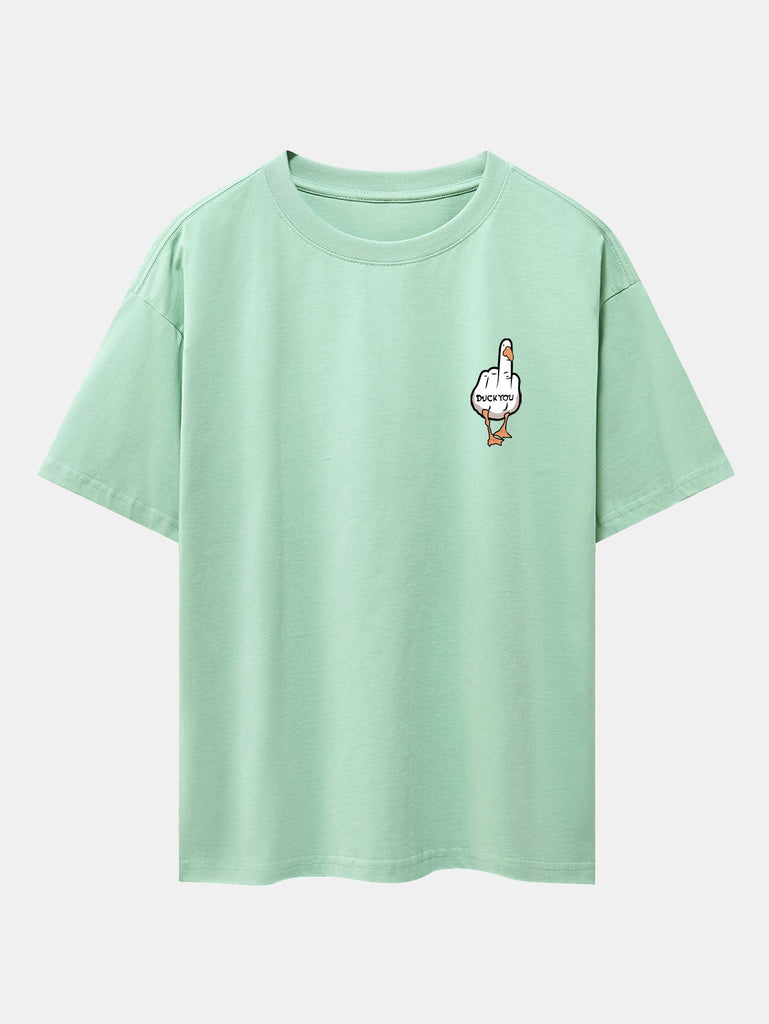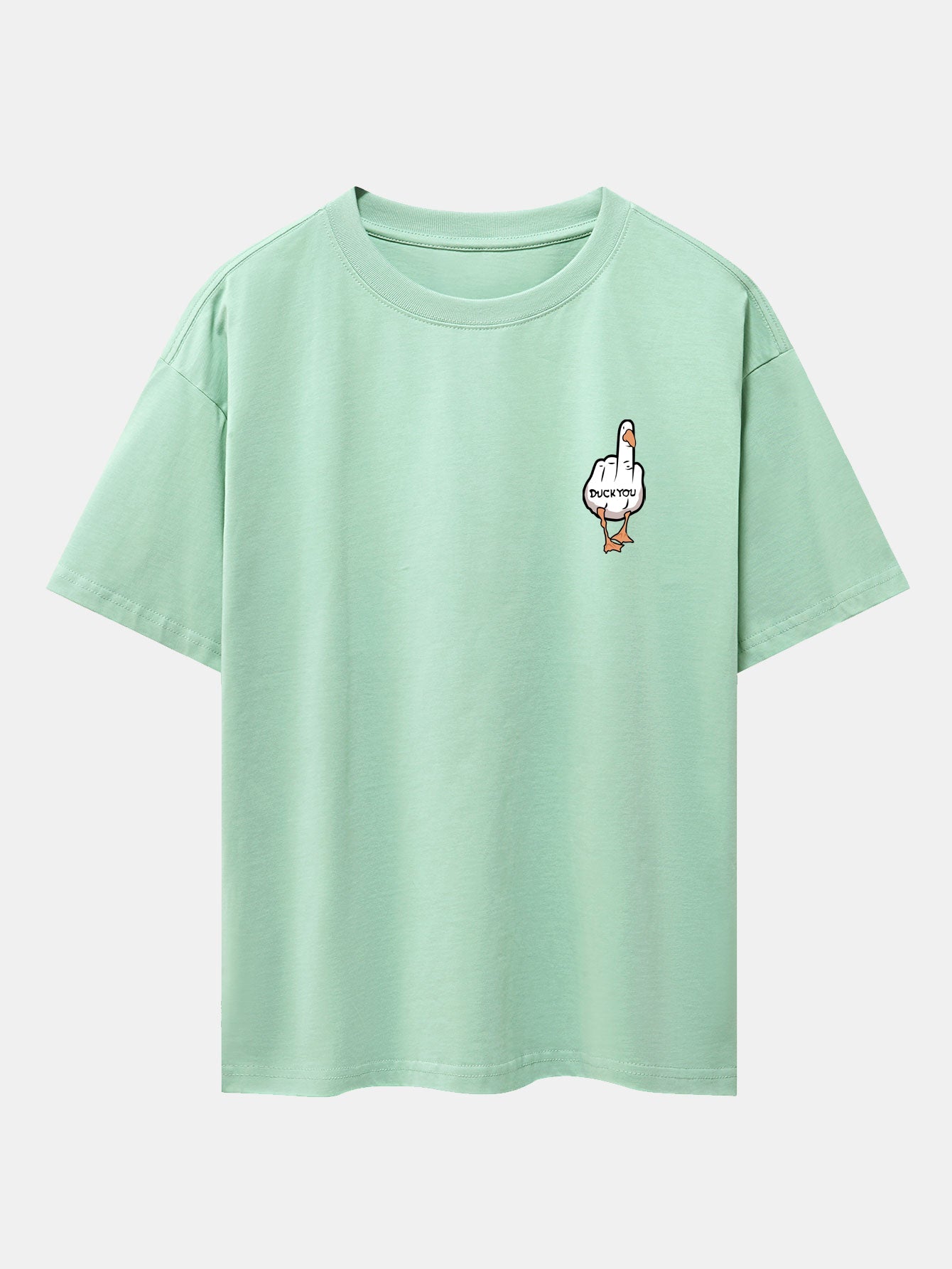 Serve attitude with a smile in this duck you print oversize T-shirt ¡ª the perfect blend of humor, comfort, and streetwear edge. Featuring a cheeky duck flipping the bird and a laid-back drop shoulder silhouette, this tee is made to stand out.