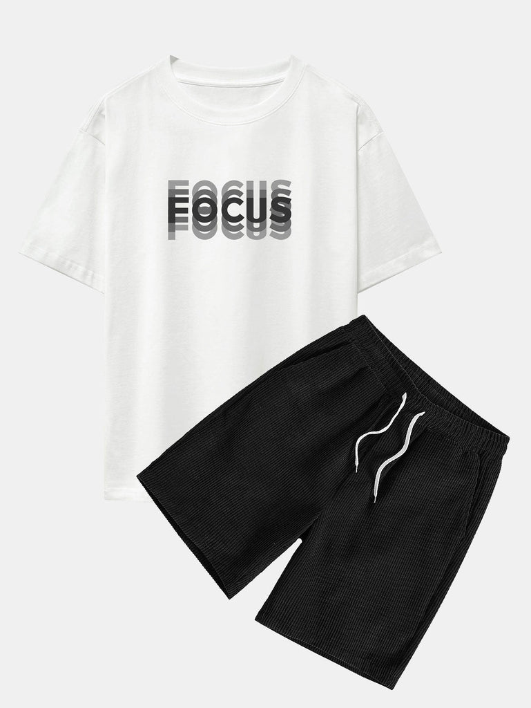 Stay grounded and stylish in this effortlessly cool two-piece set featuring a motivational "Focus" slogan print. Designed for comfort and casual vibes, this set includes a relaxed drop-shoulder tee and ultra-soft corduroy shorts ¨C perfect for off-duty days or laid-back streetwear.