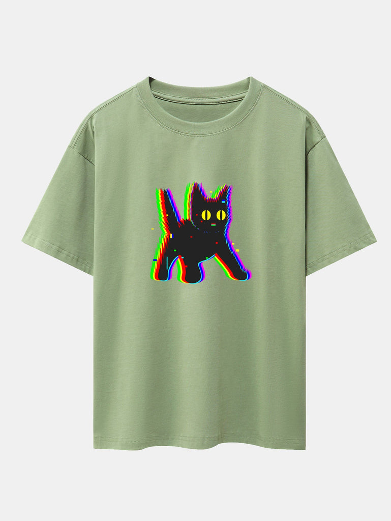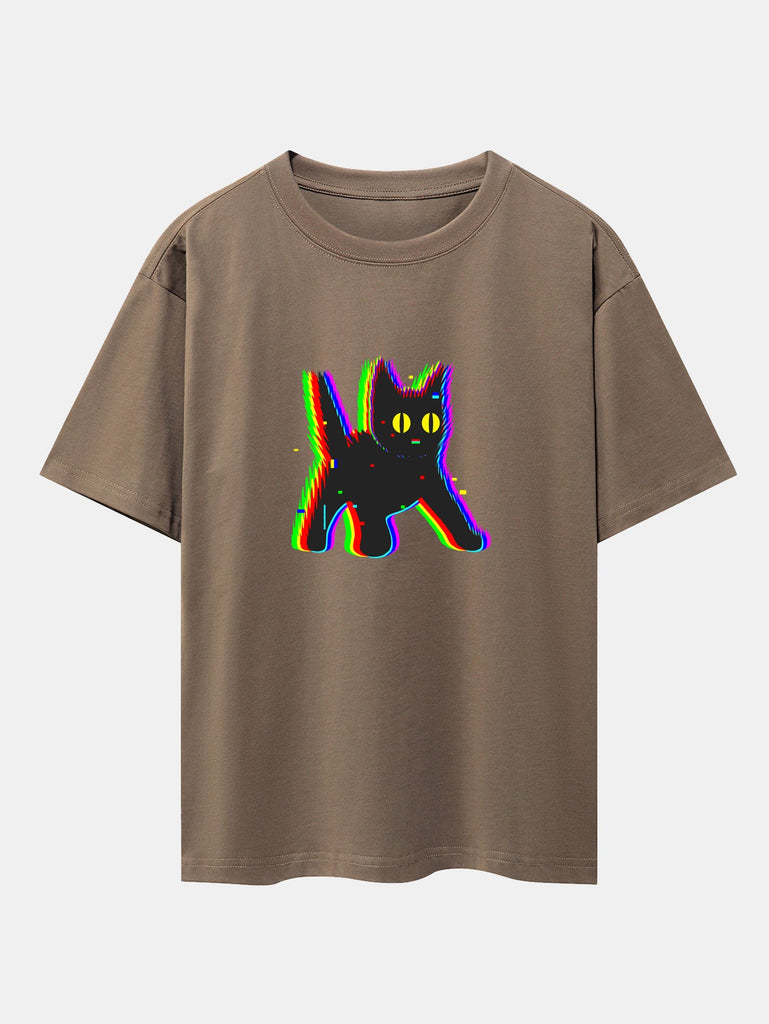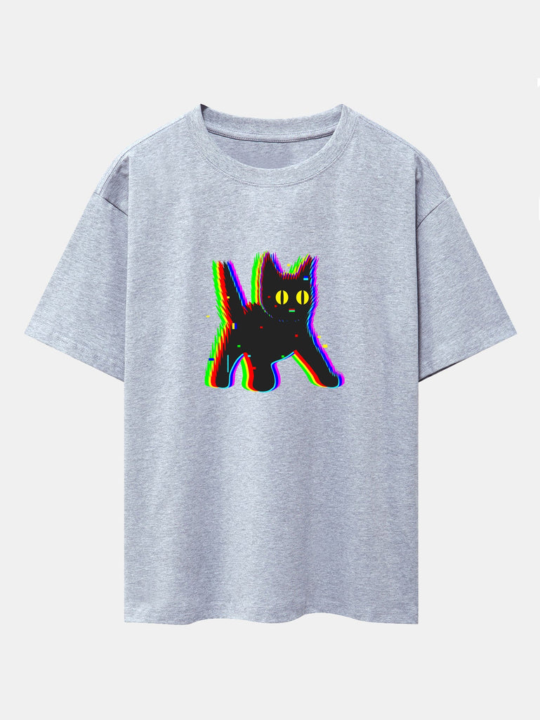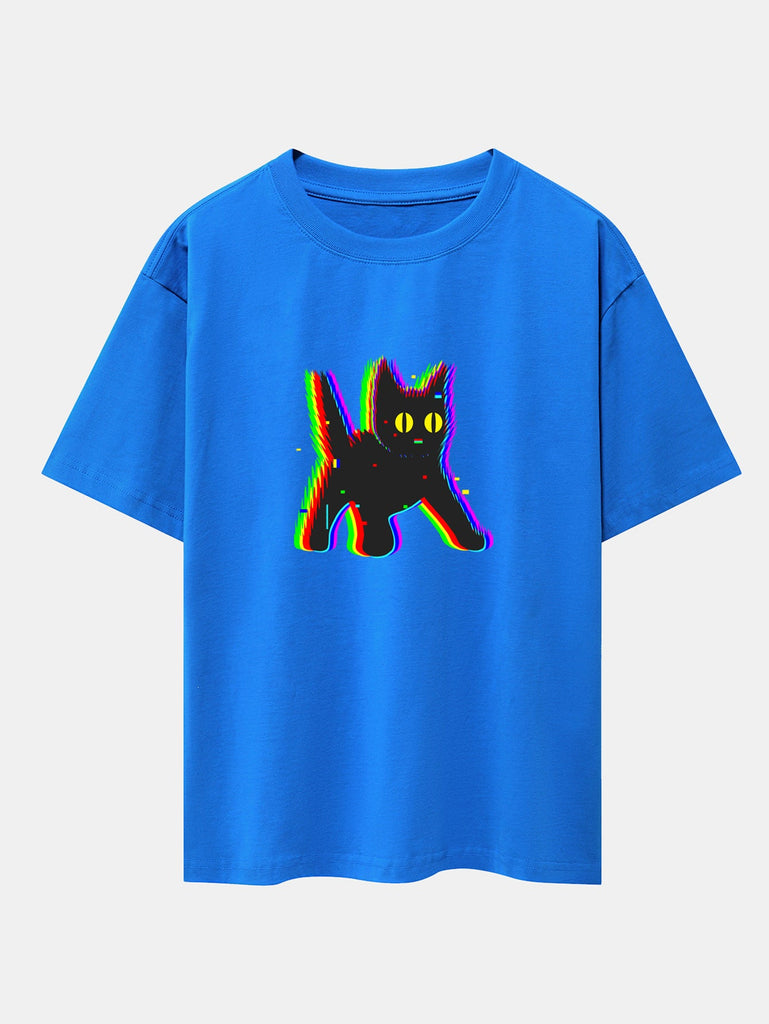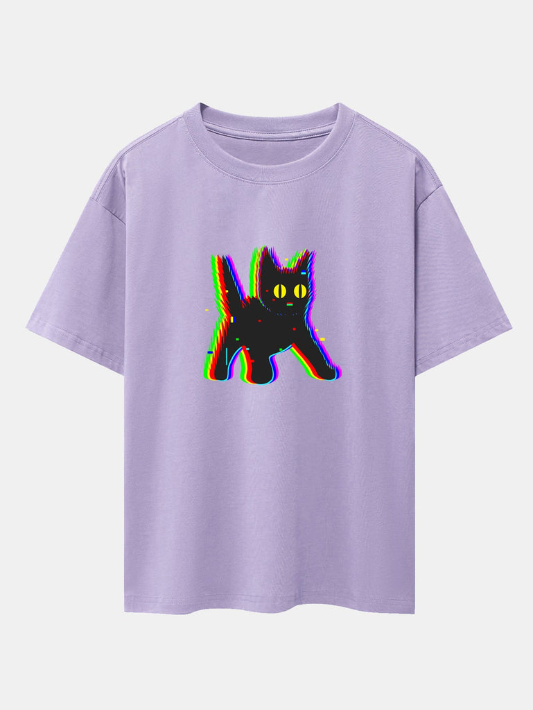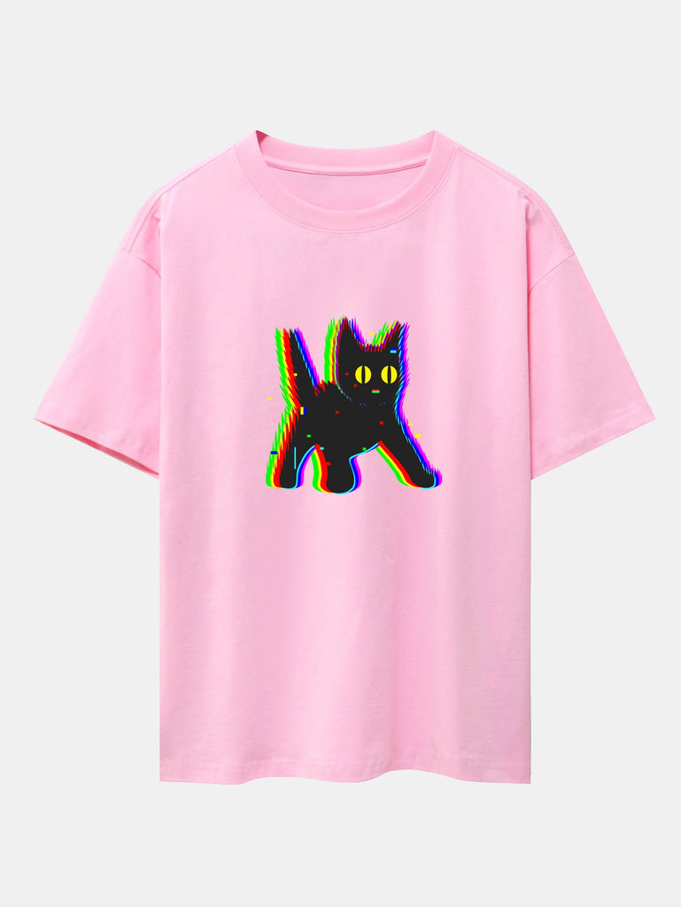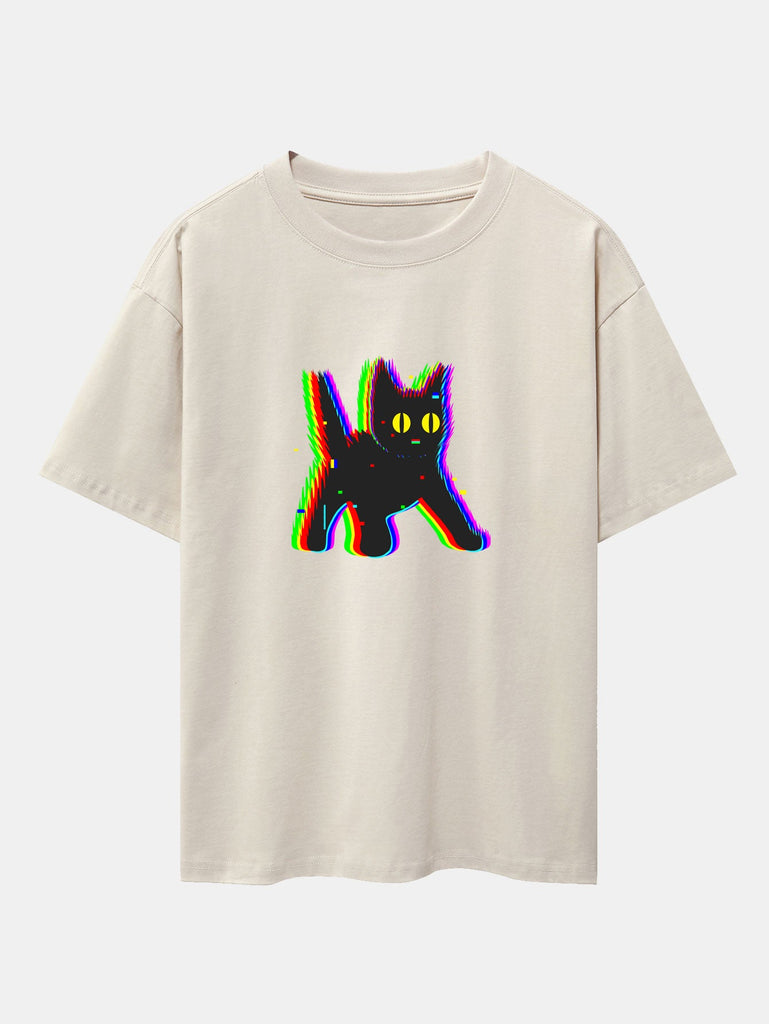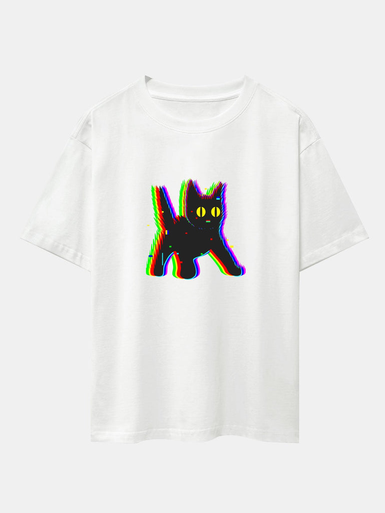 Glitch Black Cat Print Drop Shoulder Oversize T-Shirt