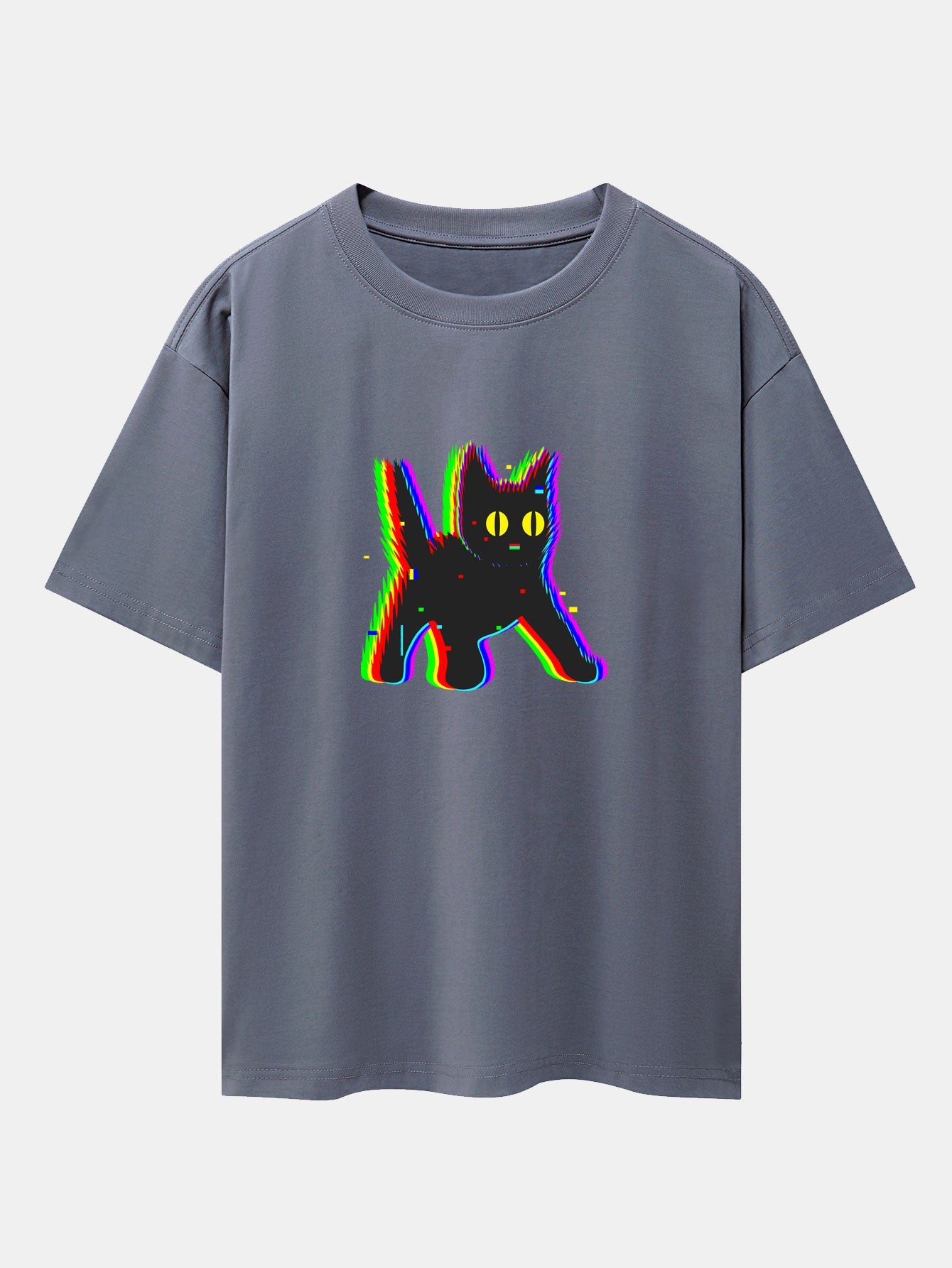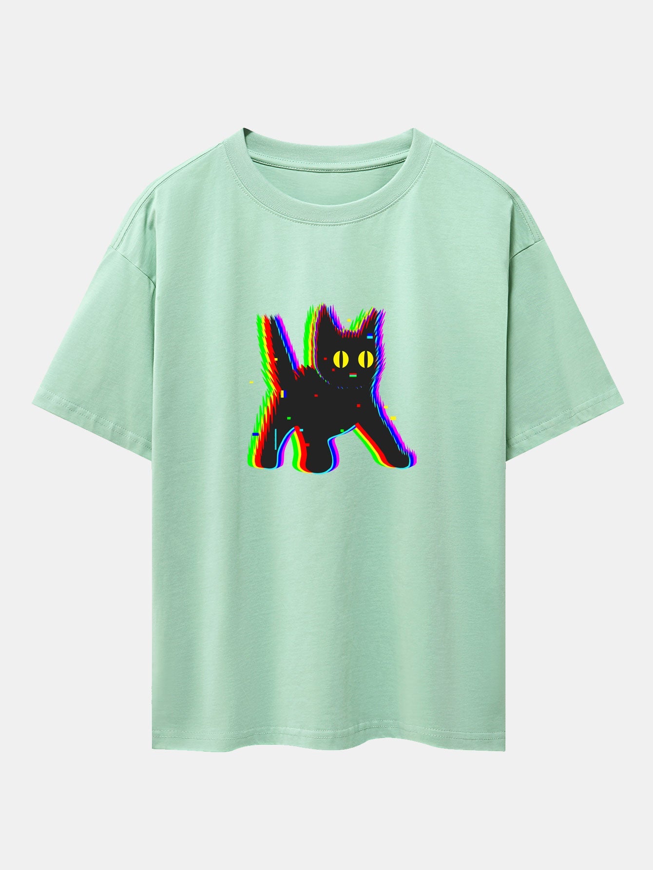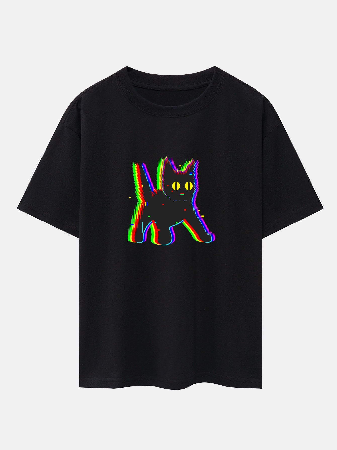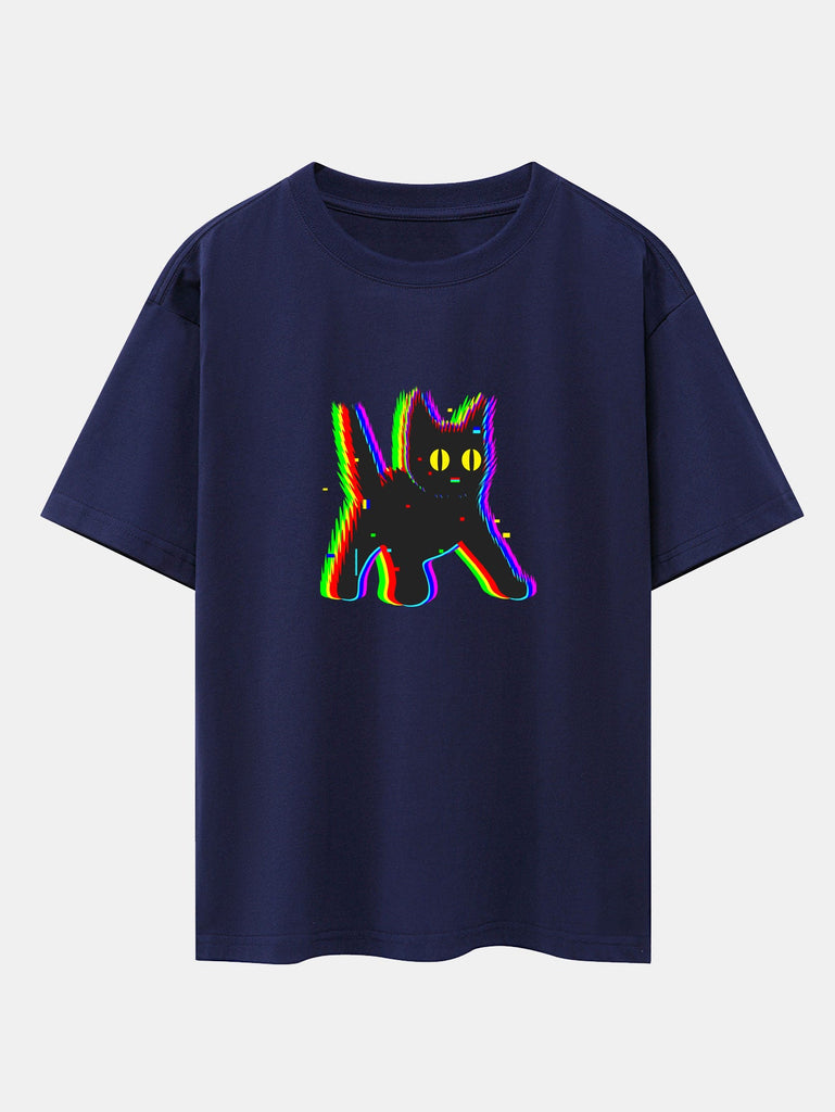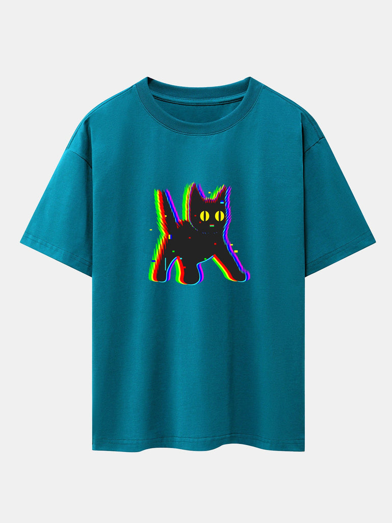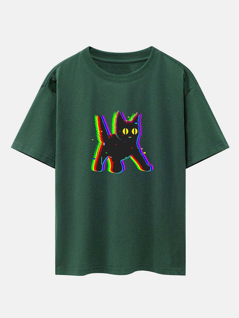 Glitch Black Cat Print Drop Shoulder Oversize T-Shirt