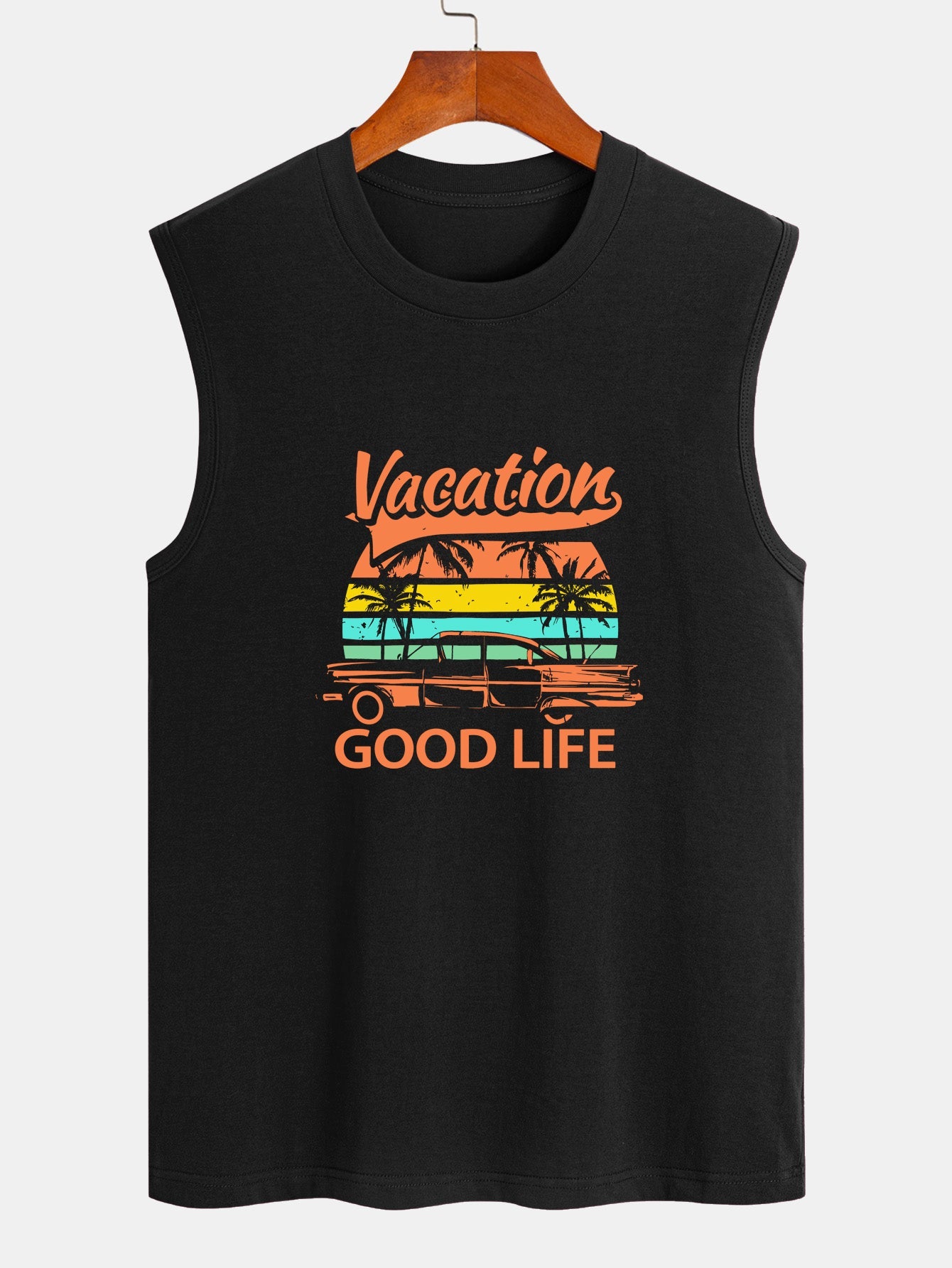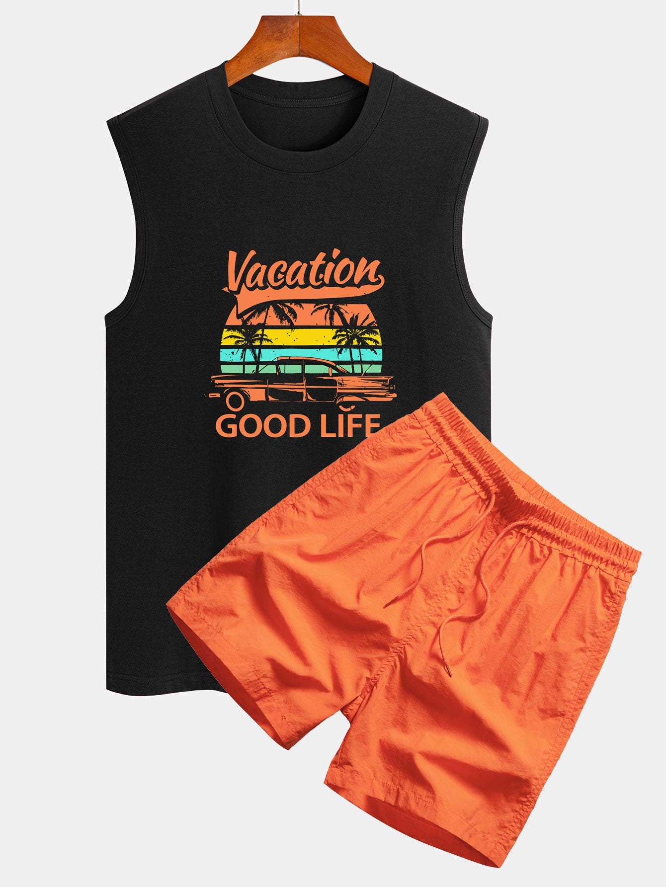 Good Life On Vacation Print Cotton Sleeveless T-Shirt & Drawstring Swim Shorts