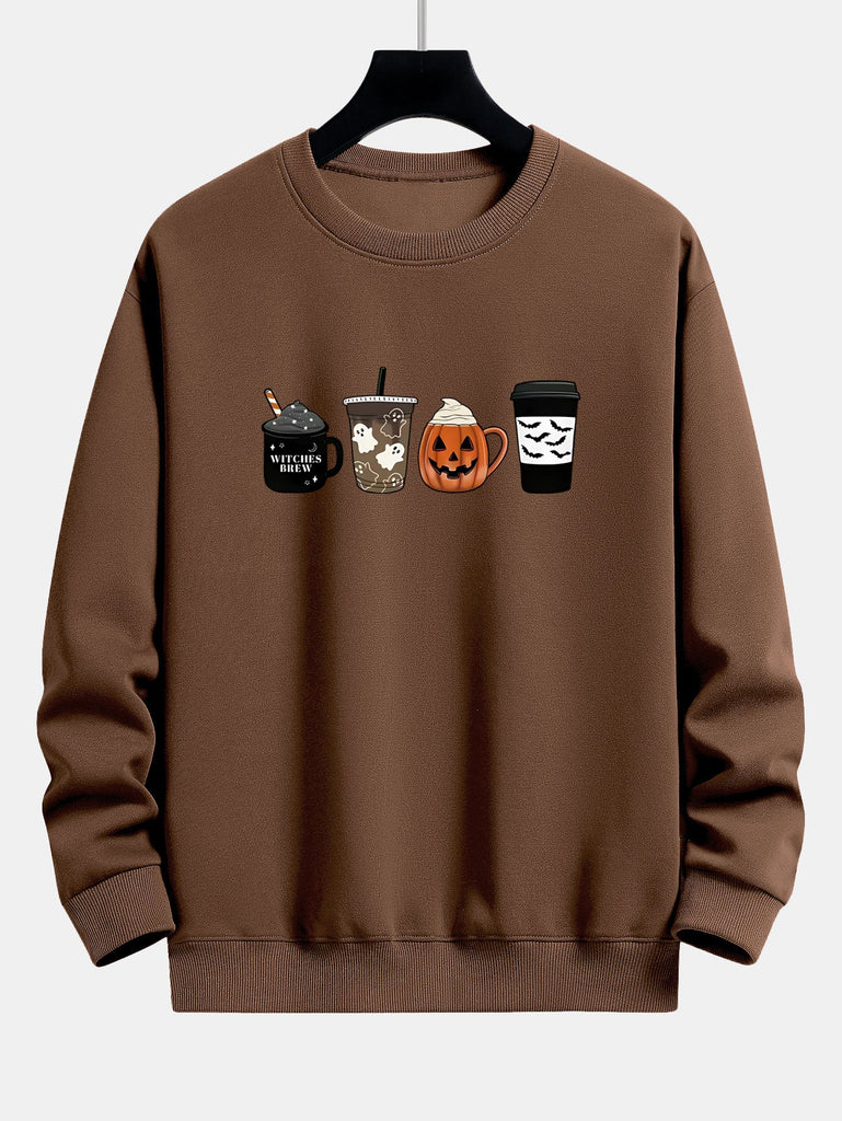 Sip in spooky style with our Halloween themed drinks print relax fit sweatshirt. Featuring playful illustrations of festive beverages¡ªfrom pumpkin spice lattes to ghostly brews¡ªthis sweatshirt adds a fun and cozy seasonal touch to your fall wardrobe.