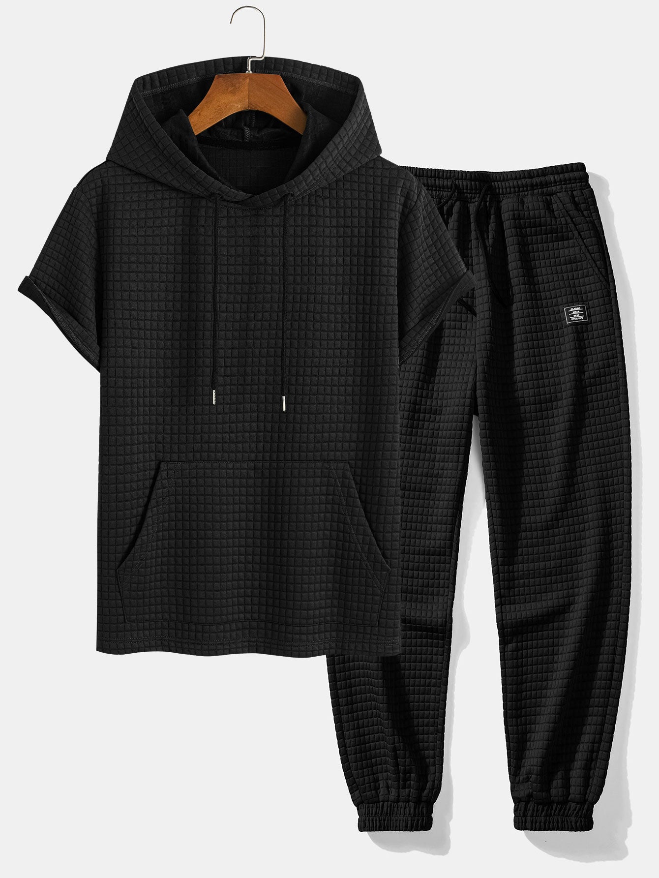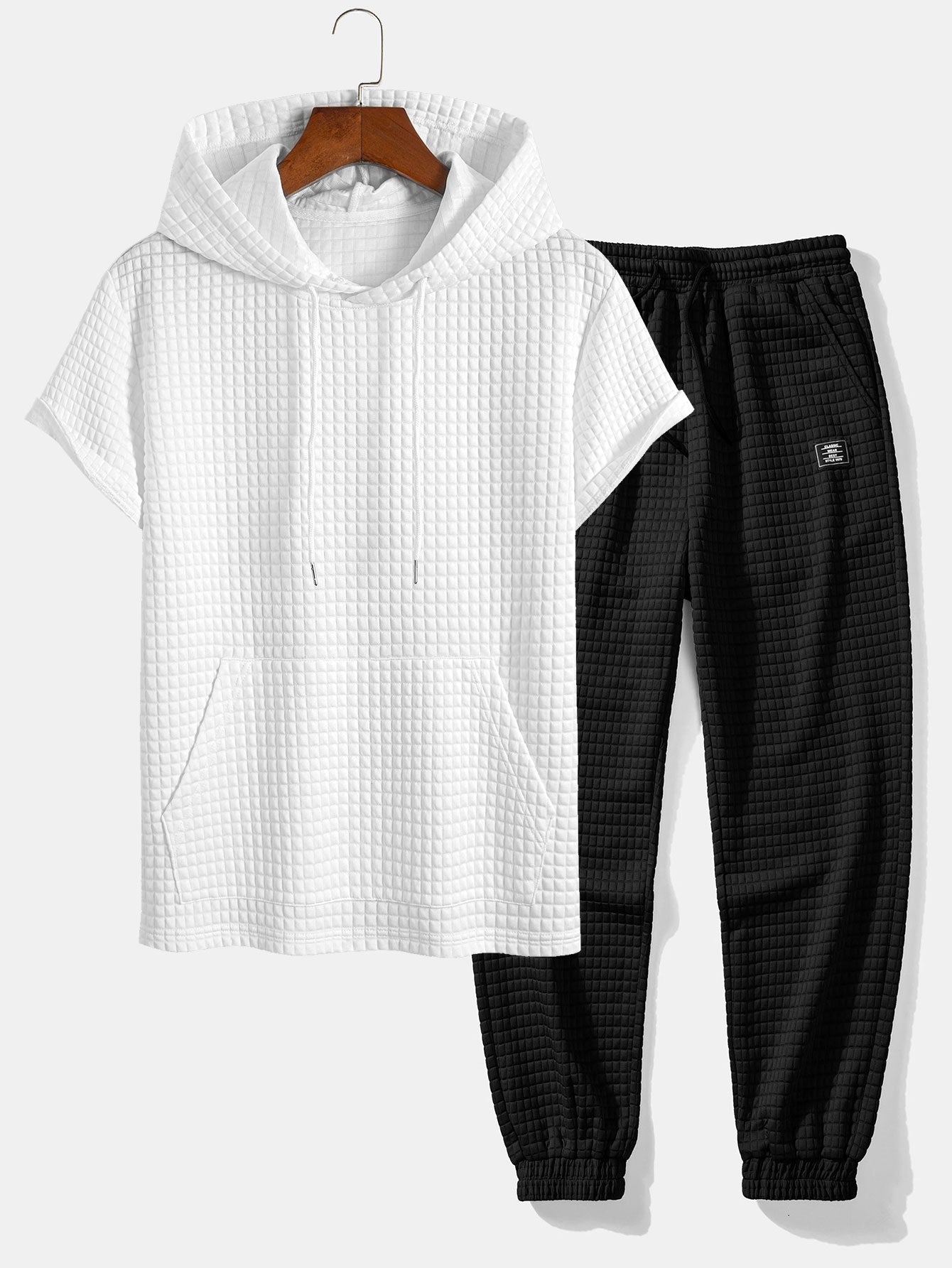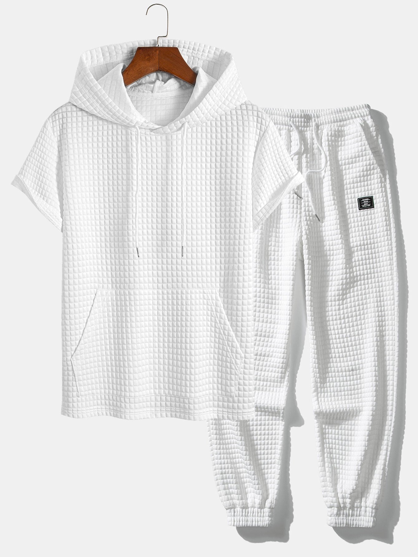 Kangaroo Pocket Waffle Hooded T-Shirt & Drawstring Waffle Jogger Pants