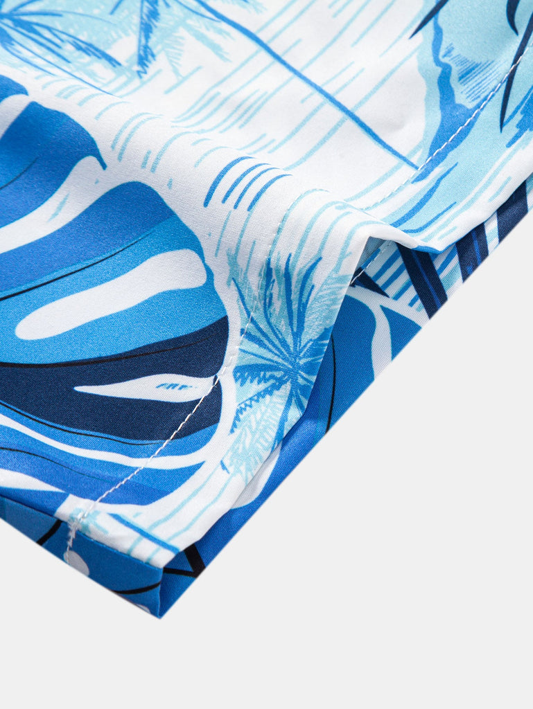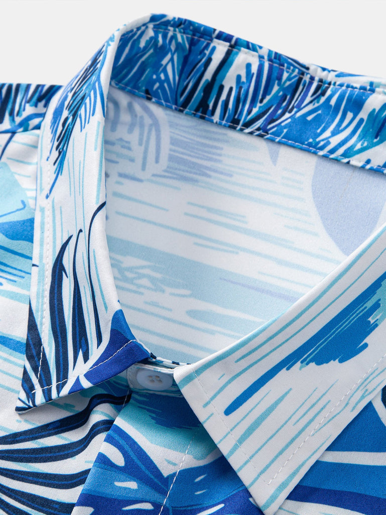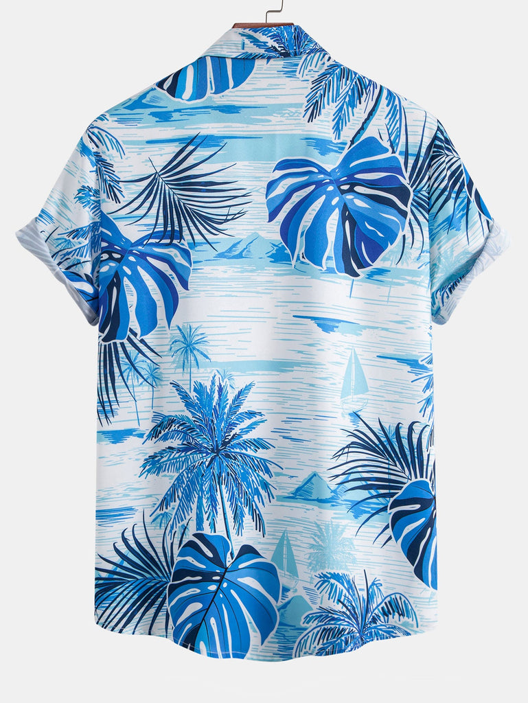 Designed for summer vacations, this men's short-sleeved shirt features a refreshing blue and white color scheme, with tropical palm leaves and sailboat prints, creating a relaxing holiday atmosphere. Made of lightweight fabrics, it is skin-friendly and comfortable. Whether it's a beach party or daily leisure, this shirt is a bright item in your summer wardrobe.