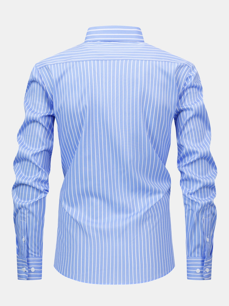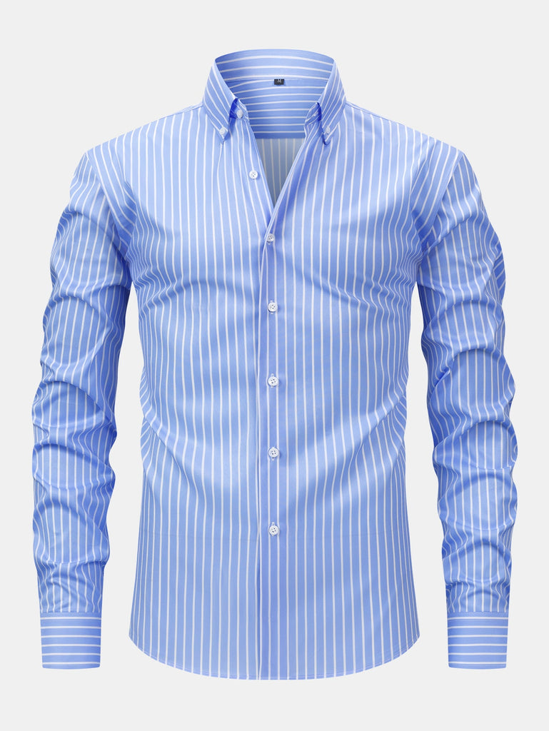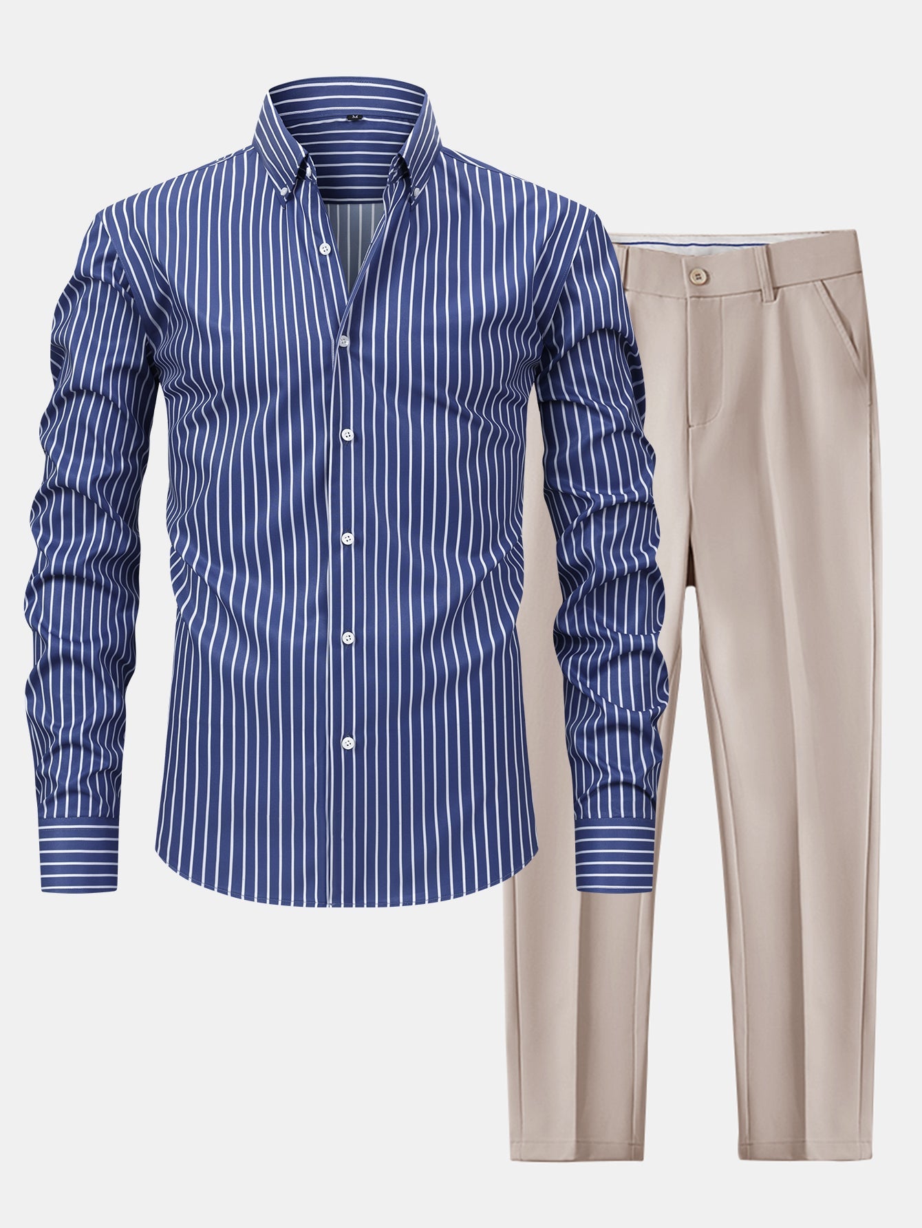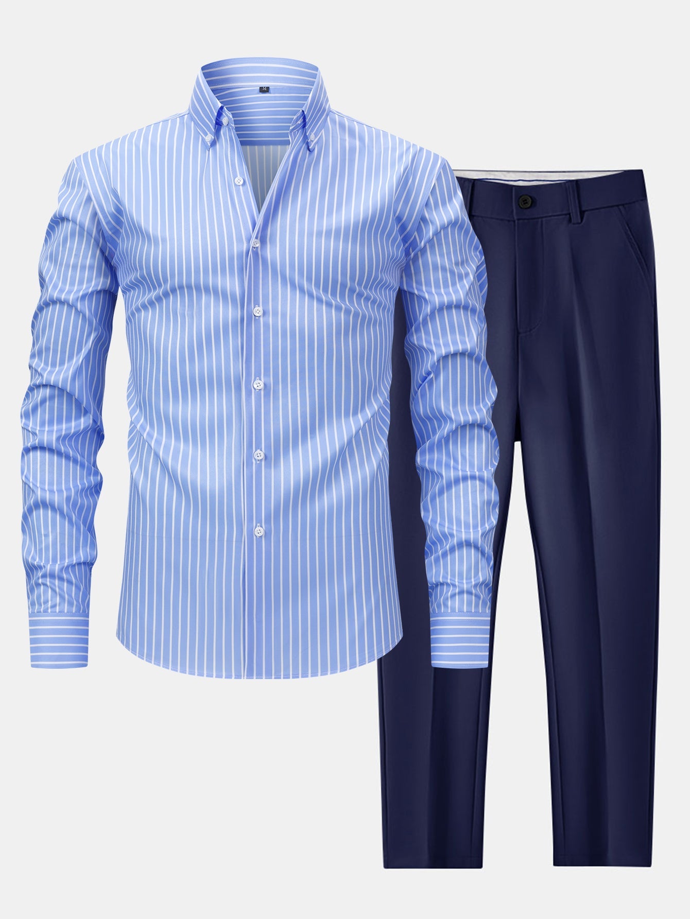 The long sleeve stripe button-up shirt features a clean vertical stripe design and classic collar, offering a refined look that transitions seamlessly from desk to dinner. Paired with slim fit tapered trousers, this set delivers a sharp silhouette with a comfortable stretch fit¡ªperfect for workdays, semi-formal events, or elevated everyday wear.