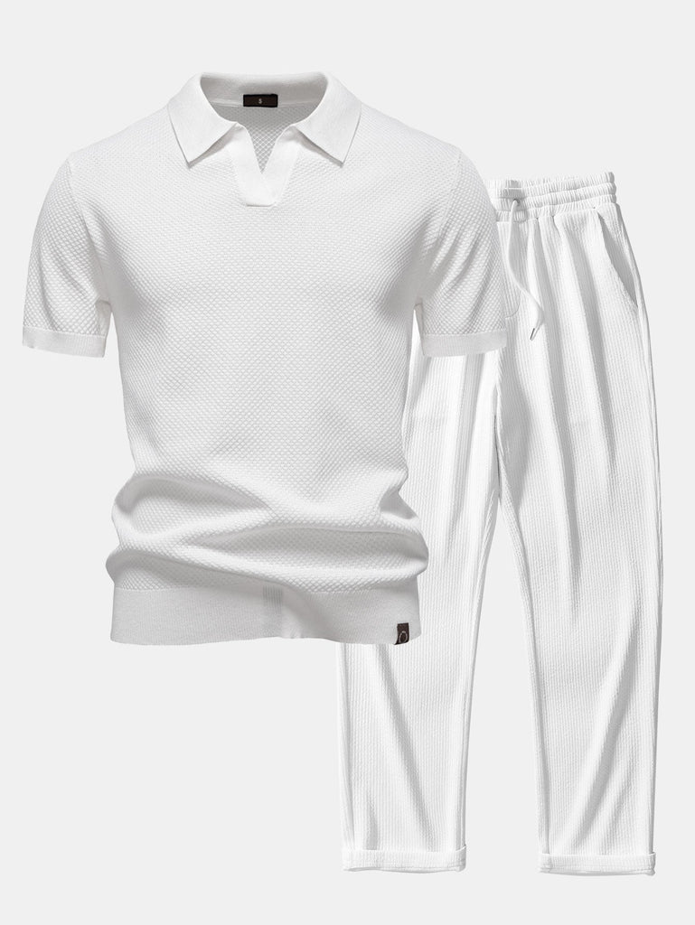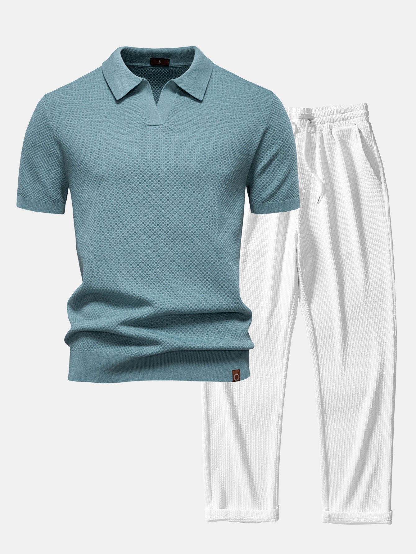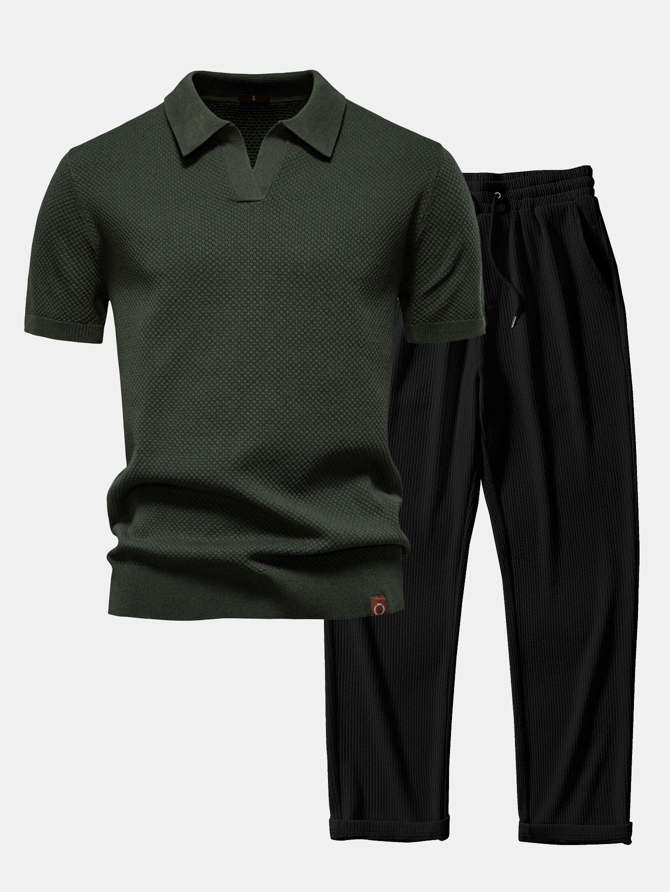 Pineapple Texture Knit V Neck Polo & Straight Leg Ribbed Pants