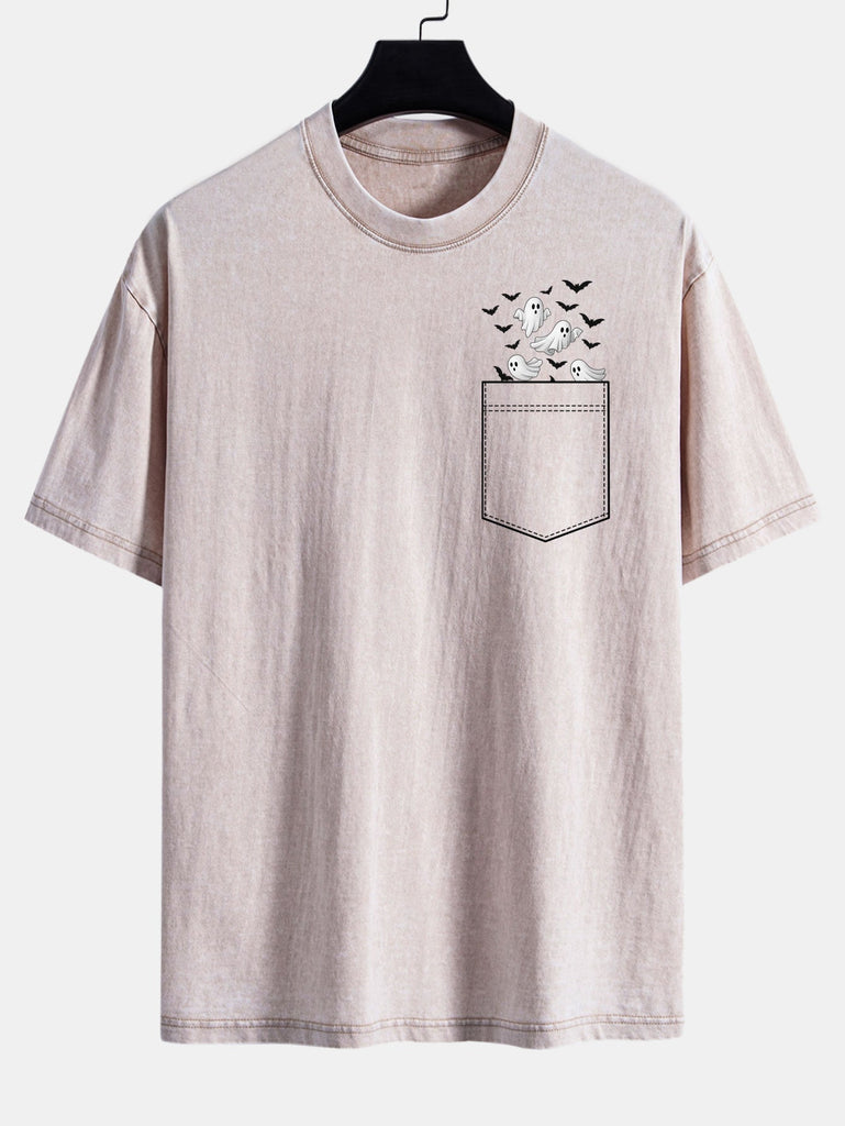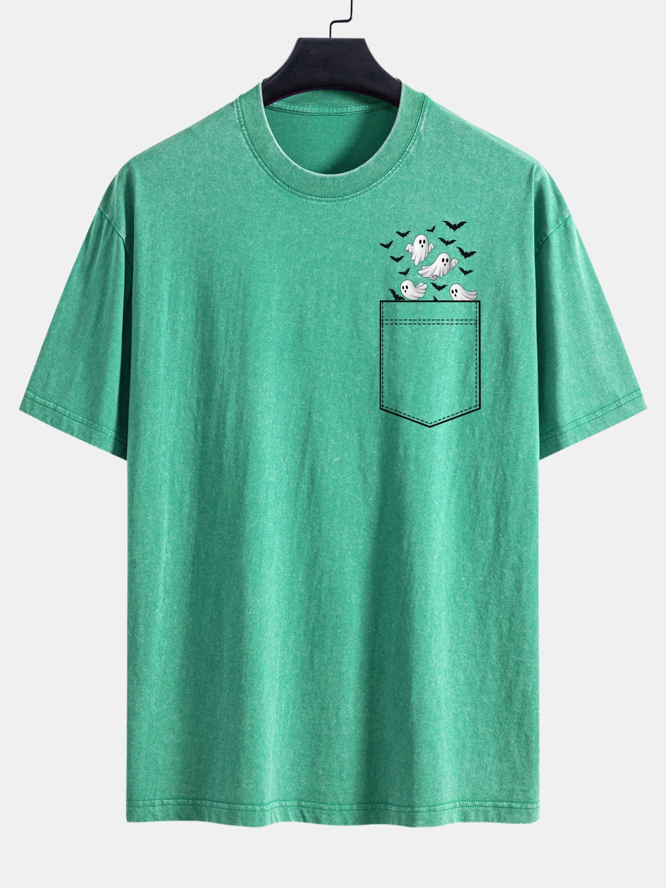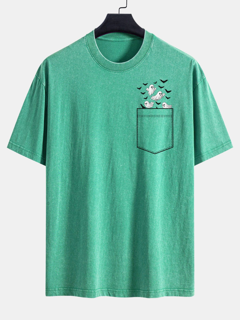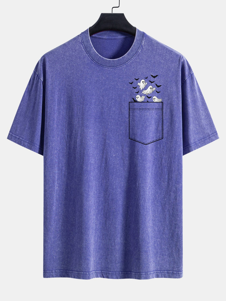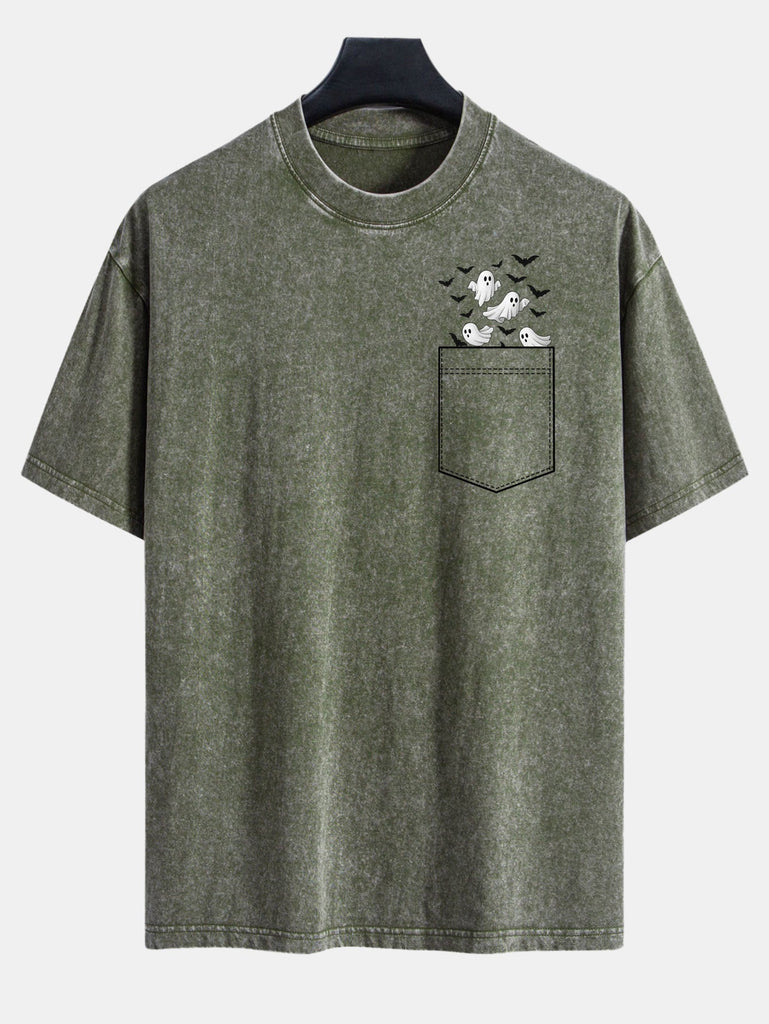 Pocket Bat Ghost Print Washed Distressed Drop Shoulder T-Shirt